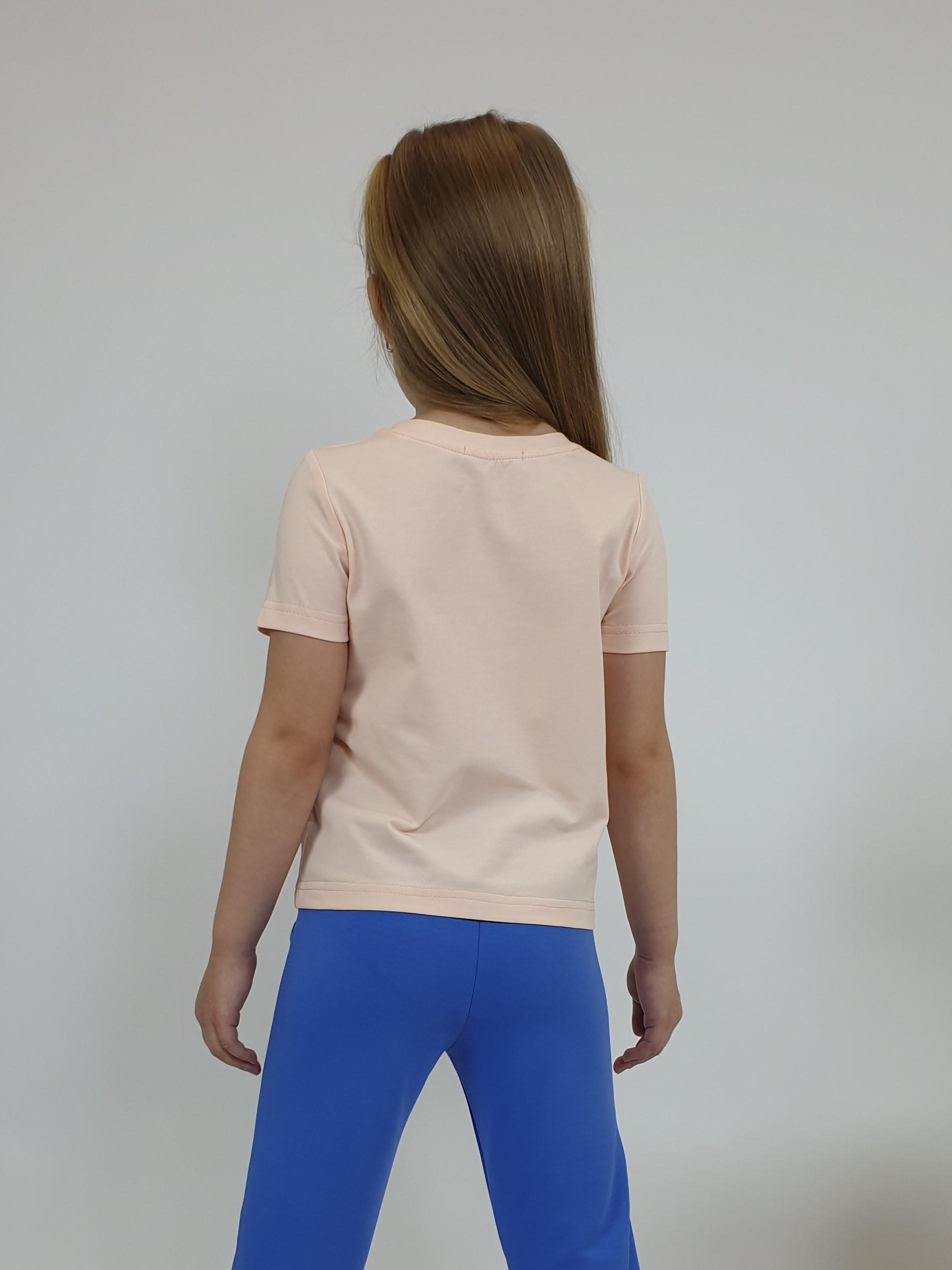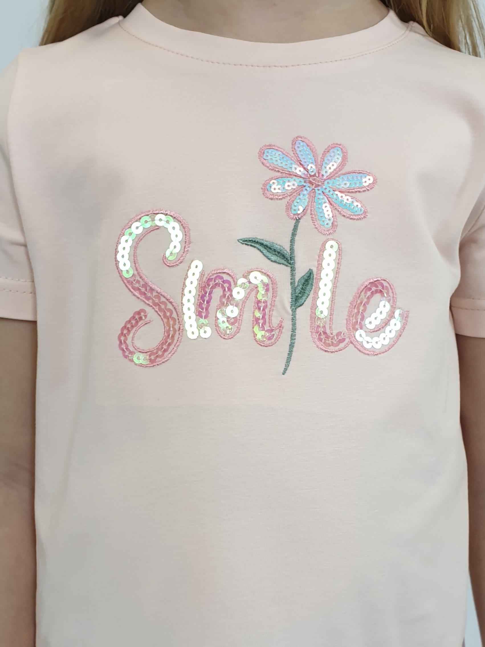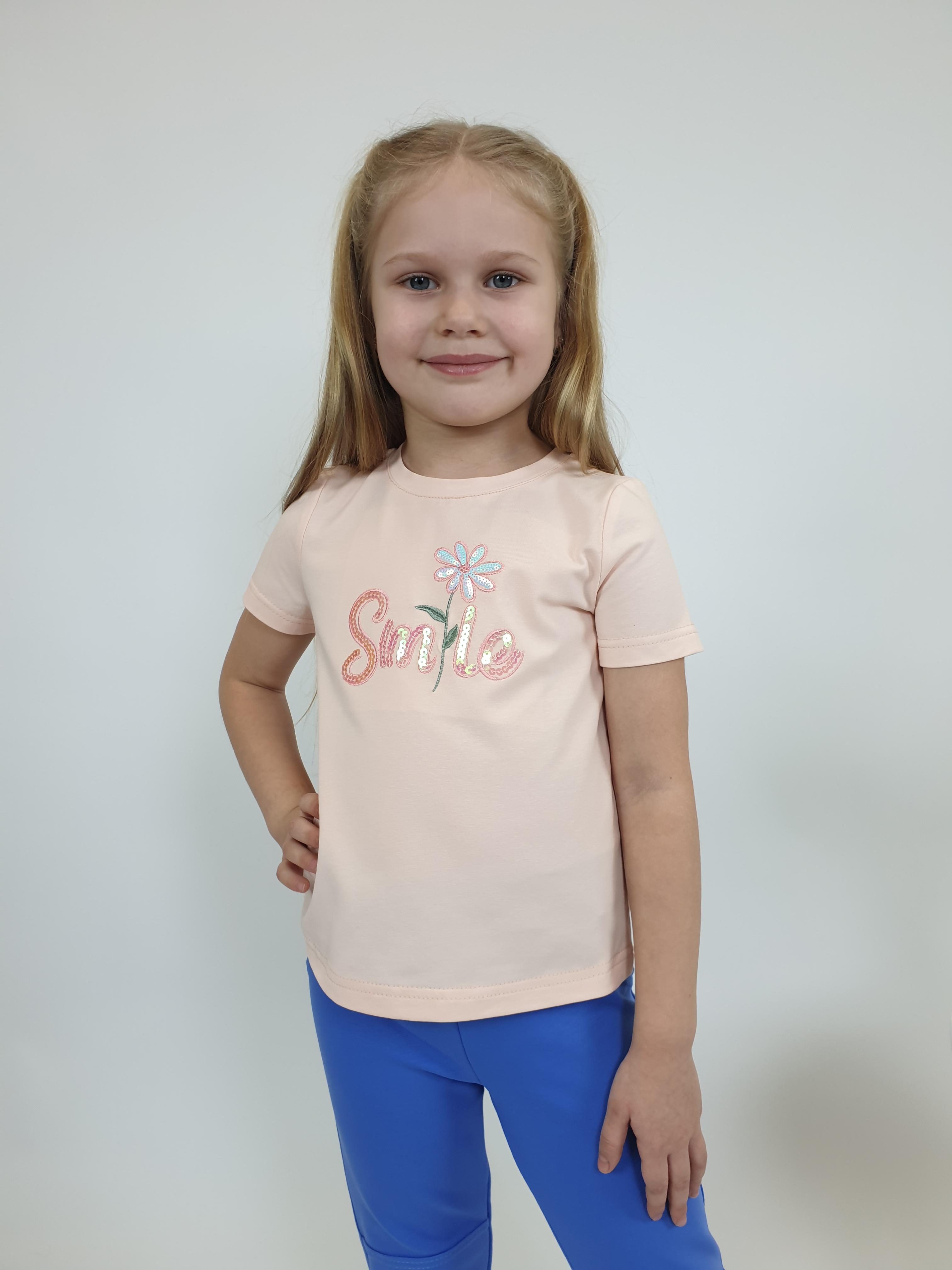 Фуфайка-прямой силуэт, печать и вышивка (пайетки) на переде, короткий втачной рукав. Низ рукава и фуфайки подшит. Горловина обработана ластиком.
