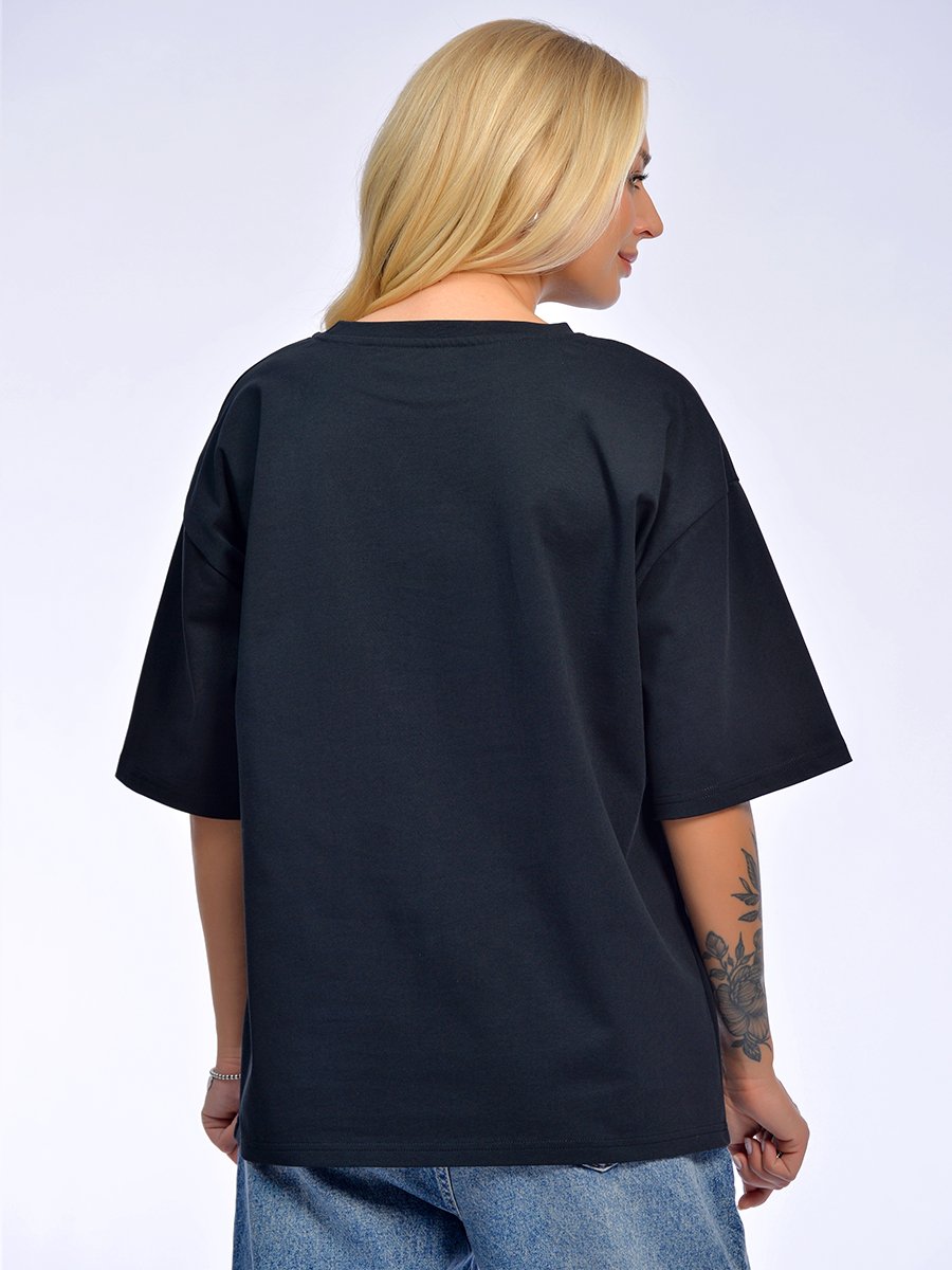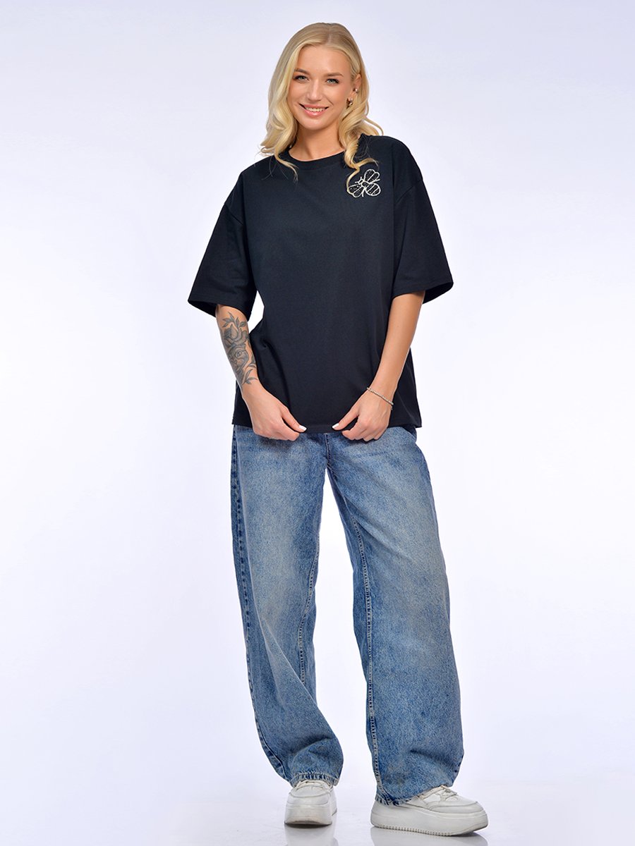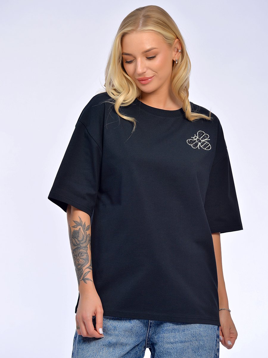 Базовая футболка из 100% хлопка с премиум декором из страз. Модель построена на контрасте: лаконичный благородный фон темный графит+ дорогой акцентный декор. Хлопок плотностью 220 гр/м2 плотный, матовый, не просвечивает и не пилингуется, отлично держит форму, выдерживает интенсивную носку и многократные стирки без потери качества. Мягкое, приятное к телу полотно с эффектом «дорогой футболки». Свободный, прямой силуэт, спущенная линия плеча, широкий комфортный рукав. Футболка украшена клеевым декором из страз на левой стороне полочки. Он работает как ювелирное украшение. Основа-черные стразы, контур- серебряные стразы, дающие холодный металлический блик. Аппликация выполнена по технологии, устойчивой к деликатной стирке. Универсальная вещь, которая одинаково органично смотрится с джинсами, костюмными брюками и юбками. Для дам, которые выбирают «тихую роскошь» без кричащих принтов.