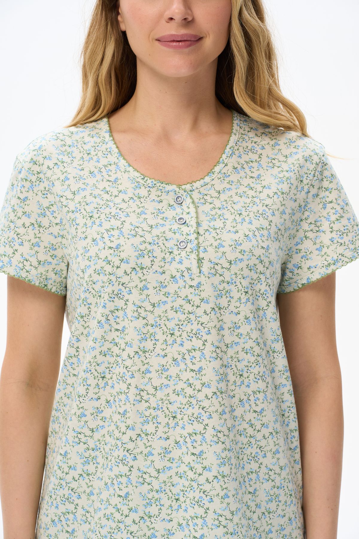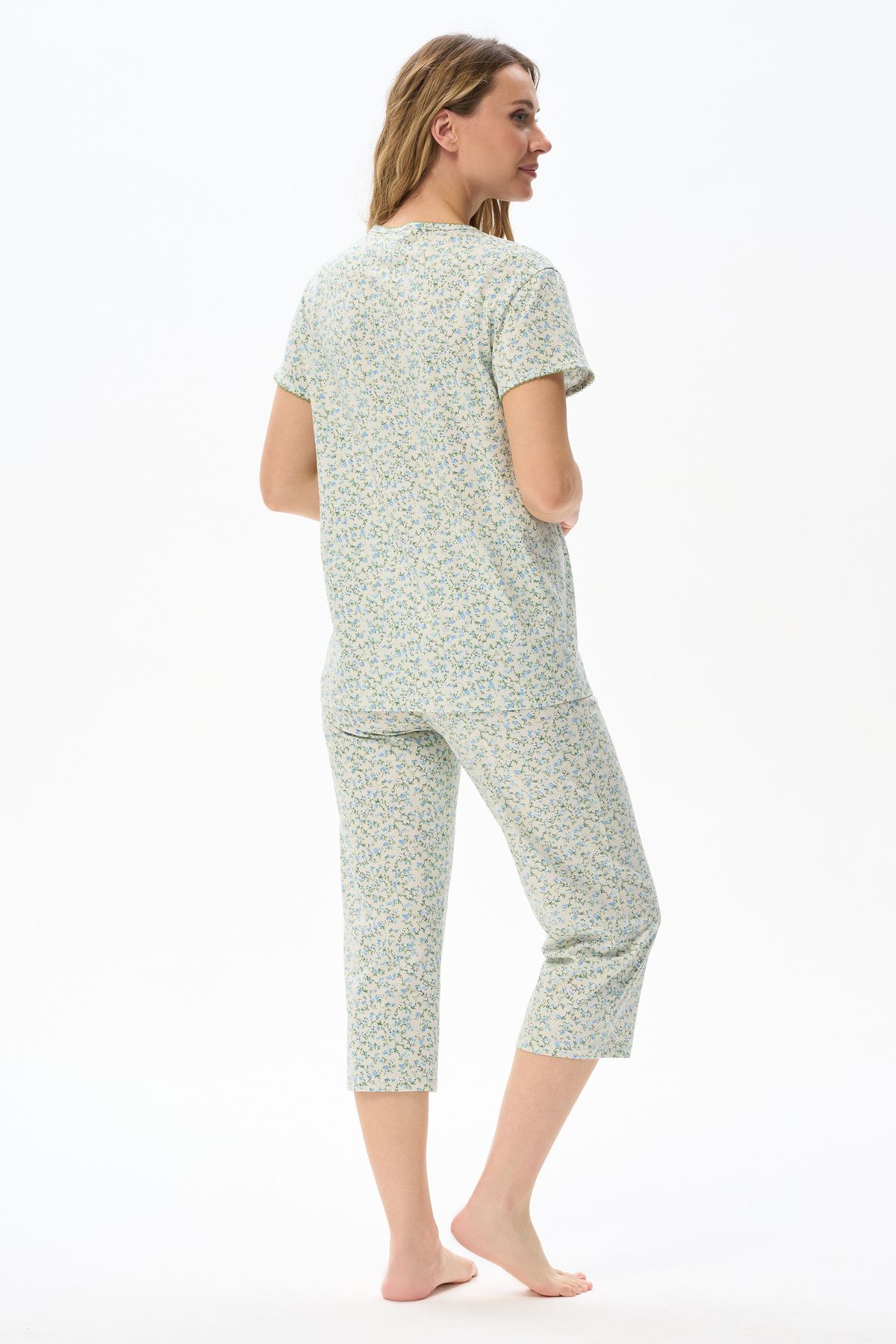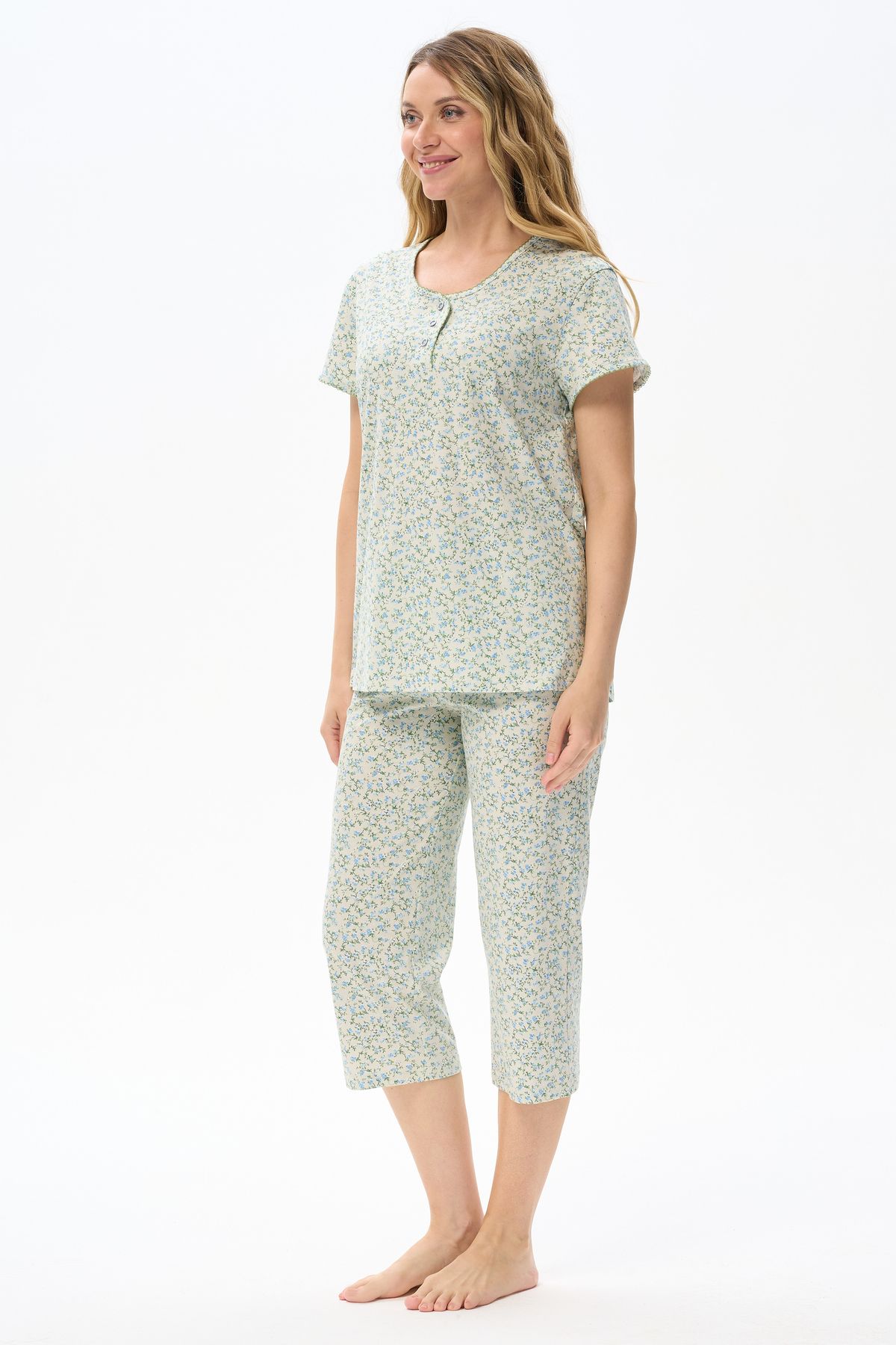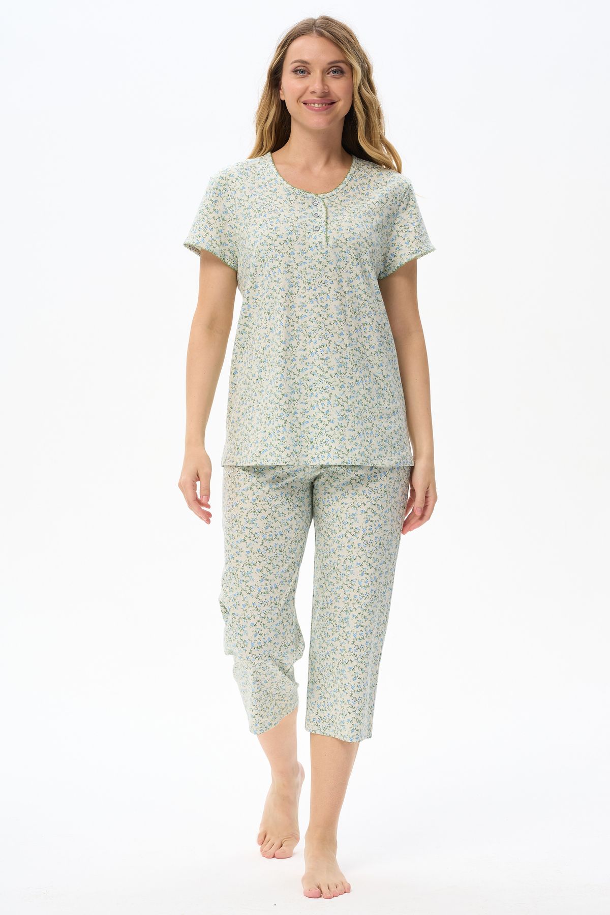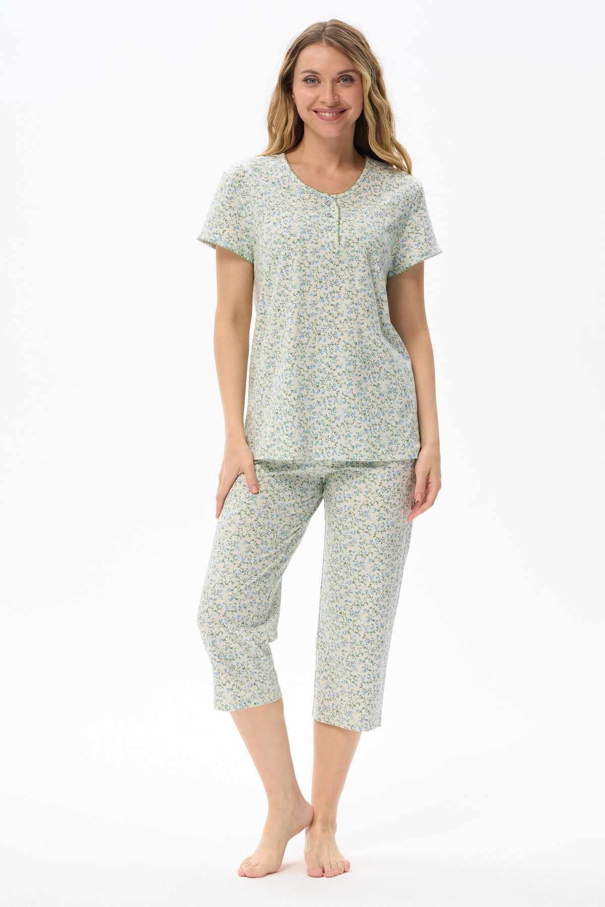 Описание: Пижама из хлопкового полотна. Верх свободного силуэта, круглый вырез горловины с застежкой на пуговицы, втачные короткие рукава. Вырез горловины и низ рукавов декорированы фестонами контрастного цвета. Прямые бриджи, пояс на резинке. Рост модели на фото 175см