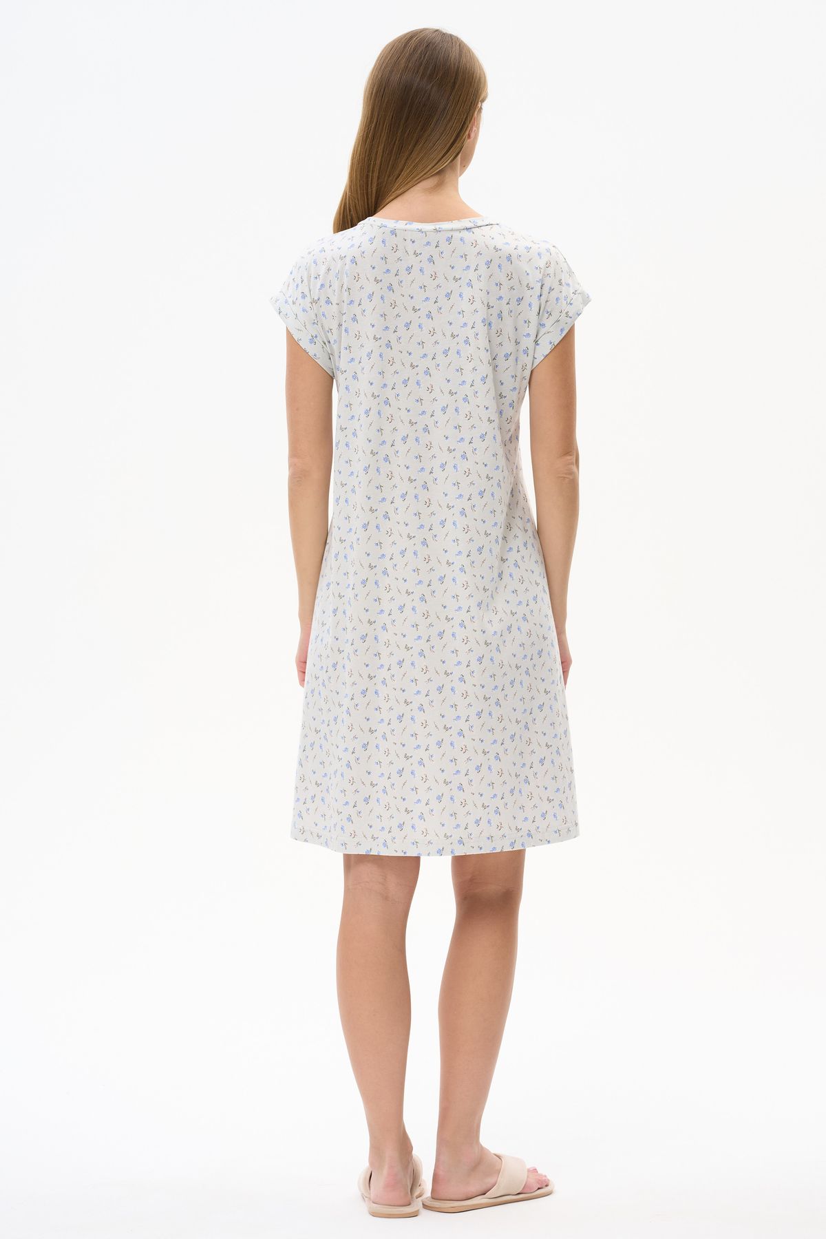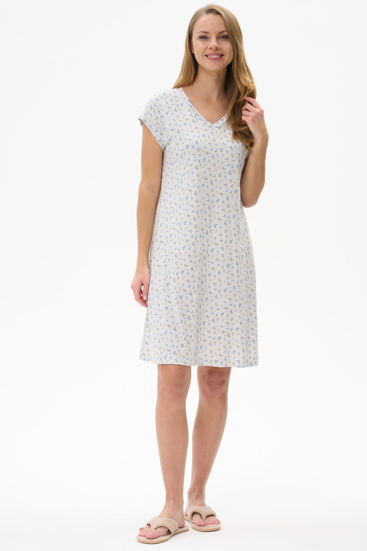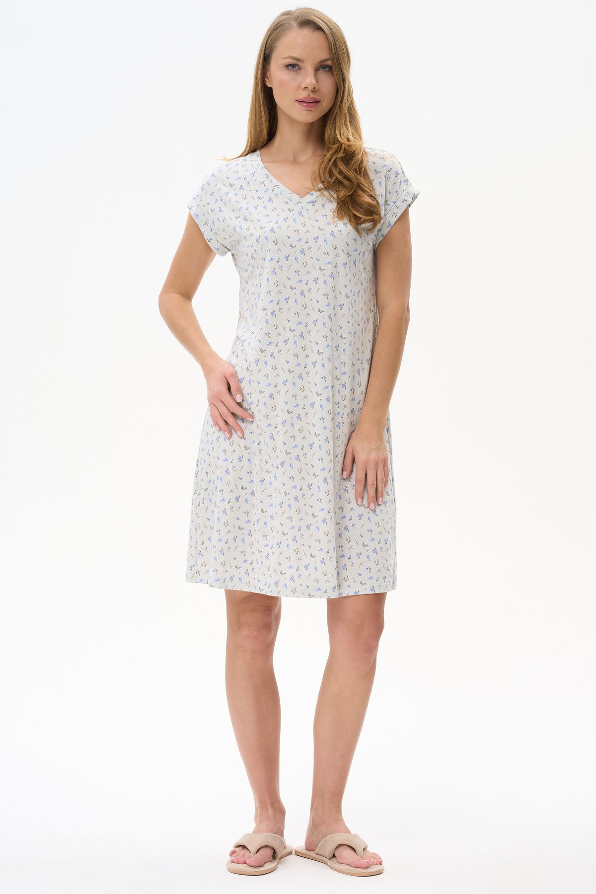 Описание: Ночная сорочка А-образного силуэта выполнена из хлопкового полотна с вискозой. Красивый V-образный вырез горловины. Цельнокроенные короткие рукава с притачными манжетами. Длина изделия чуть ниже колена. Рост модели на фото 177.