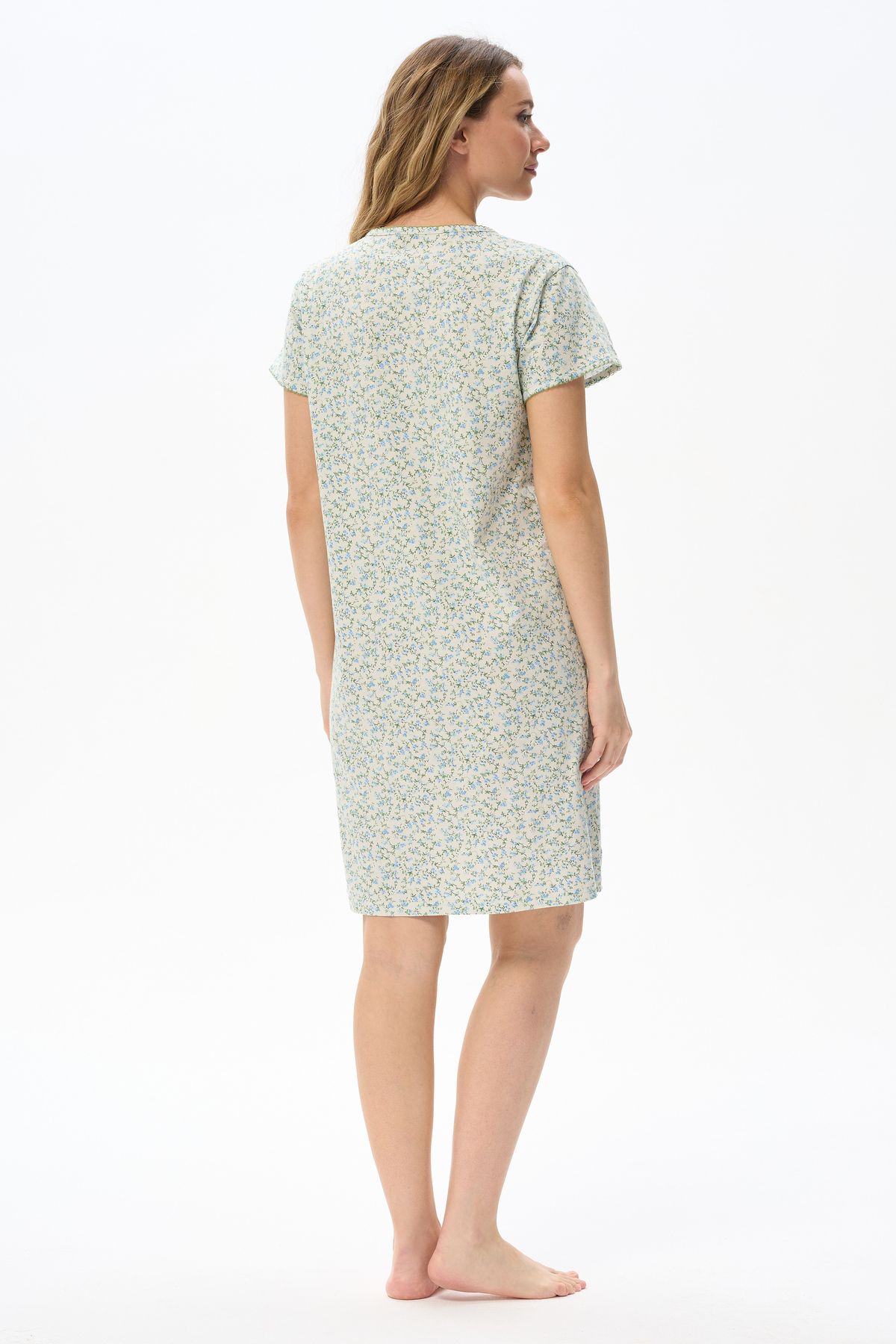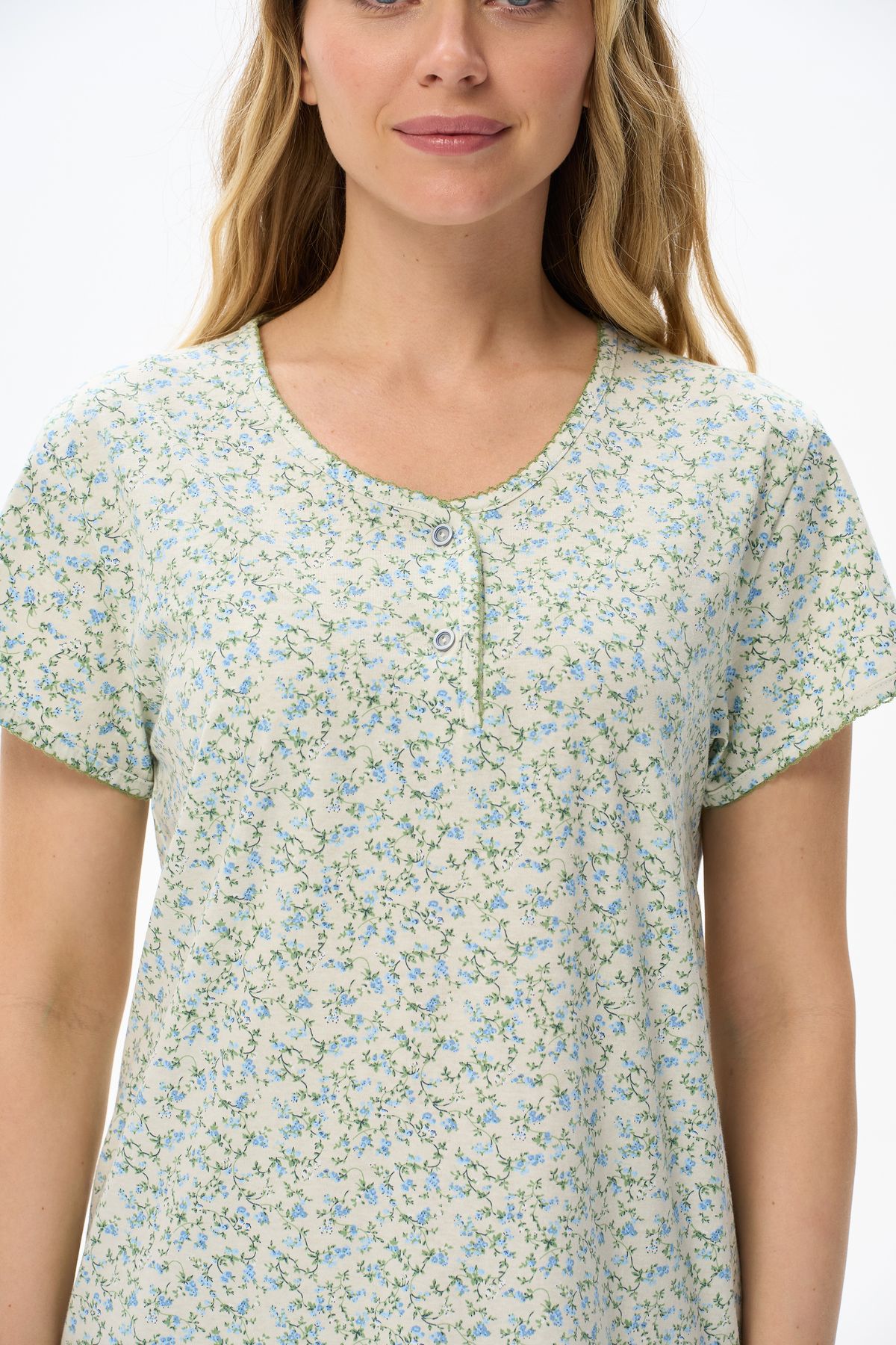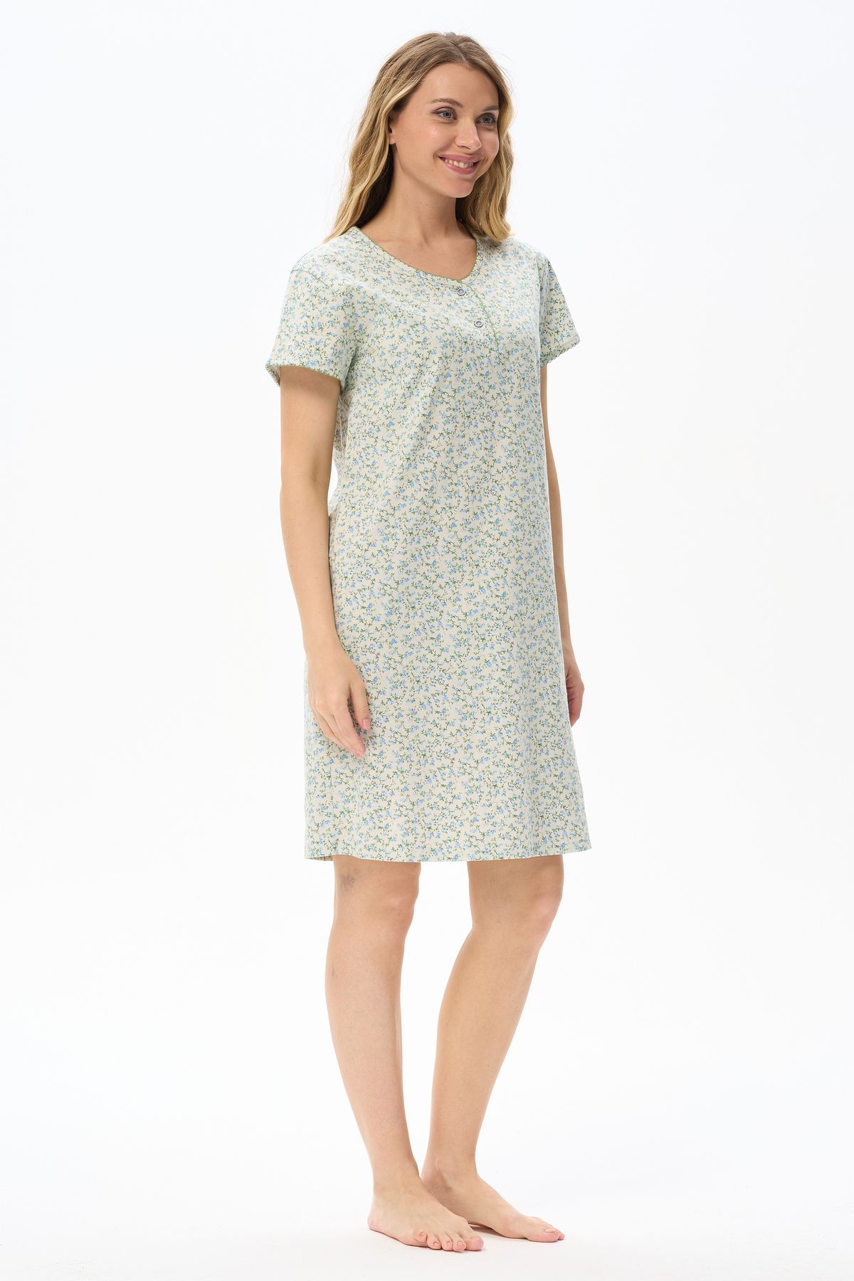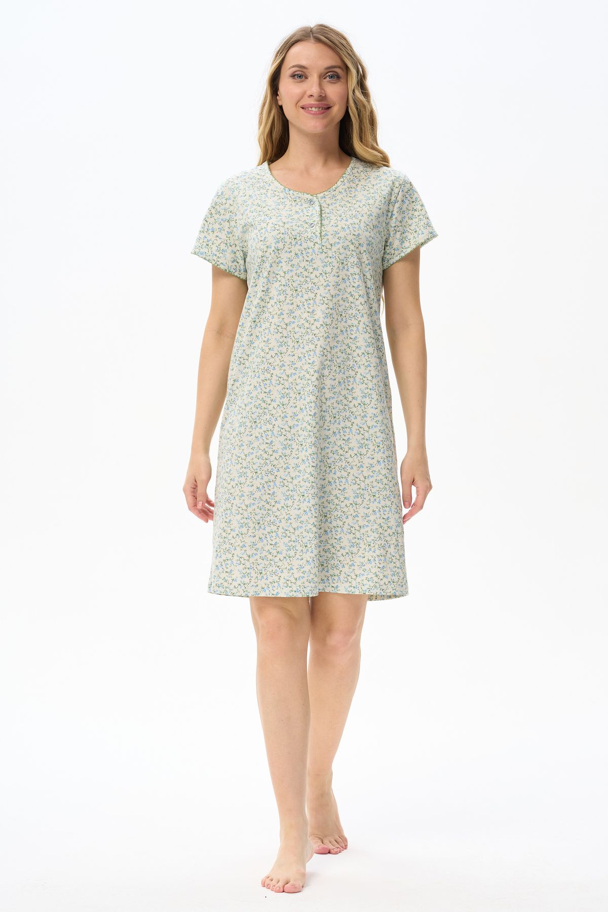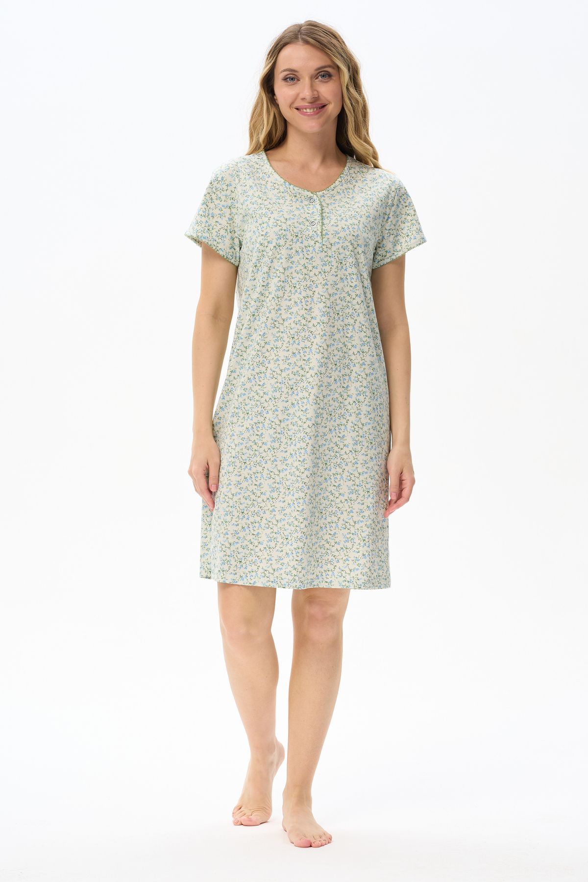 Описание: Ночная сорочка А-силуэта из хлопкового полотна. Круглый вырез горловины с застежкой на пуговицы. Втачные короткие рукава. Вырез горловины и низ рукавов декорированы фестонами, контрастного цвета. Длина изделия чуть ниже колена. Рост модели на фото 175см.