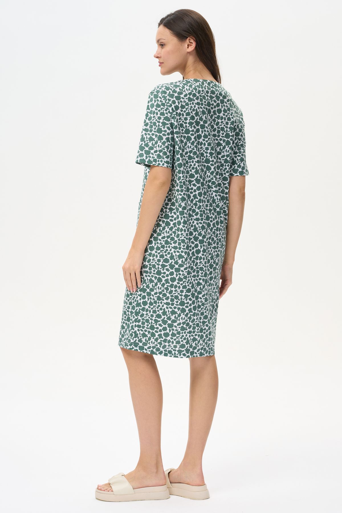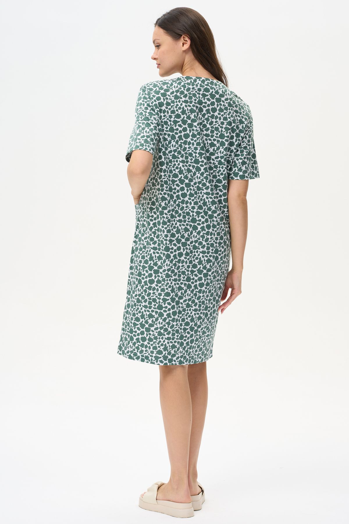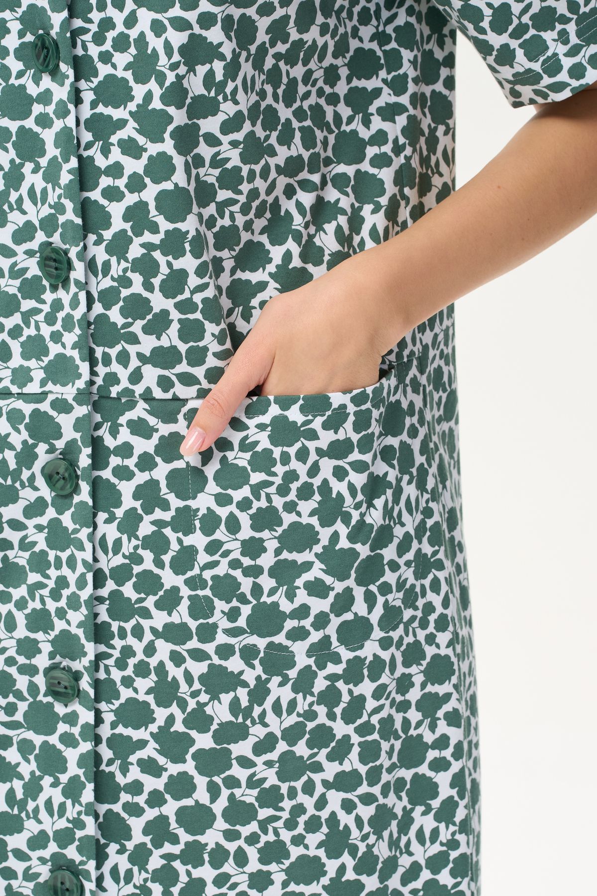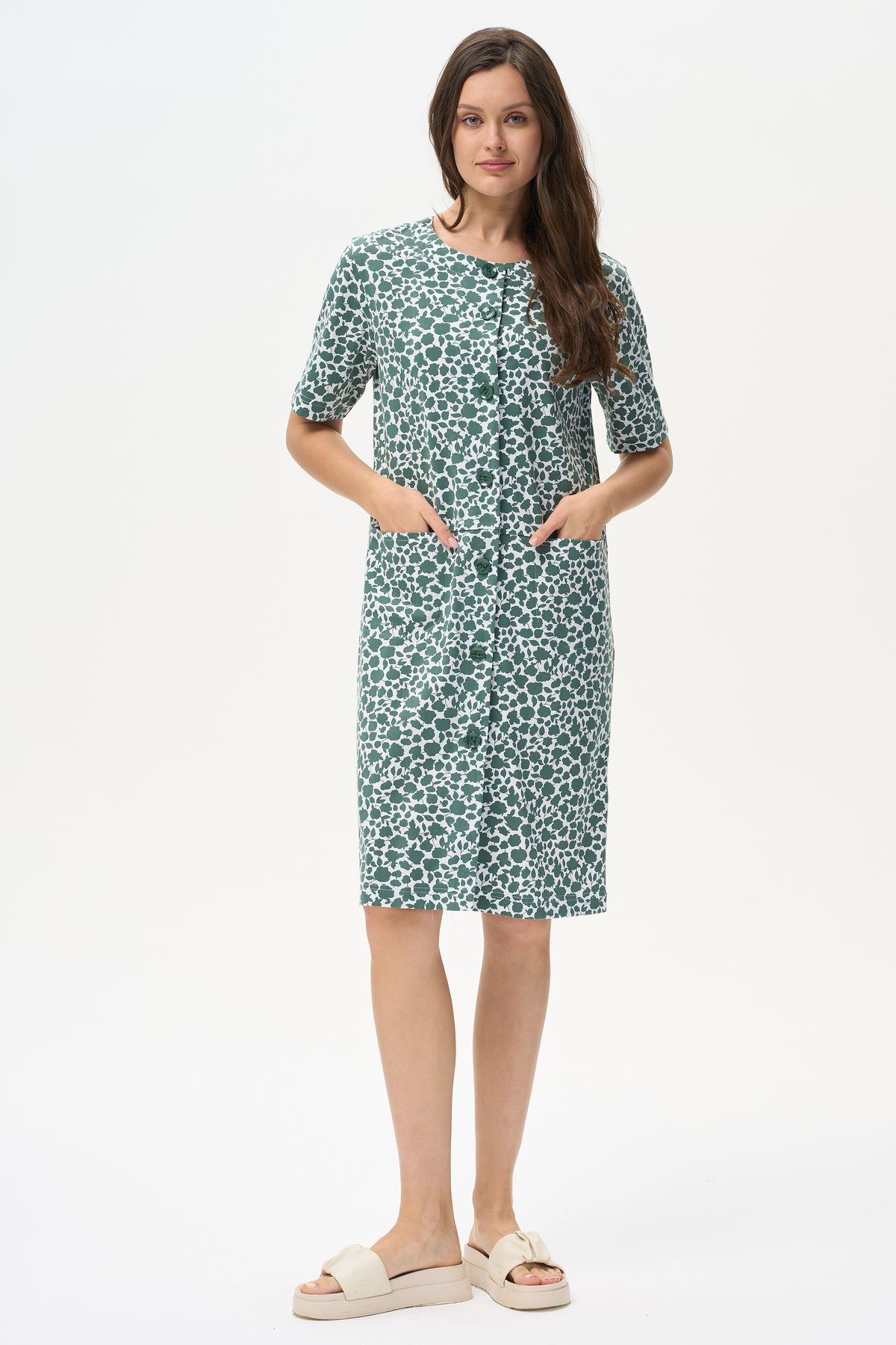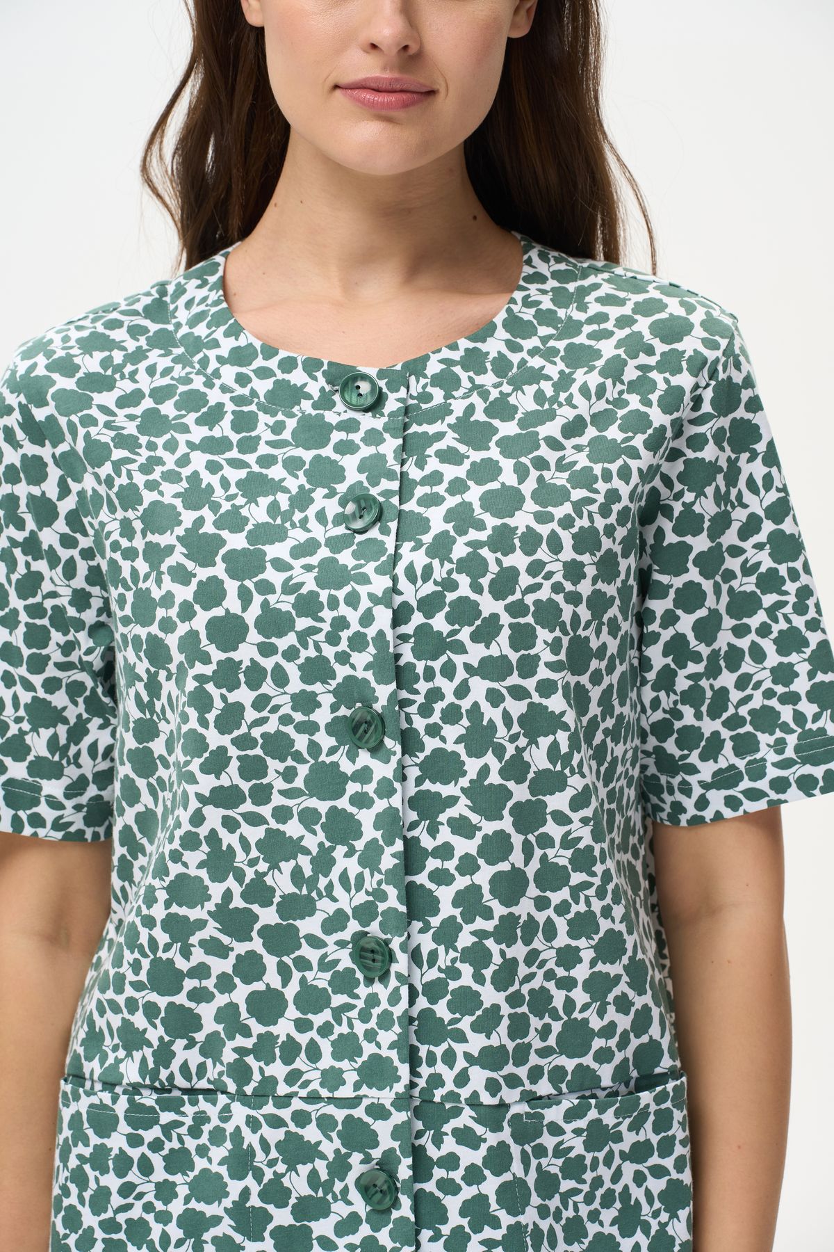 Описание: Халат прямого силуэта из хлопкового трикотажного полотна. Круглый вырез горловины, центральная застежка на пуговицы, В подрезах полочки карманы. Короткие втачные рукава. Длина изделия чуть ниже колена. Рост модели на фото 178.