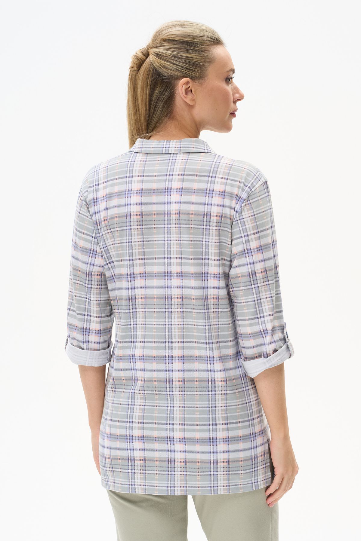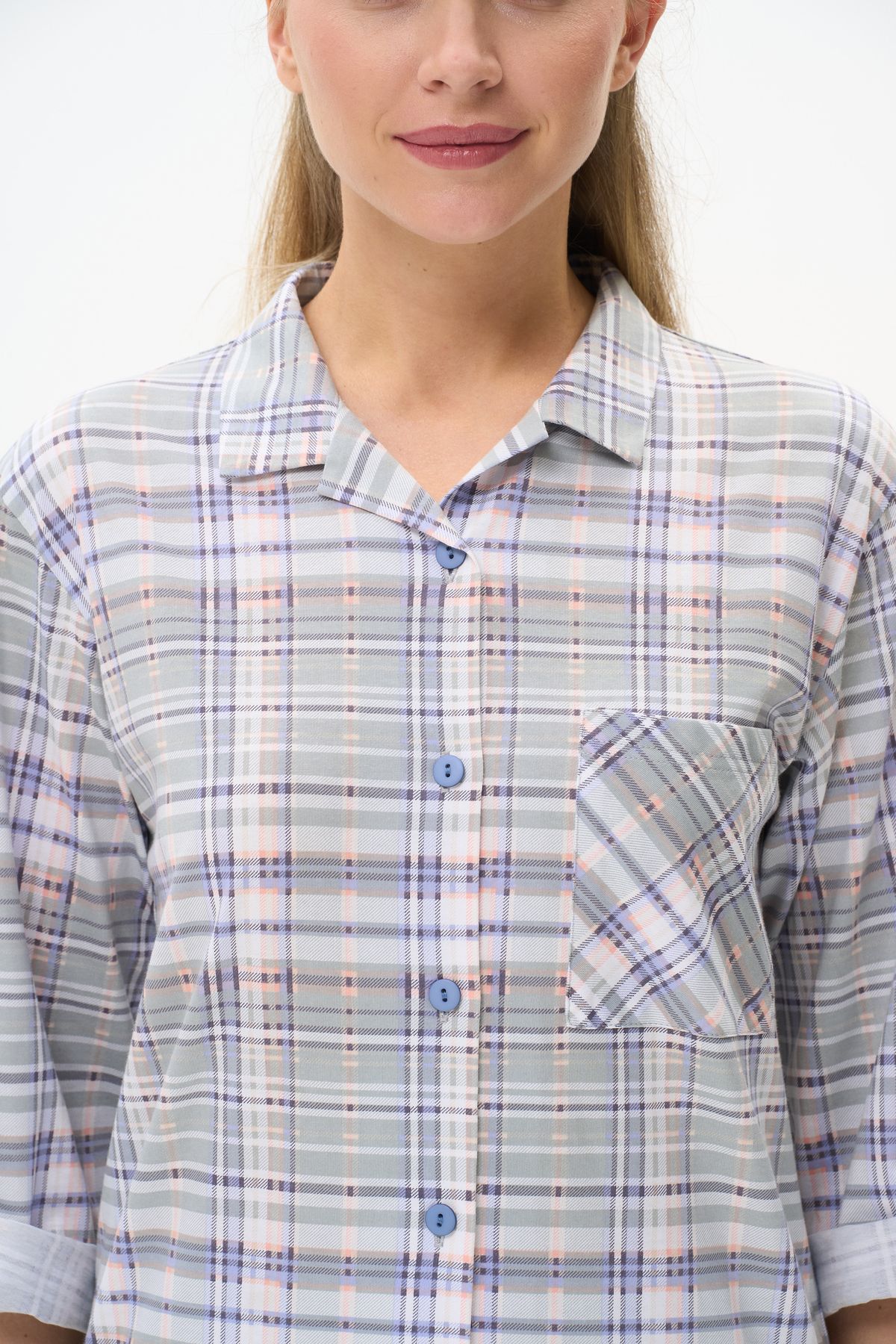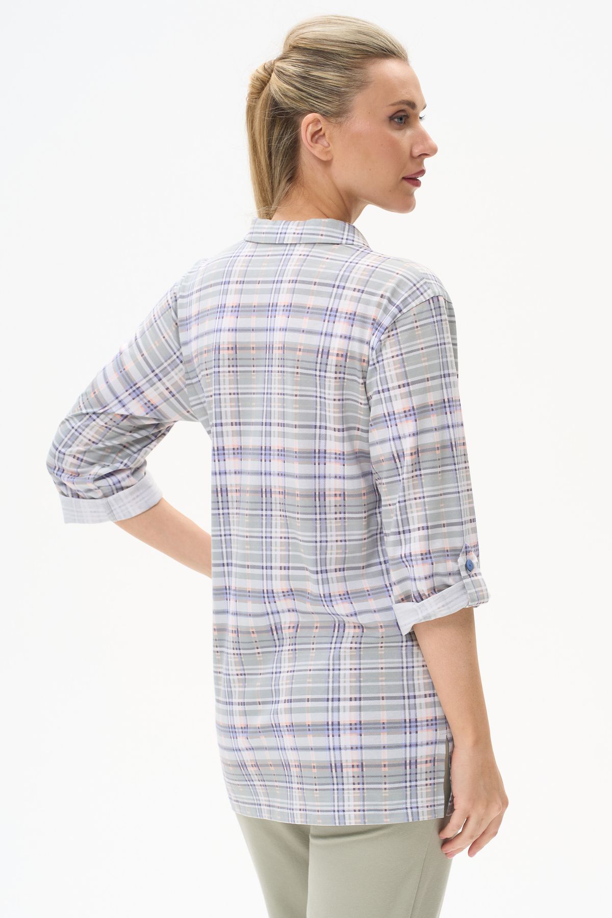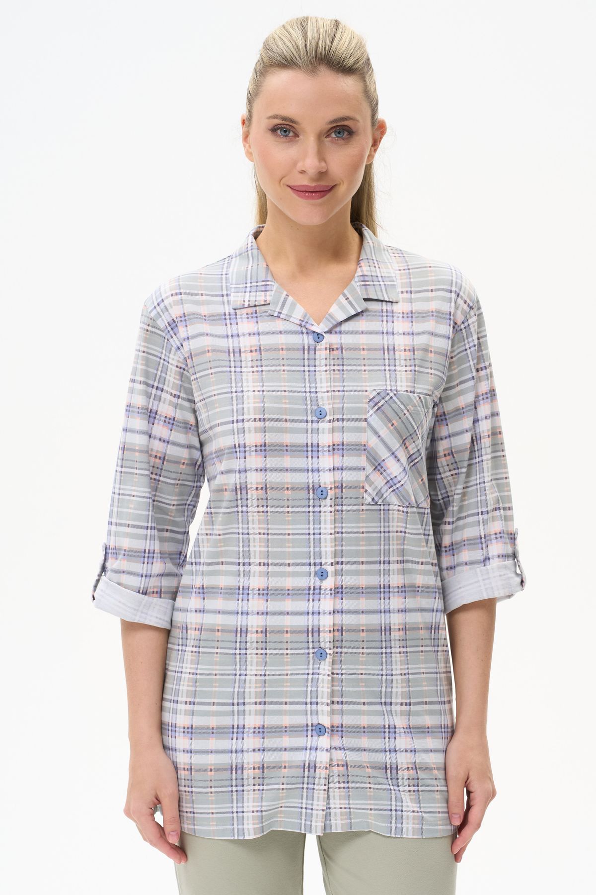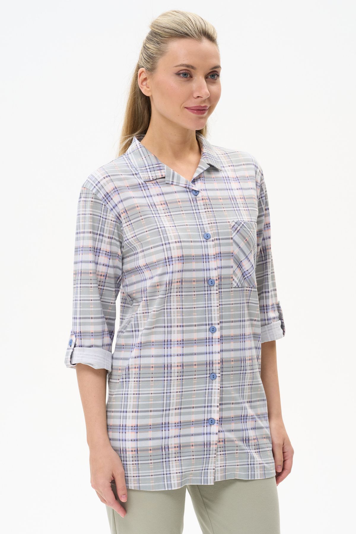 Описание: Рубашка прямого силуэта с отложным воротником из хлопкового полотна. Застежка на пуговицы. Накладной карман, по низу разрезы в боковых швах. Втачные рукава 3/4 с патами и пуговицами. Рост модели на фото 175.