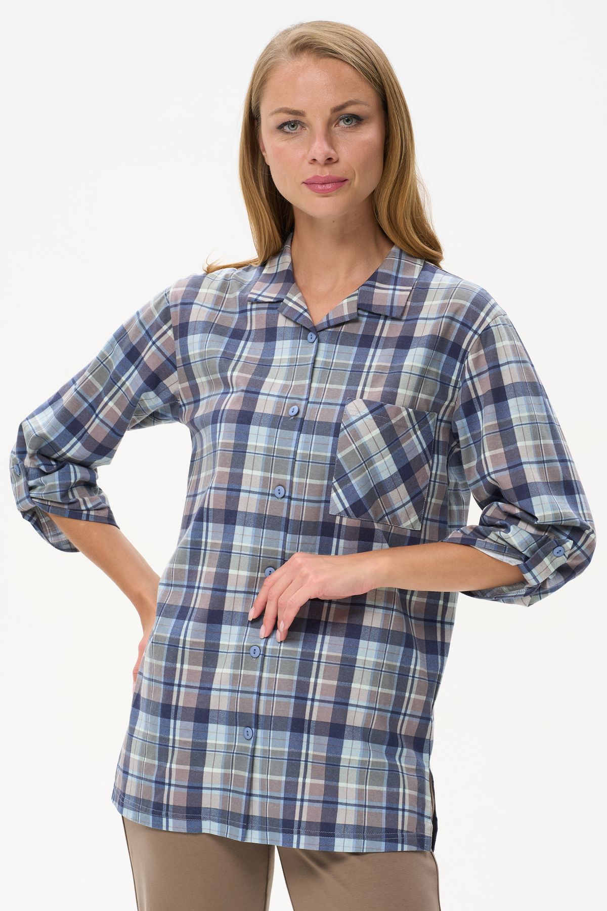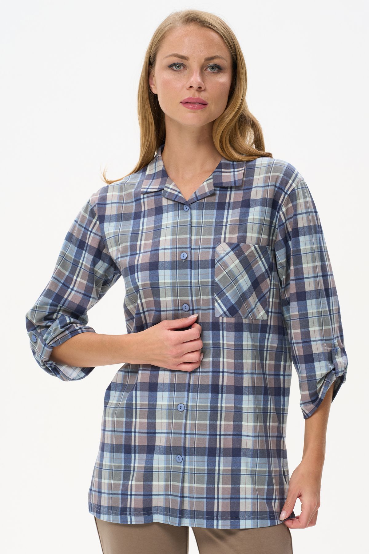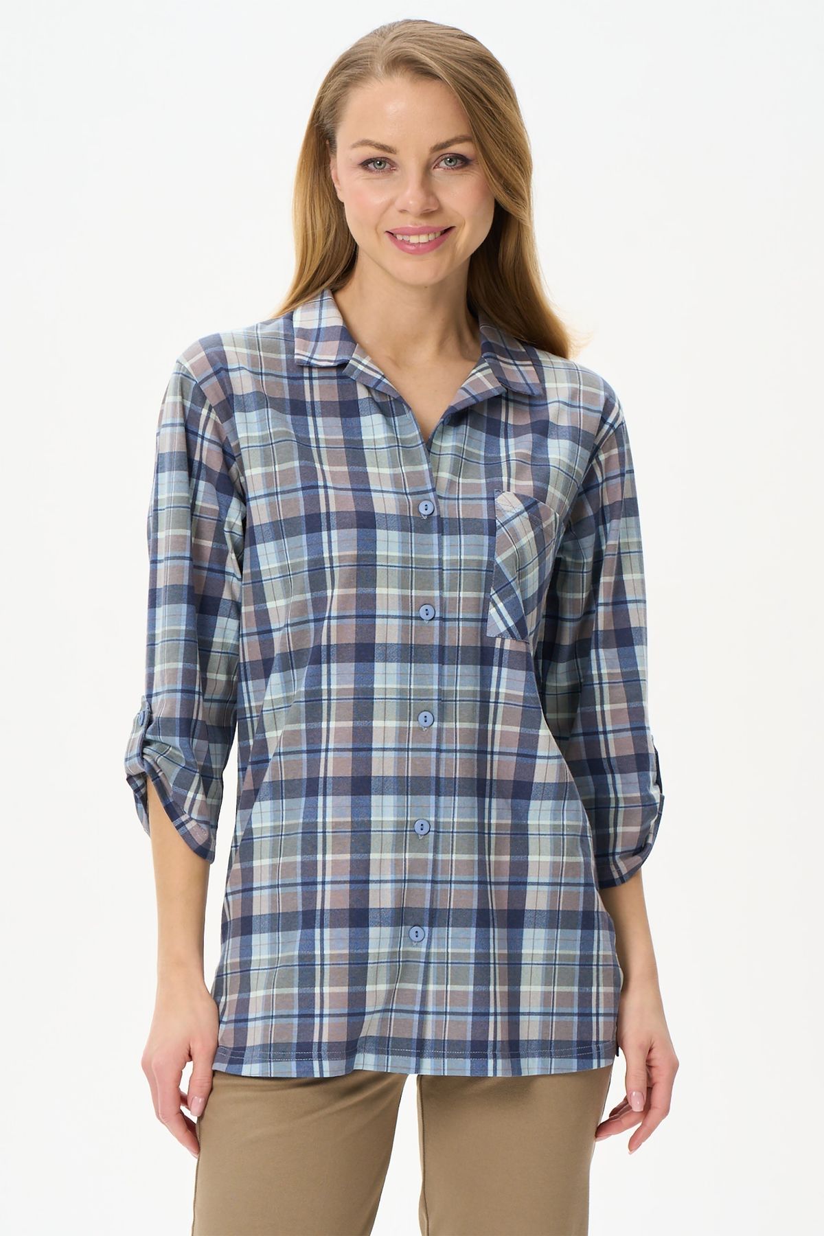 Описание: Рубашка прямого силуэта с отложным воротником из хлопкового полотна. Застежка на пуговицы. Накладной карман, по низу разрезы в боковых швах. Втачные рукава 3/4 с патами и пуговицами. Рост модели на фото 175.