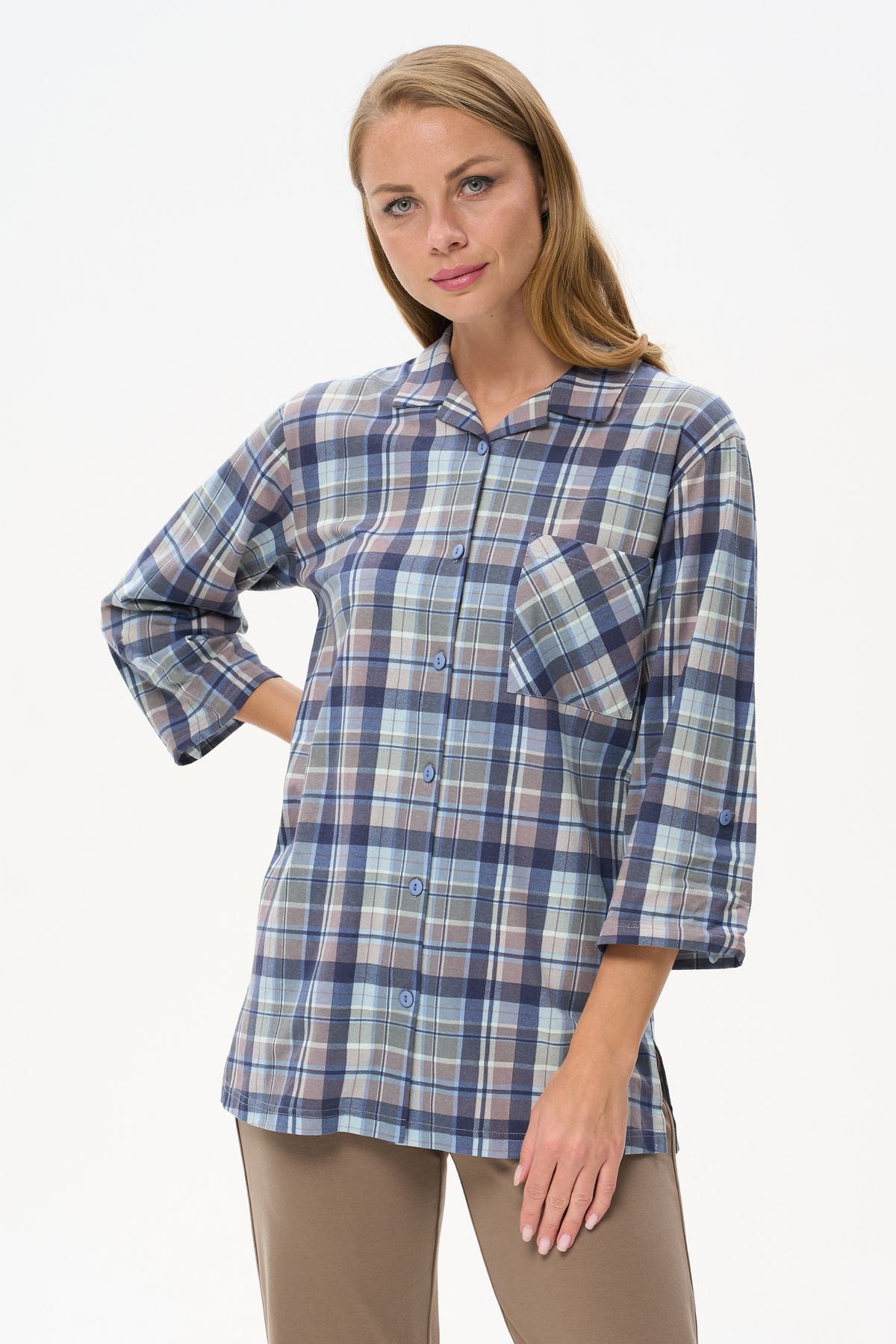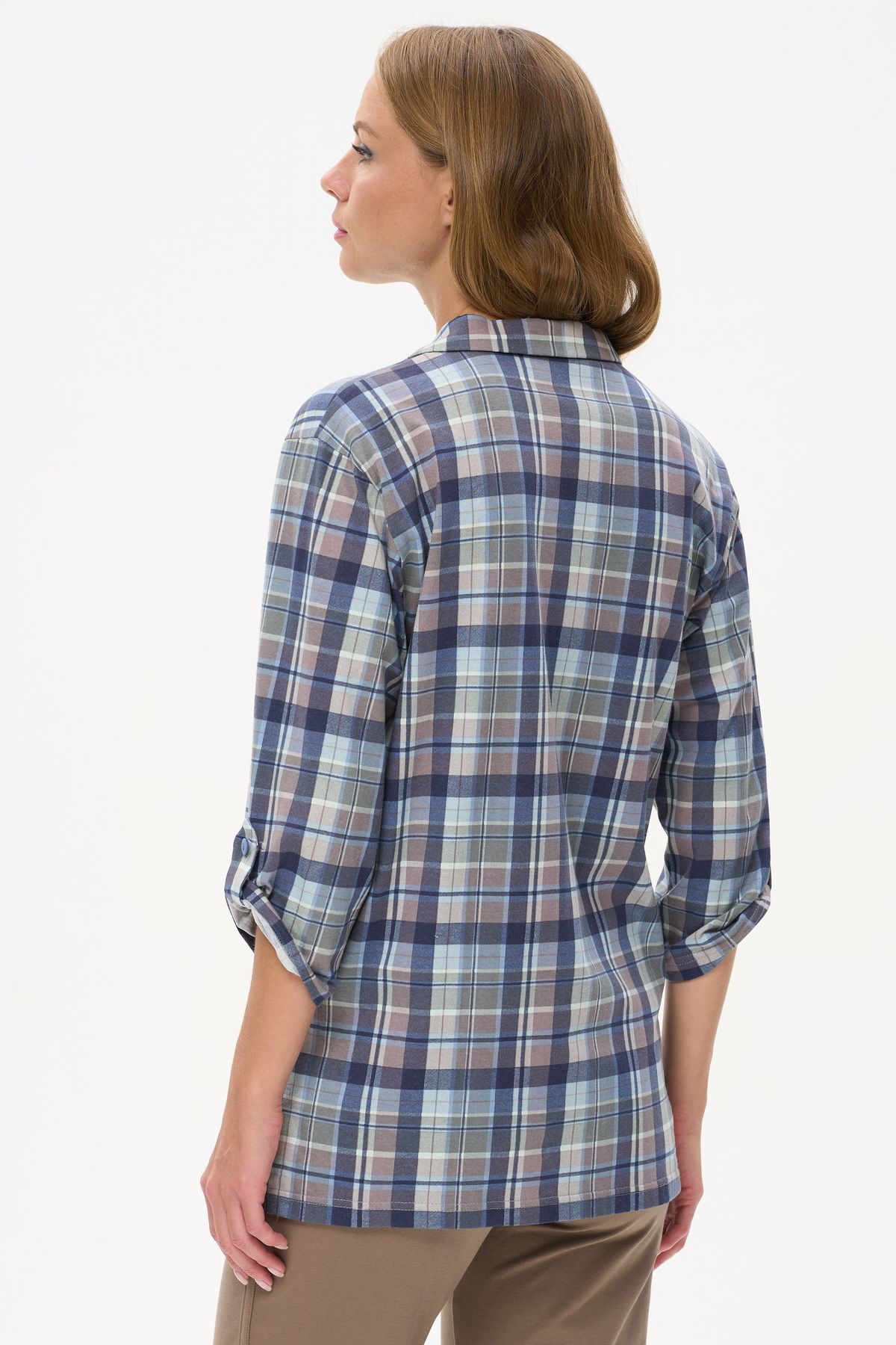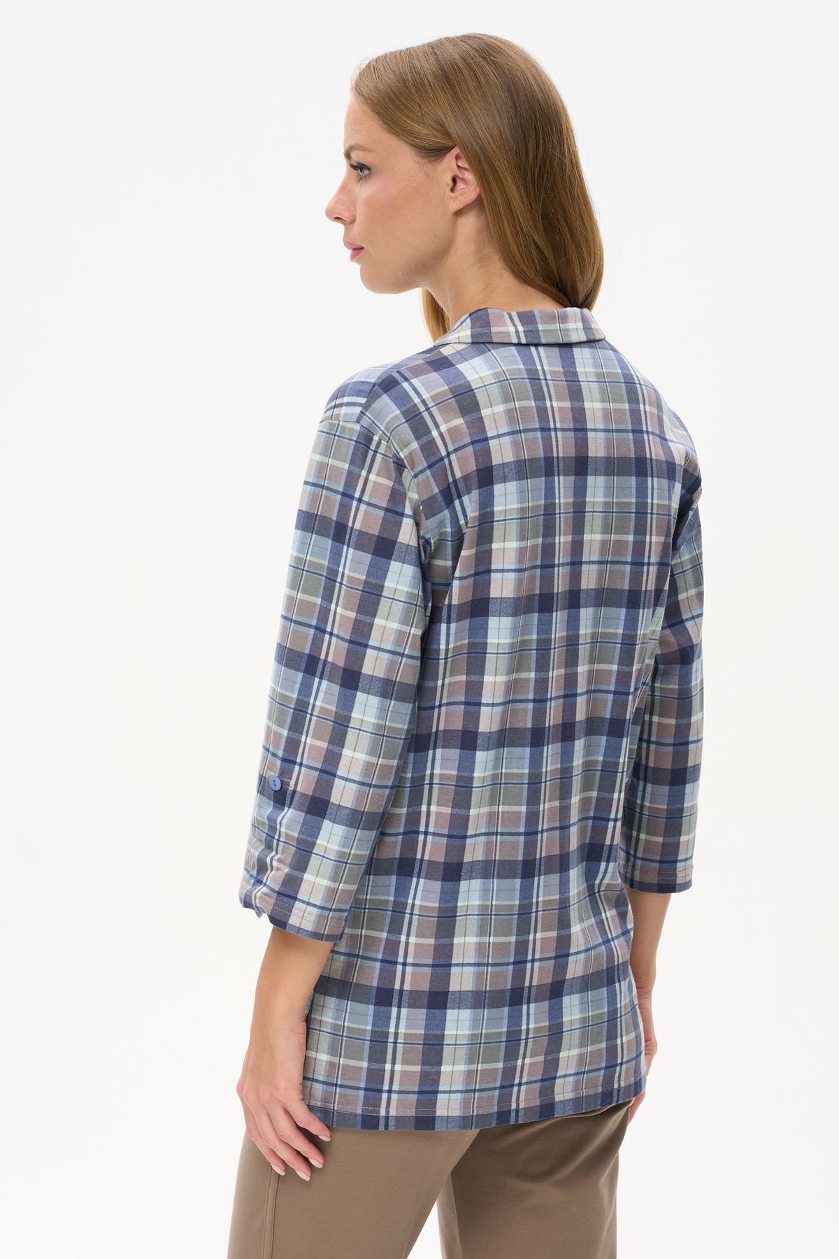 Описание: Рубашка прямого силуэта с отложным воротником из хлопкового полотна. Застежка на пуговицы. Накладной карман, по низу разрезы в боковых швах. Втачные рукава 3/4 с патами и пуговицами. Рост модели на фото 175.