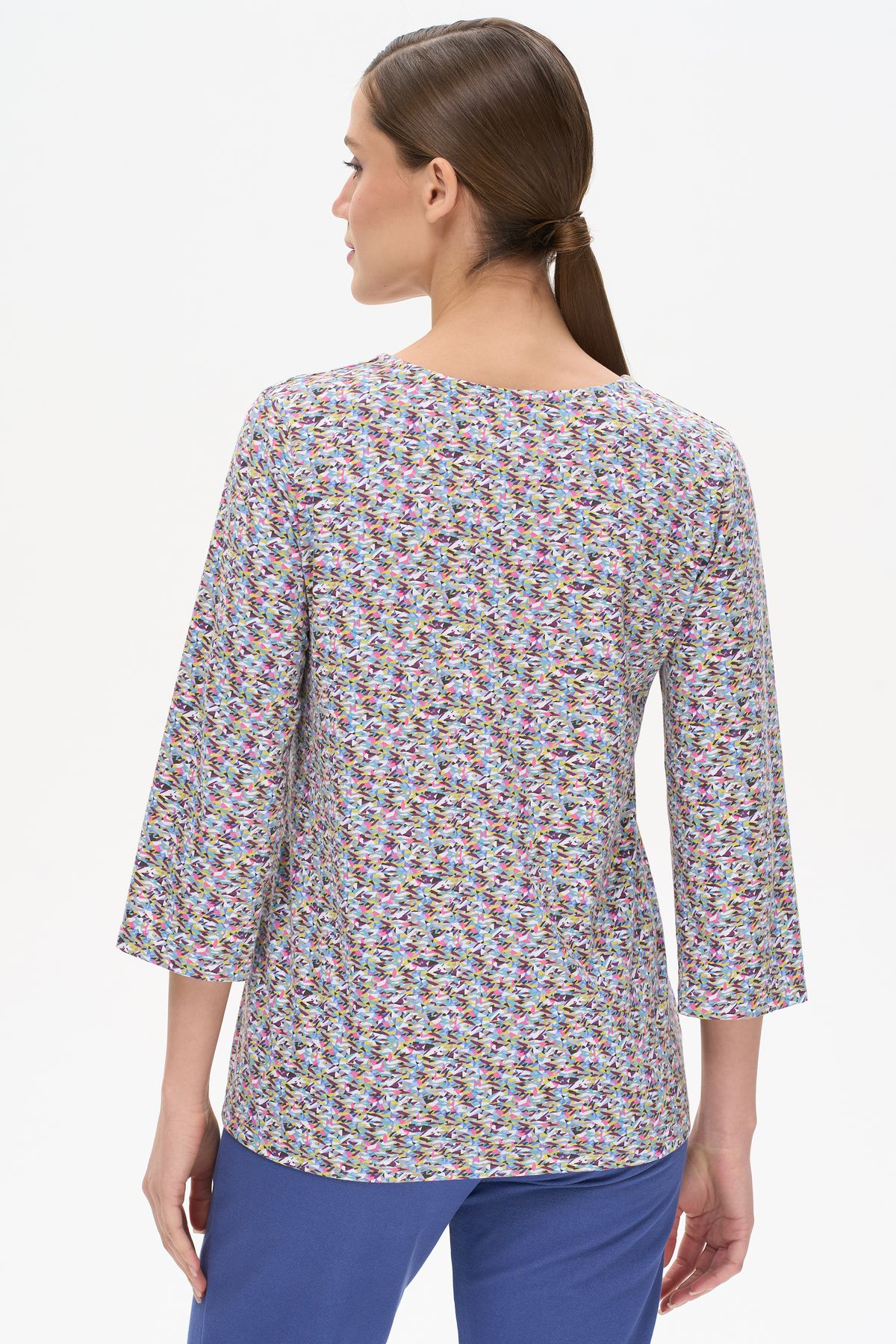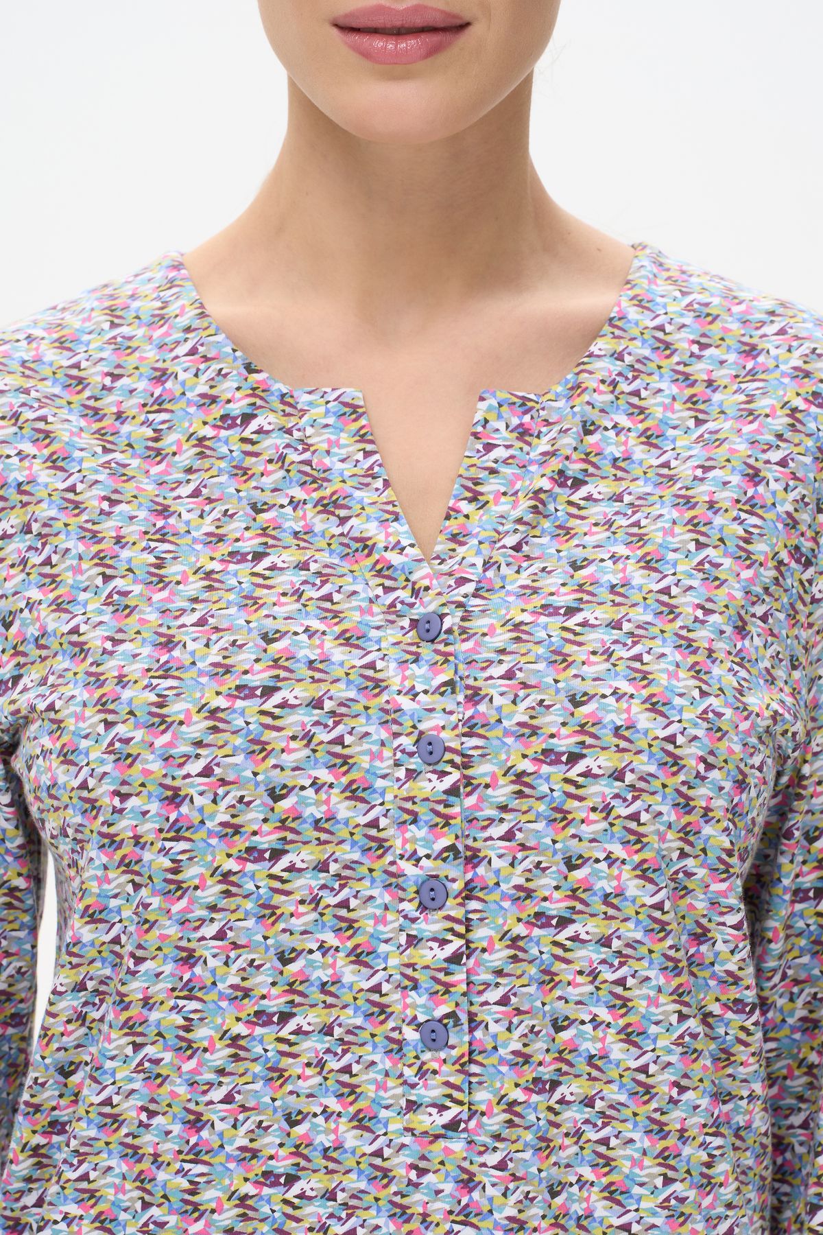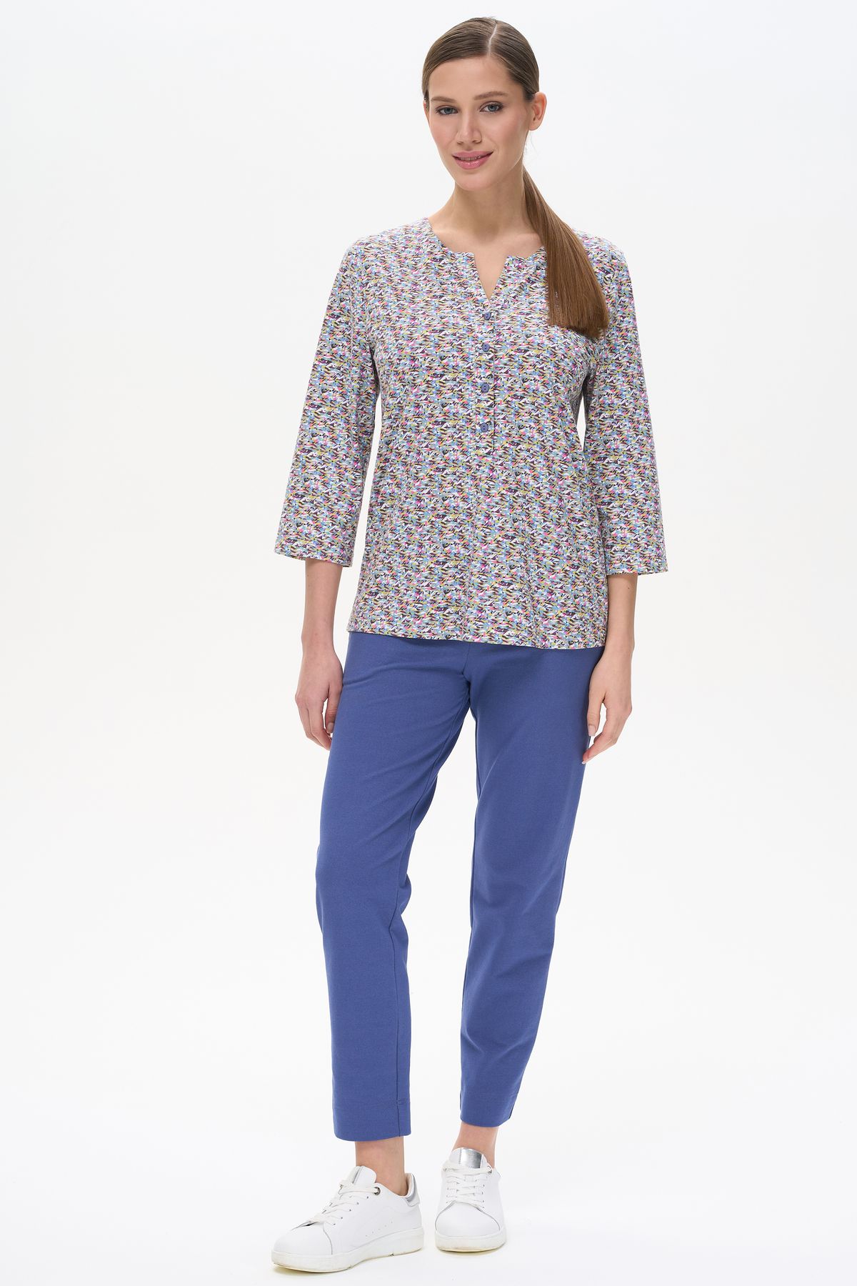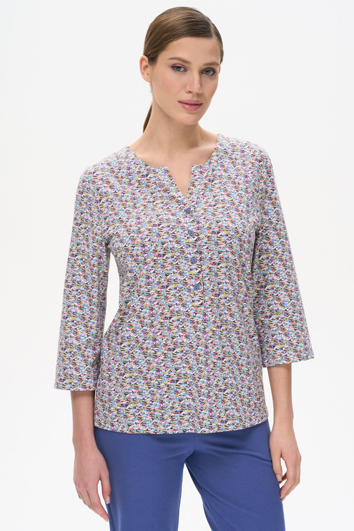 Описание: Блузка прямого силуэта из хлопкового трикотажного полотна. Круглый вырез горловины с планкой-застежкой на четыре пуговицы. Рукава длиной 3/4. Рост модели на фото 178 см.