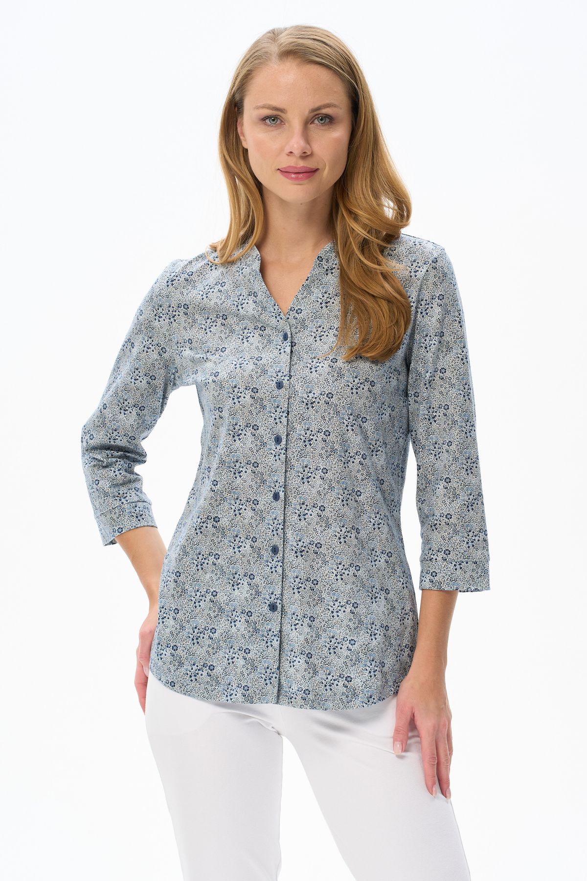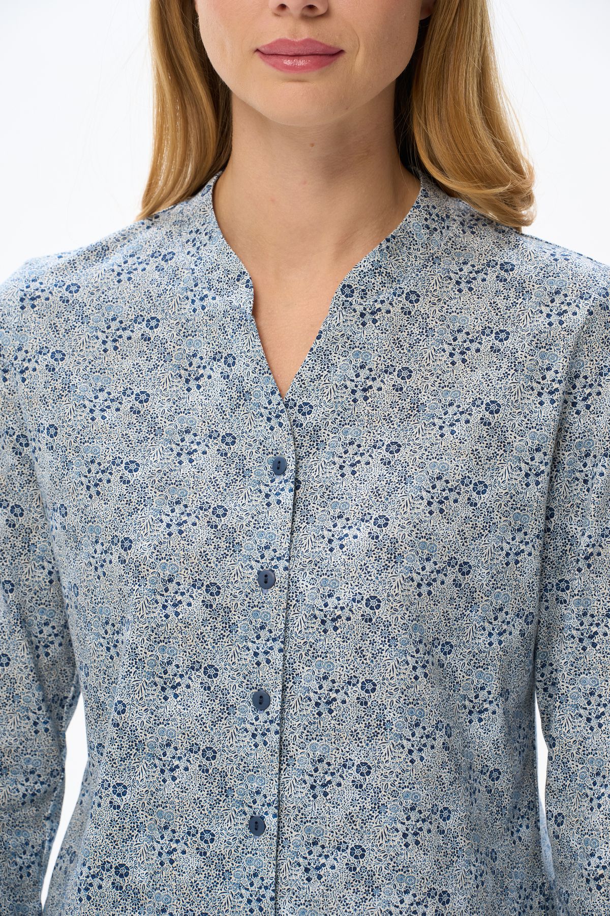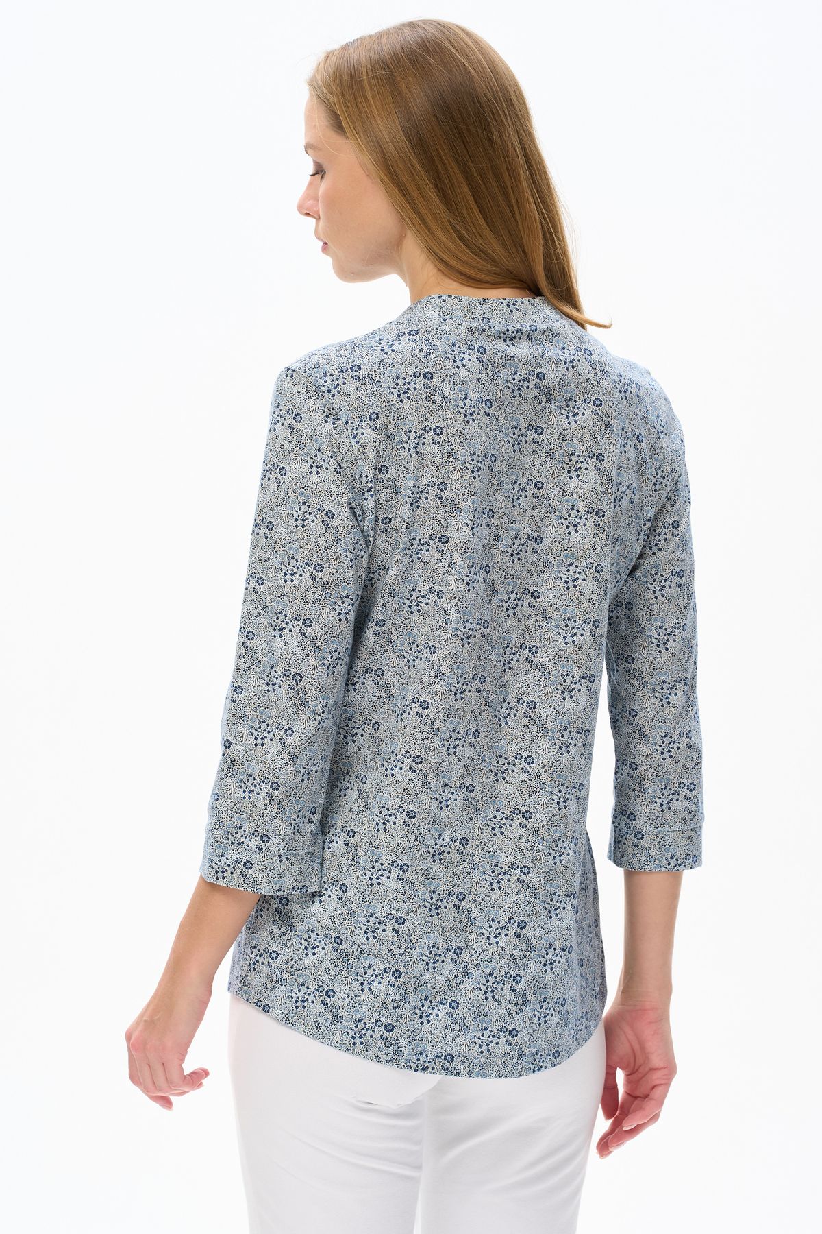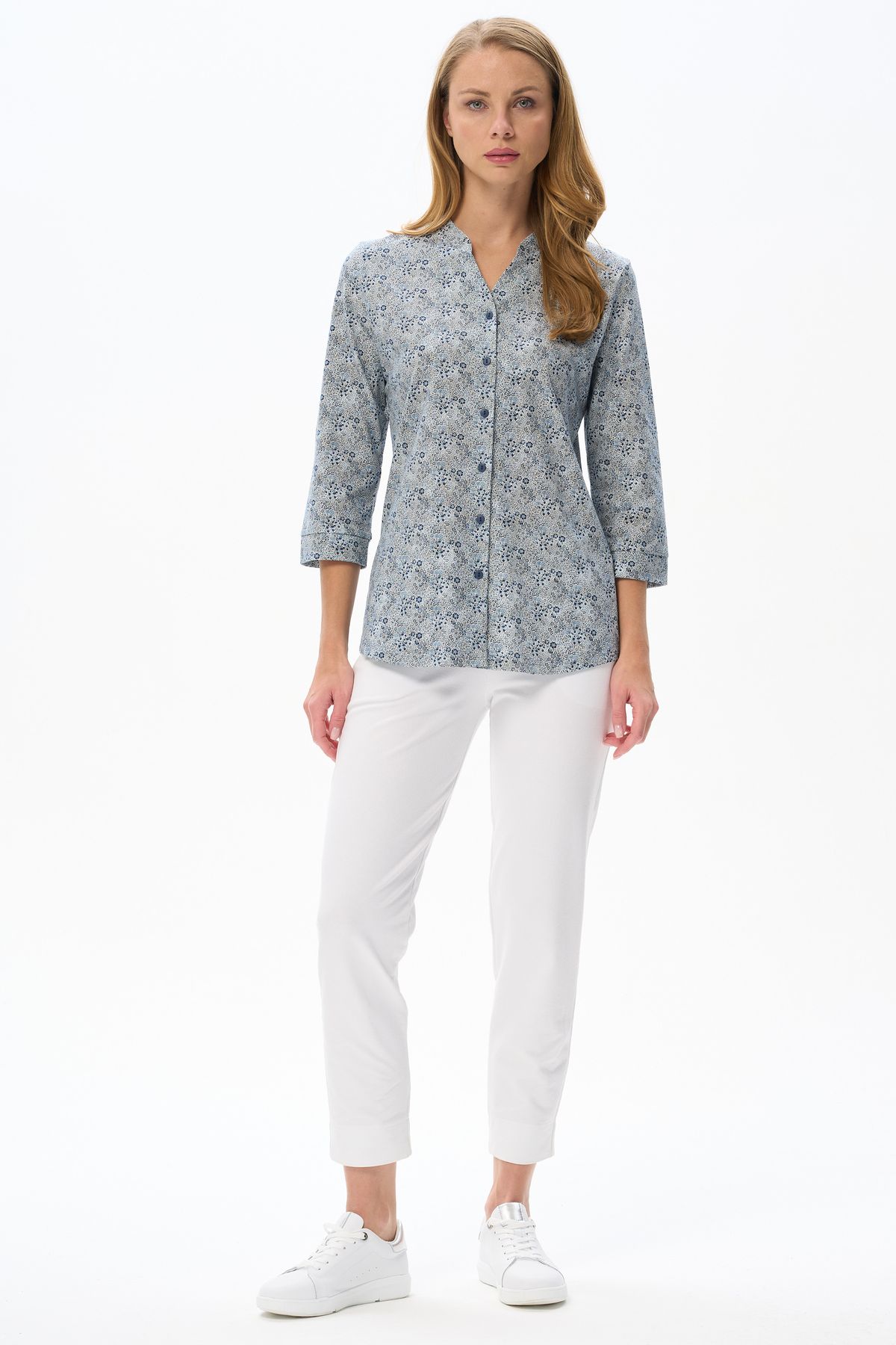 Описание: Блузка прямого силуэта из хлопкового полотна. Воротник стойка, застежка на пуговицы. Втачной рукав 7/8 . Рост модели на фото 178см.