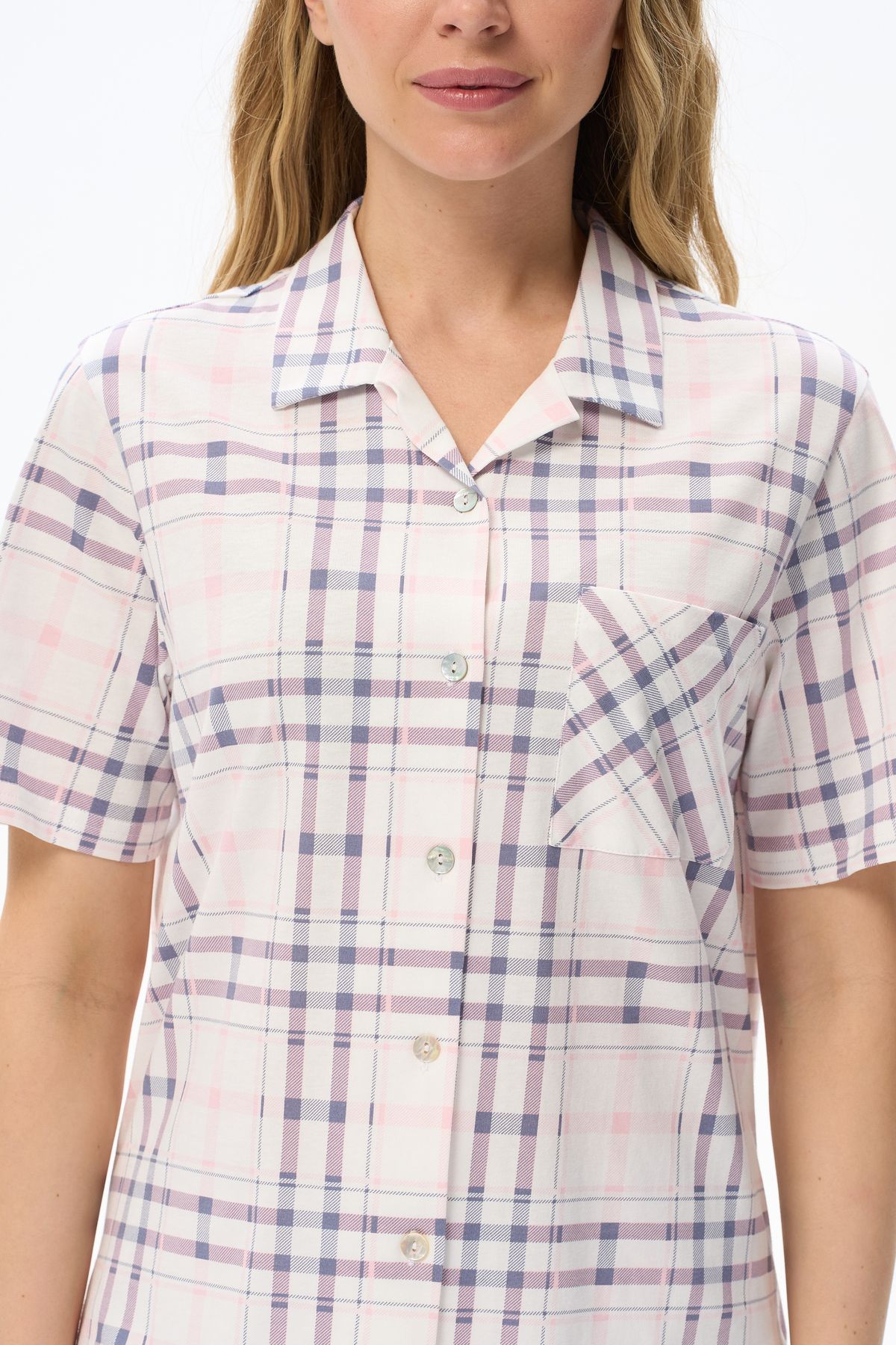 Описание: Блузка прямого силуэта с отложным воротником из хлопкового полотна. Застежка на пуговицы. Накладной карман, по низу разрезы в боковых швах. Короткие втачные рукава. Рост модели на фото 175см.