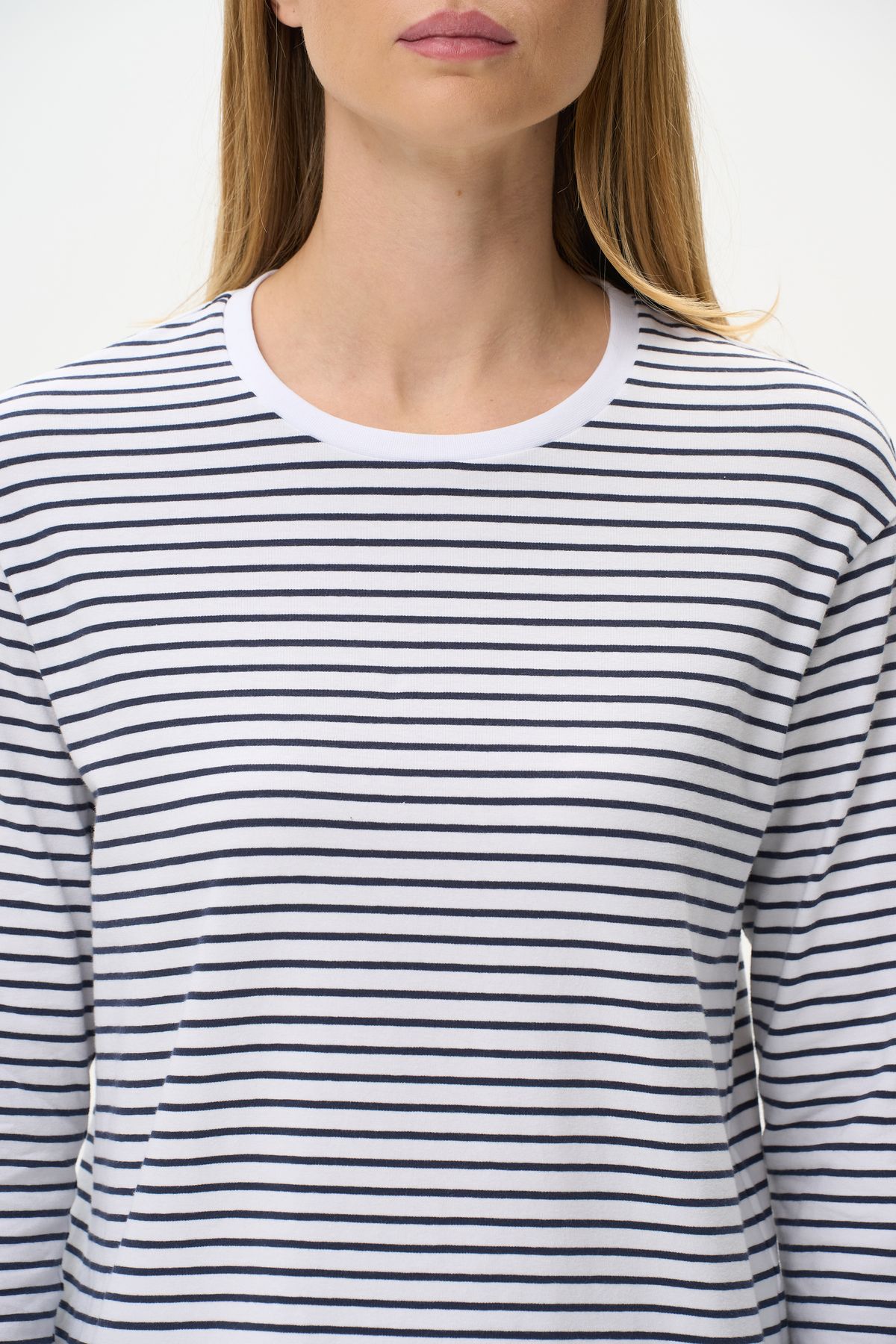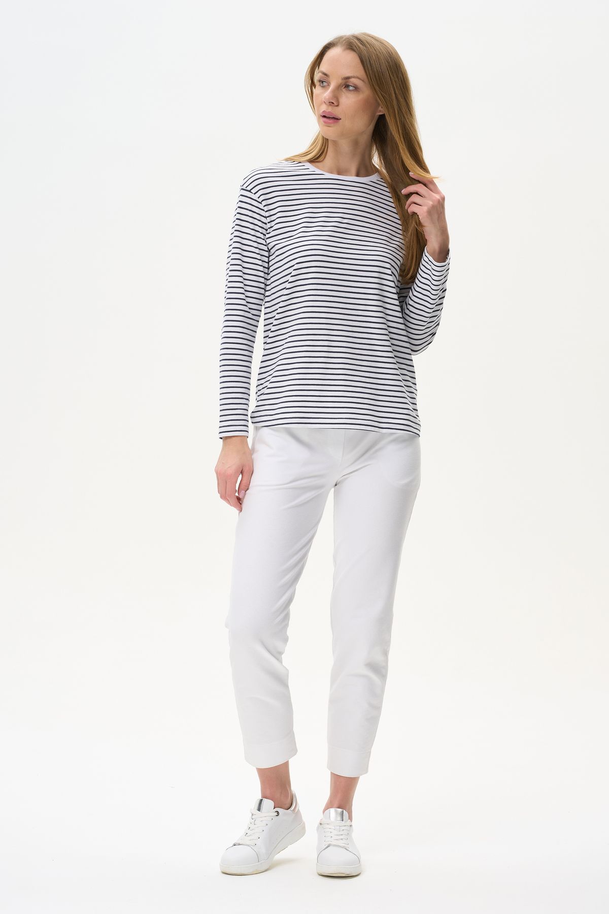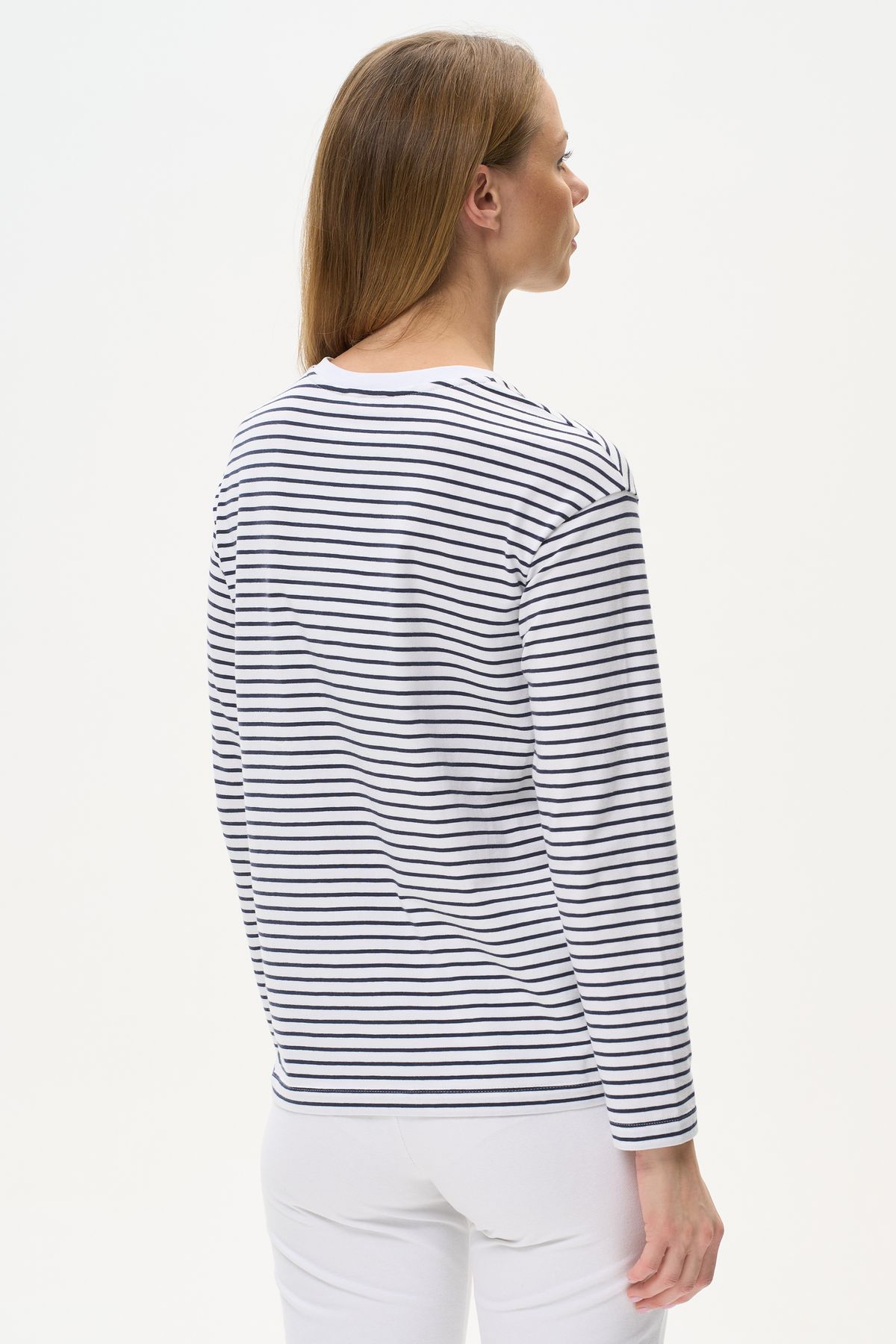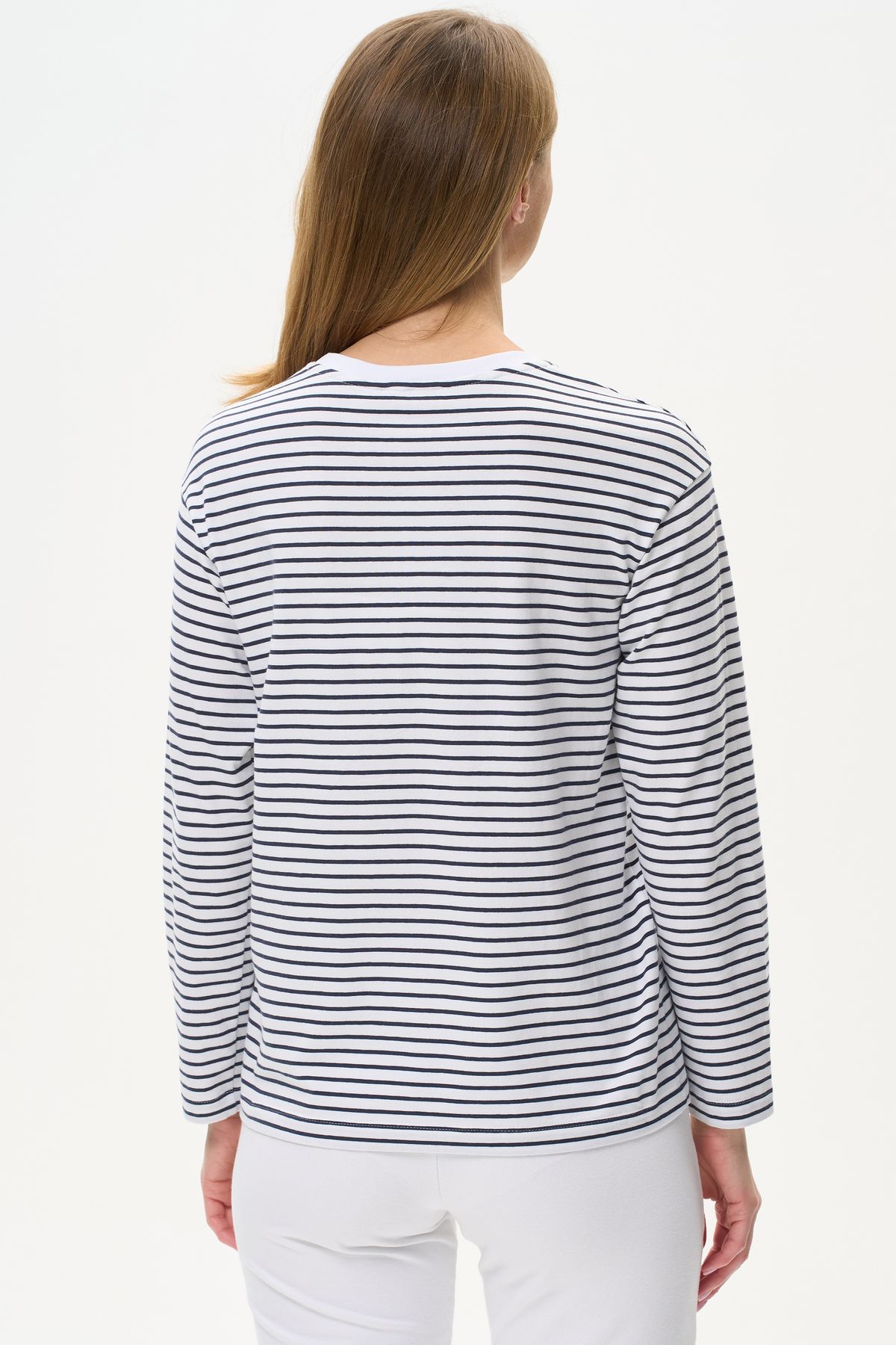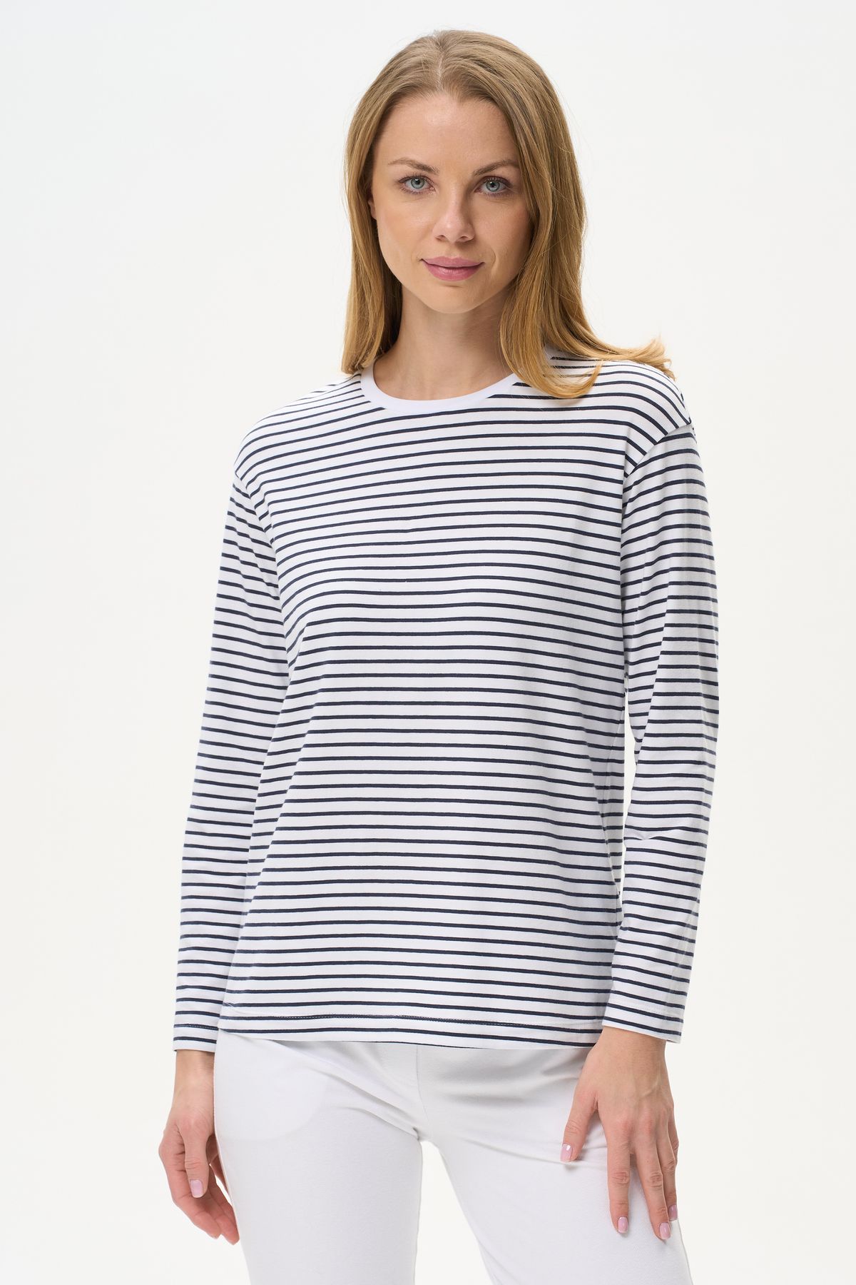 Описание: Комфортный лонгслив из хлопкового трикотажного полотна с эластаном, прямого силуэта. Круглый вырез горловины окантован хлопковым полотном рибана. Длинные втачные рукава. Рост модели на фото 177.