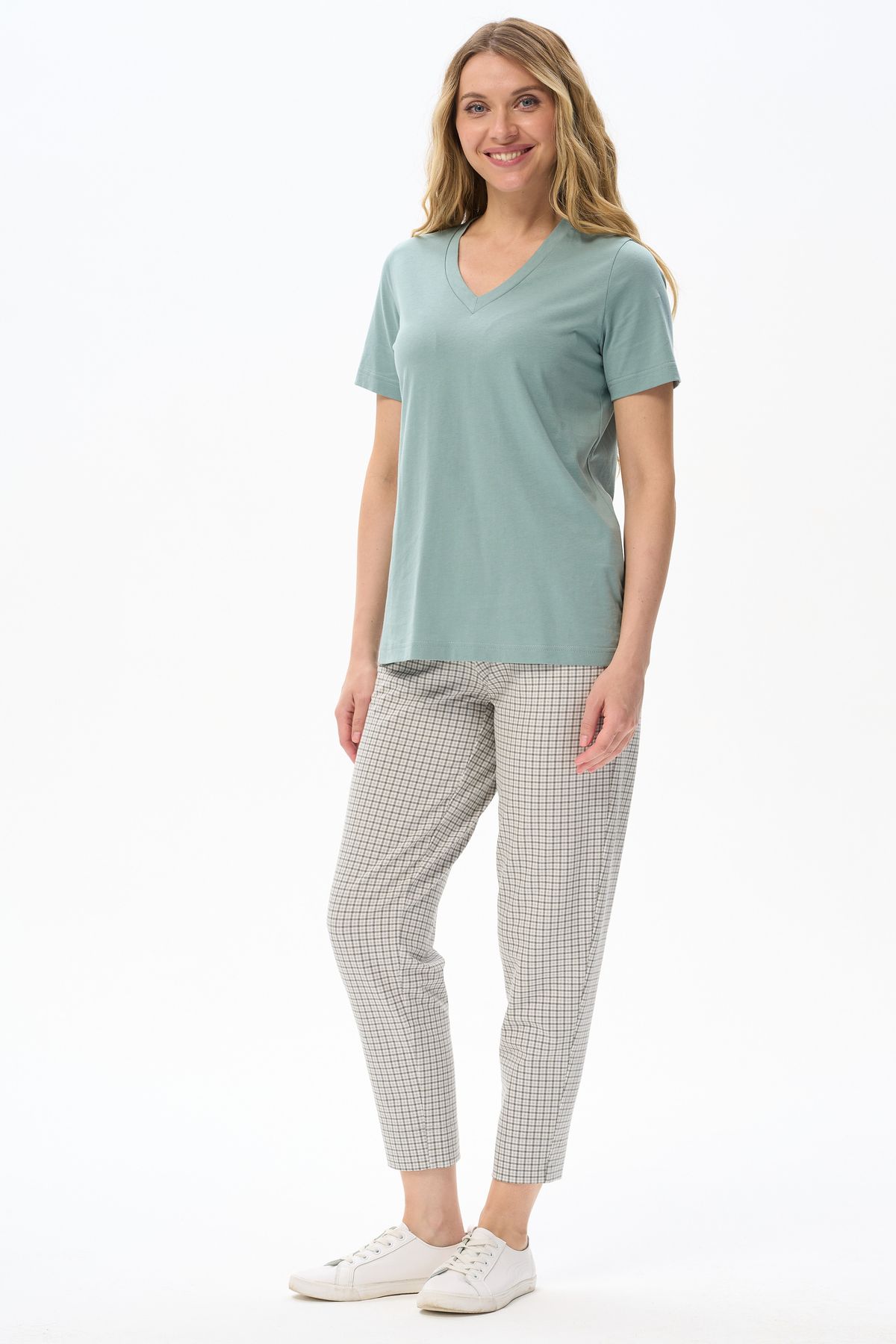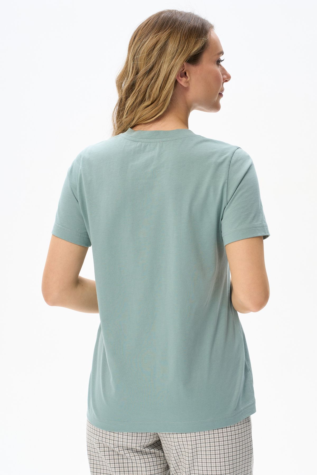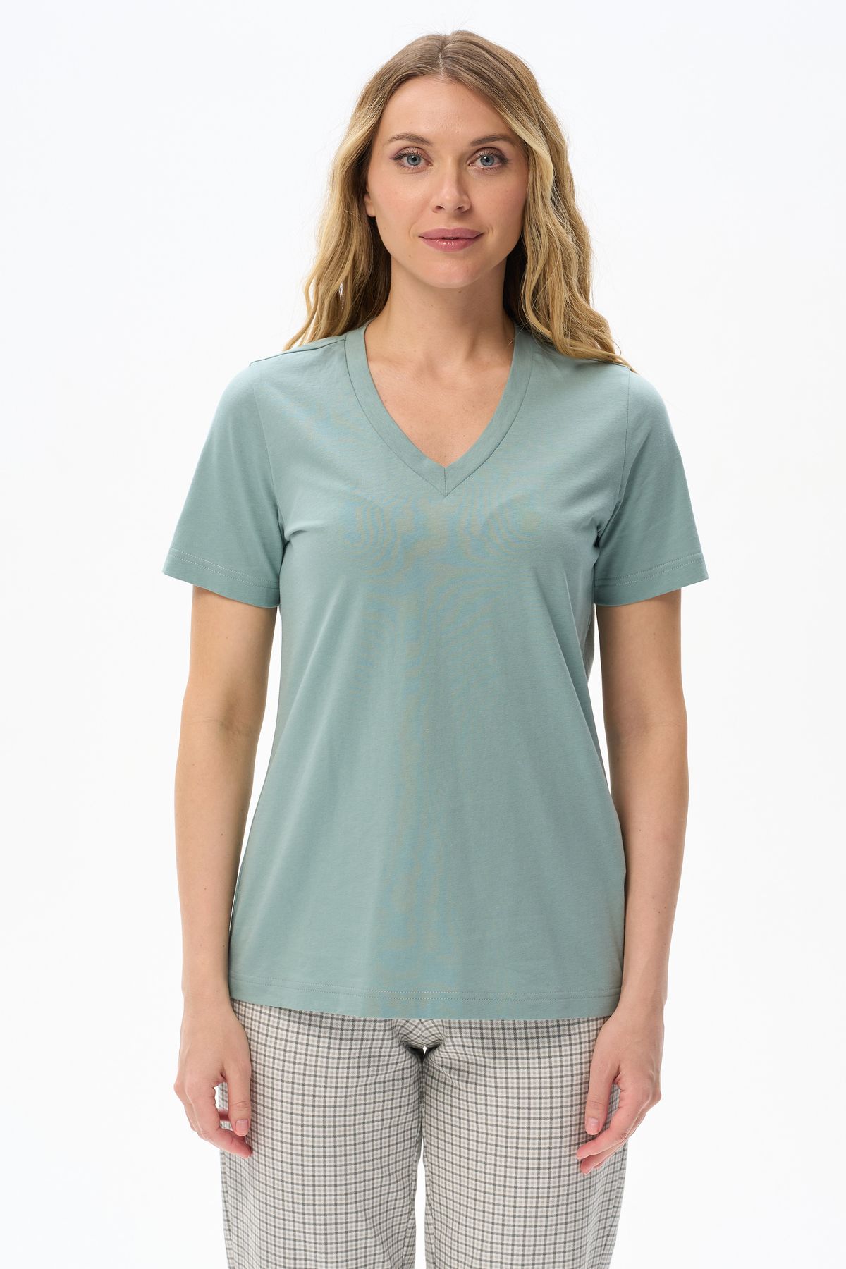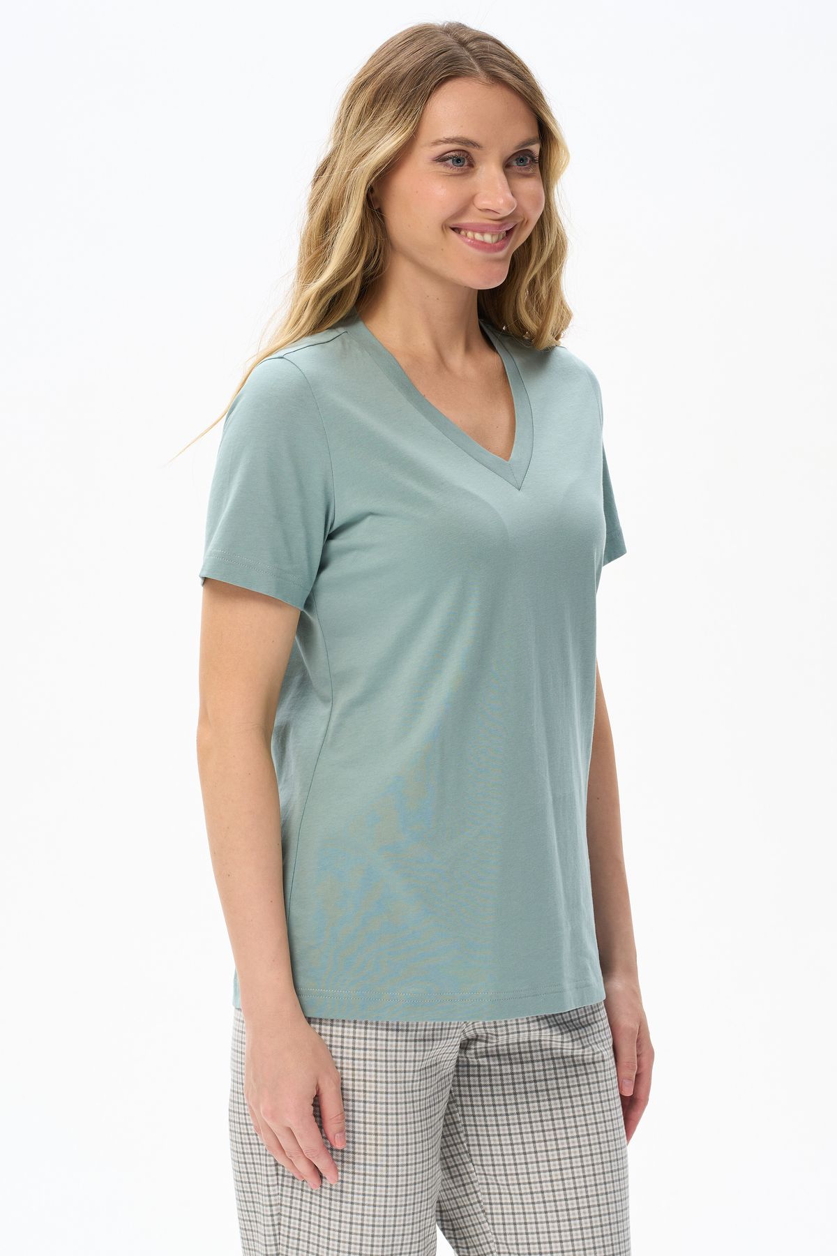 Описание: Футболка выполнена из хлопкового полотна. V-образный вырез горловины, короткие рукава. Рост модели на фото 170