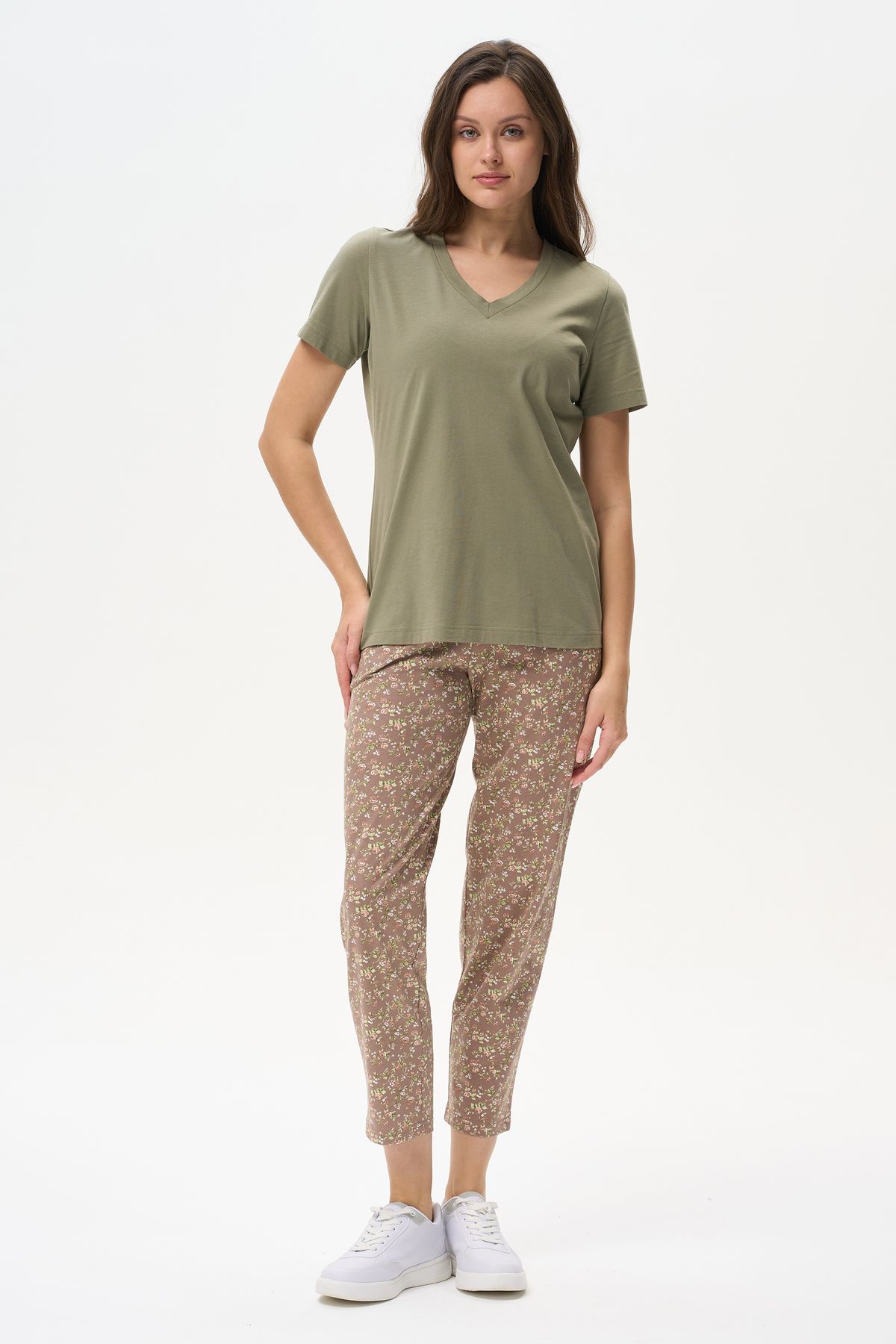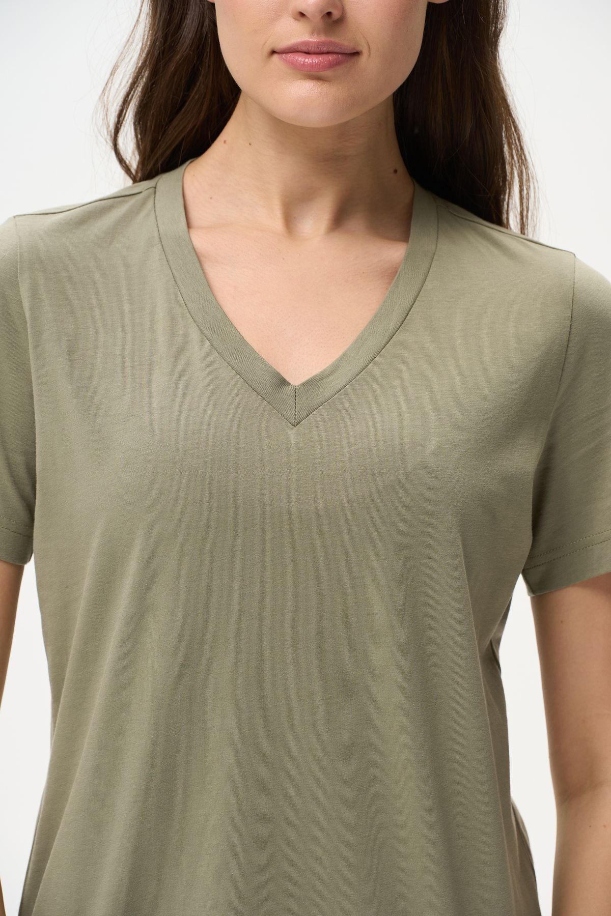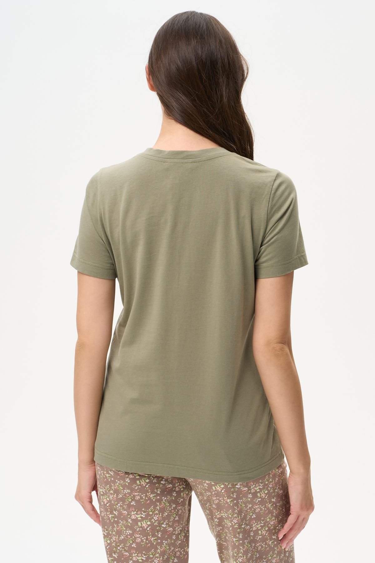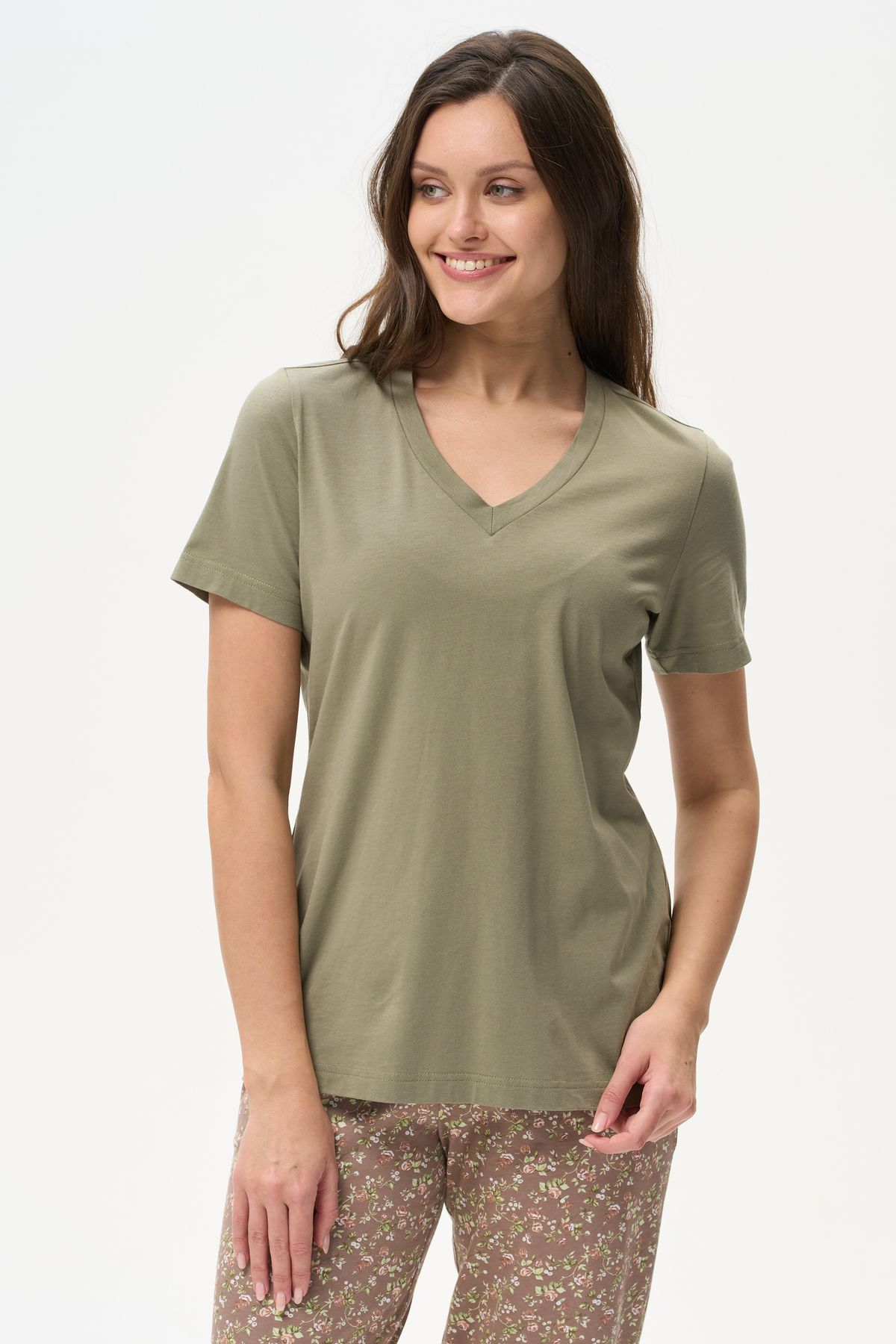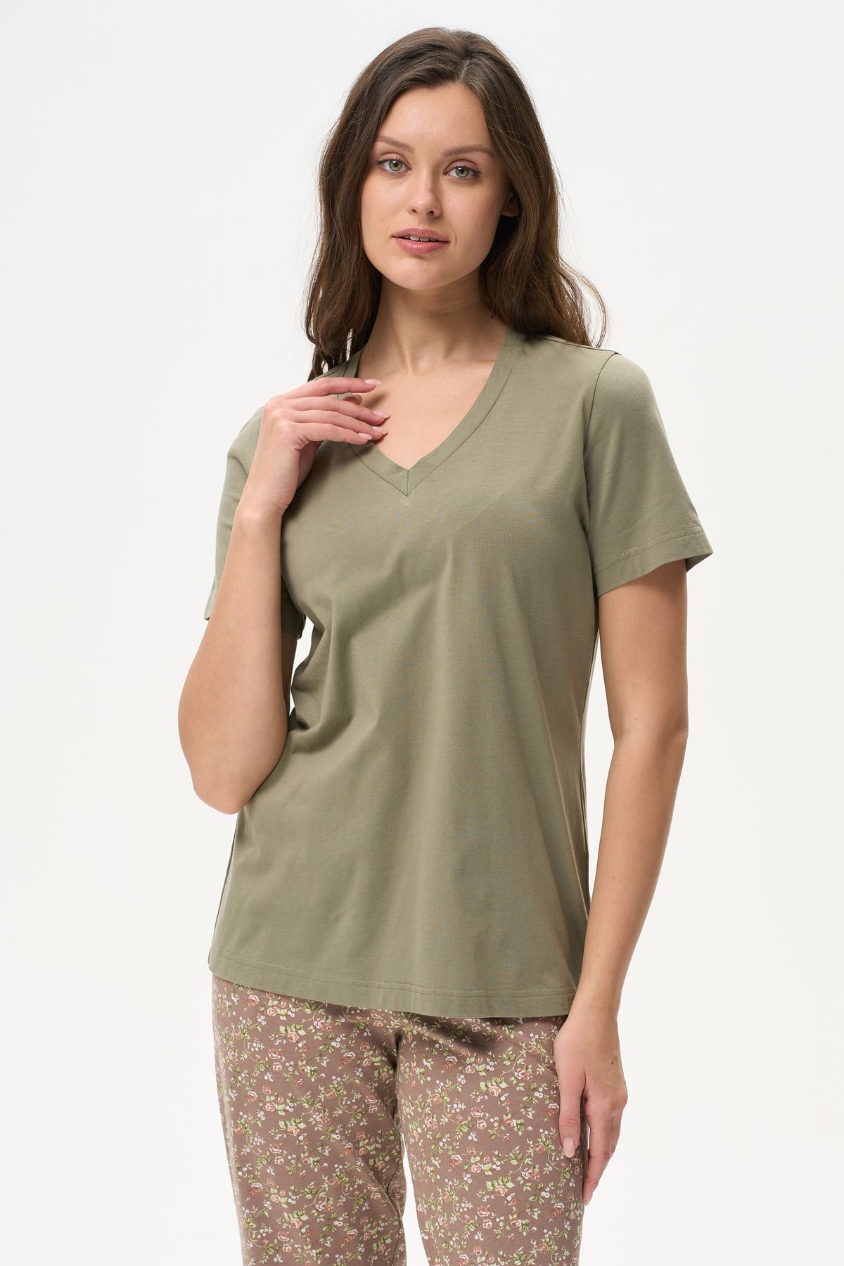 Описание: Футболка выполнена из хлопкового полотна. V-образный вырез горловины, короткие рукава. Рост модели на фото 178 см