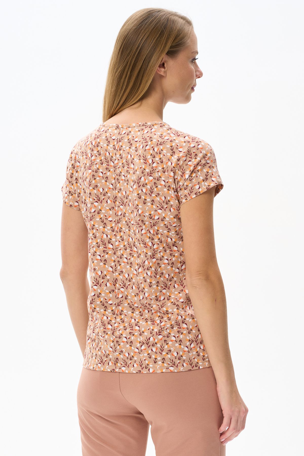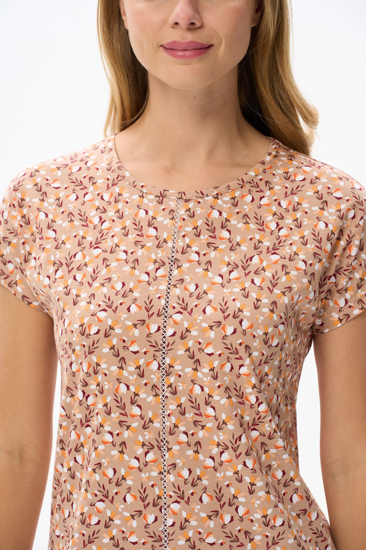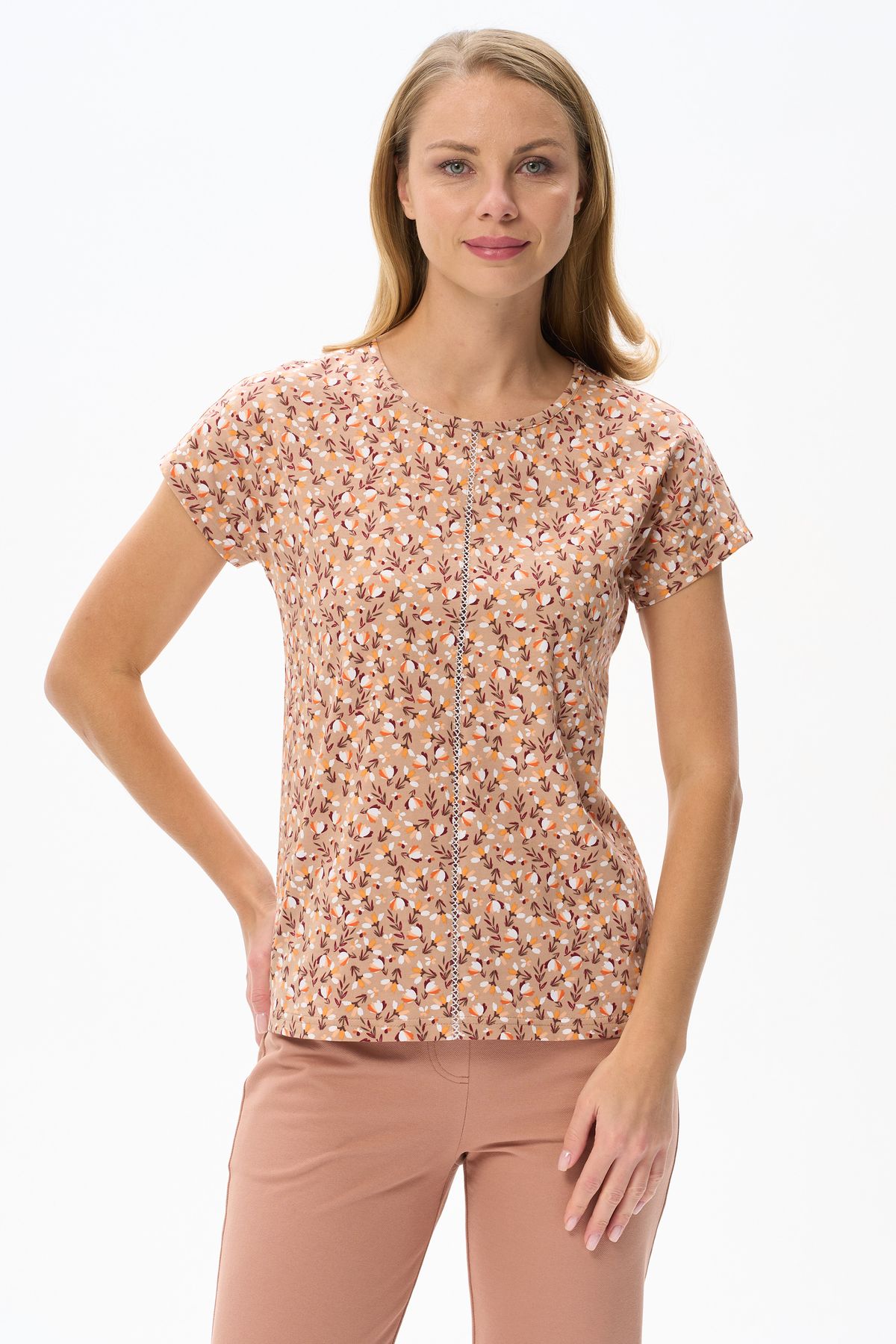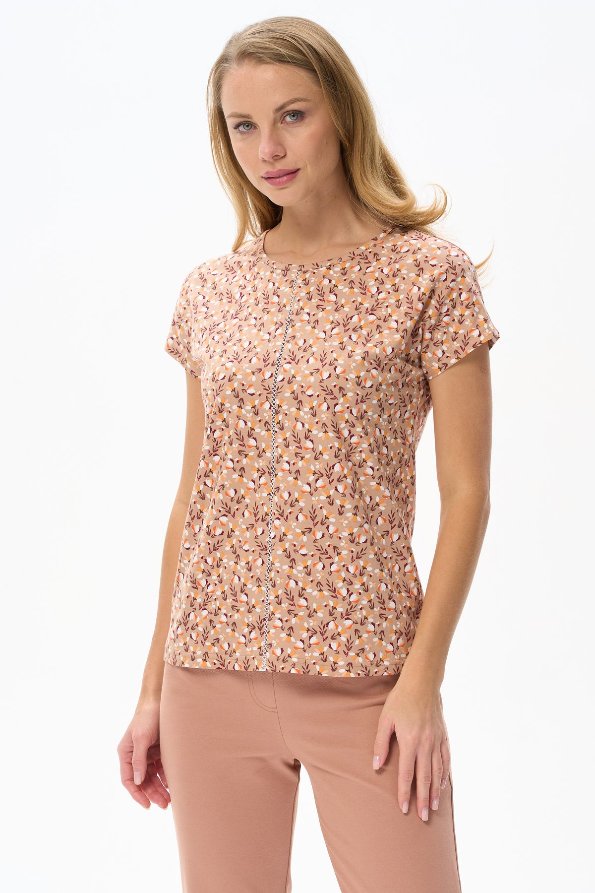 Описание: Футболка выполнена из хлопкового трикотажного полотна и декорирована мережкой. Модель с округлой горловиной и цельнокроеным коротким рукавом. Рост модели на фото 177см.