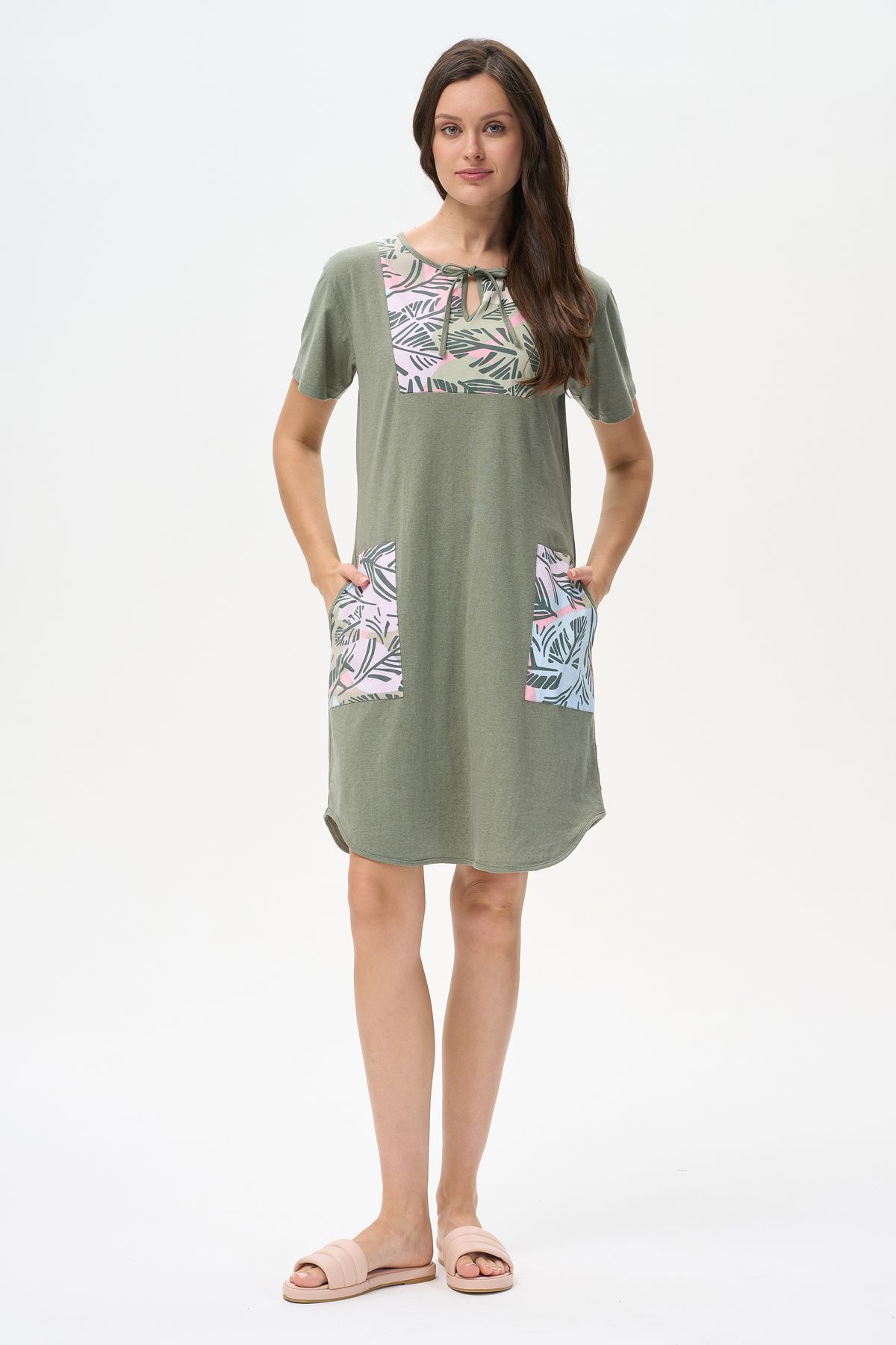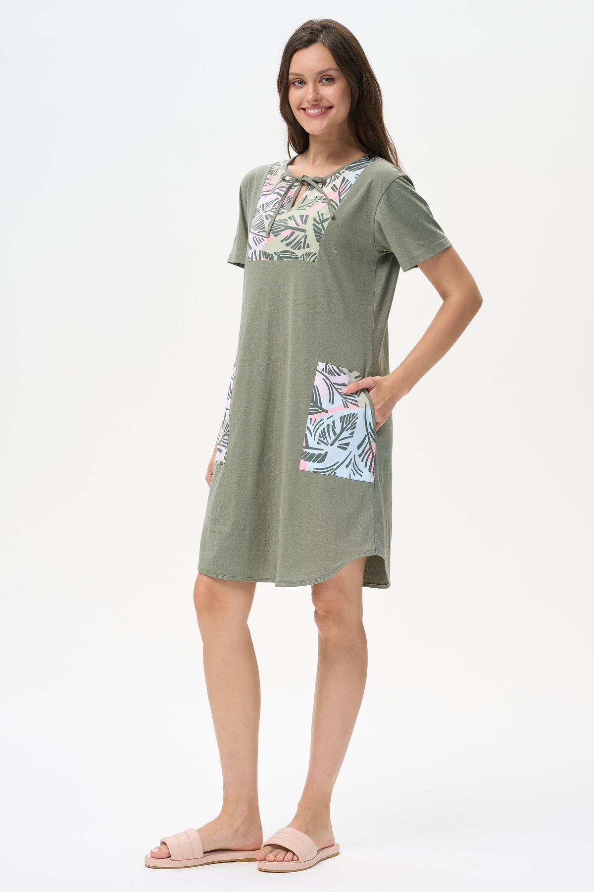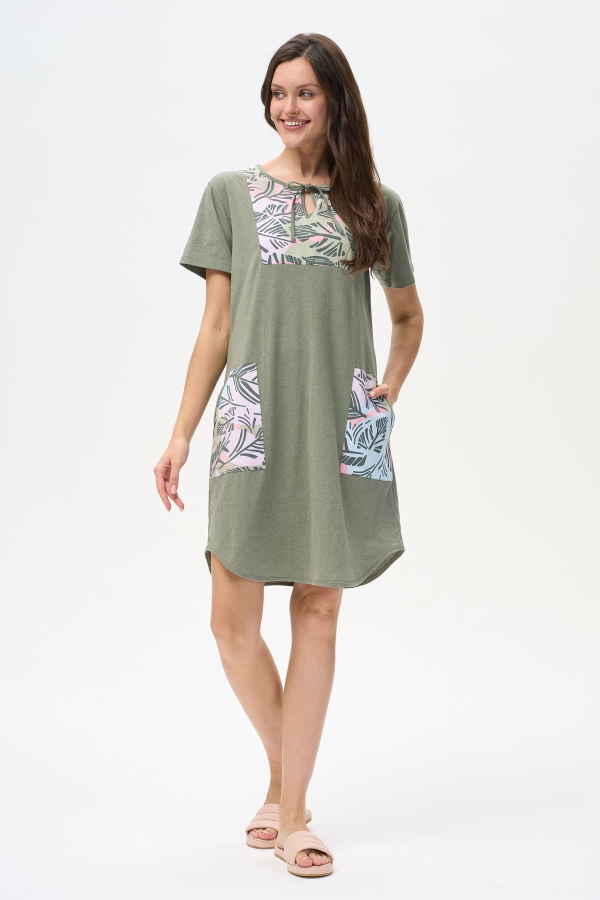 Описание: Платье А-силуэта выполнено из сочетания трикотажных полотен хлопкового и меланжевого качества пенье. Спереди фигурная кокетка с завязкой, накладные карманы. Короткие втачные рукава. Фигурная линия низа изделия окантована. Длина платья до колена. Рост модели на фото 178см