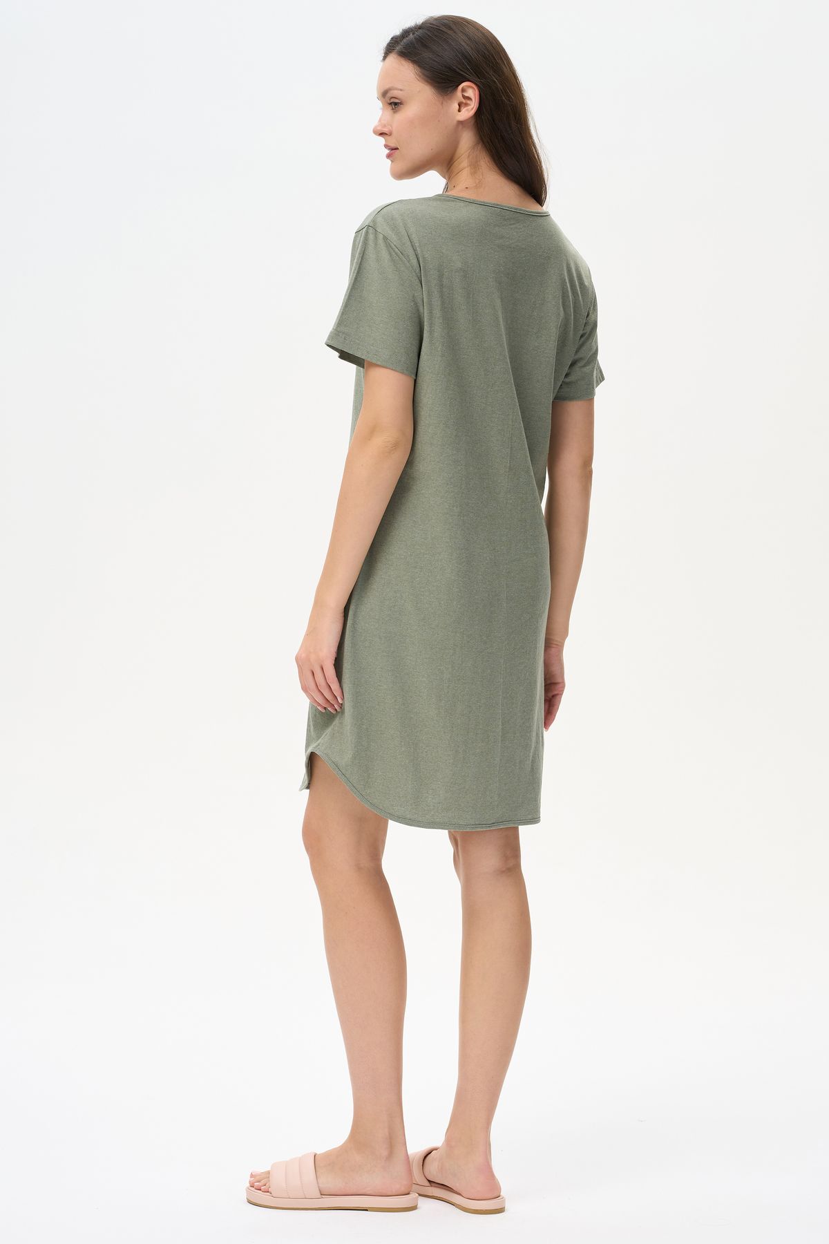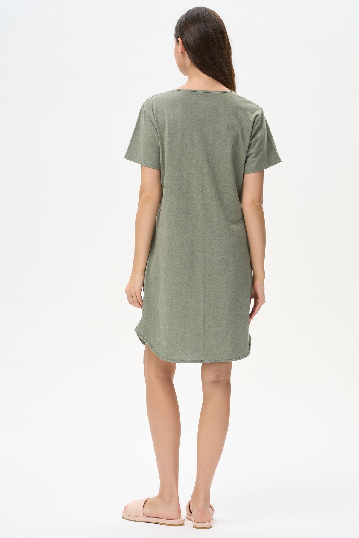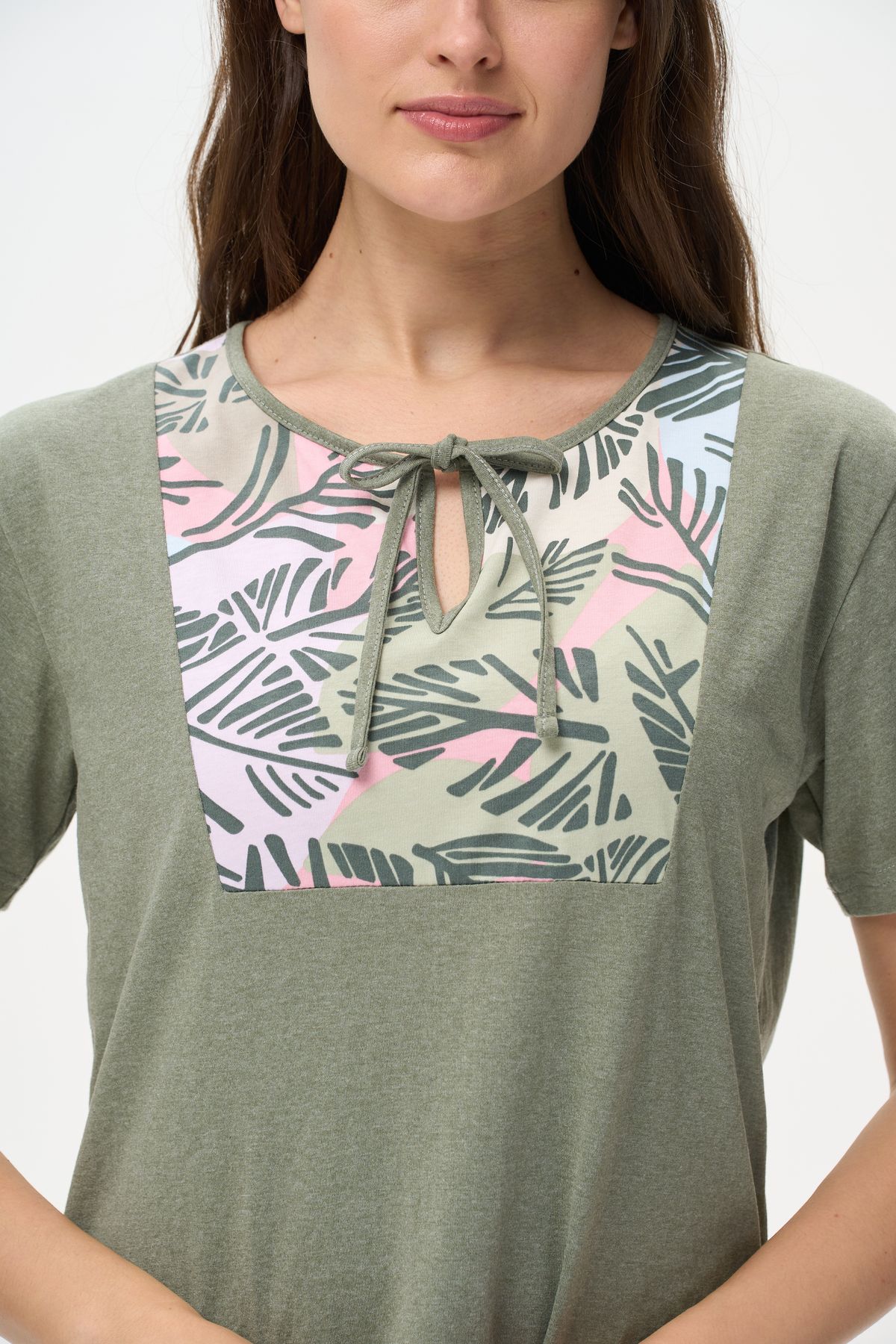 Описание: Платье А-силуэта выполнено из сочетания трикотажных полотен хлопкового и меланжевого качества пенье. Спереди фигурная кокетка с завязкой, накладные карманы. Короткие втачные рукава. Фигурная линия низа изделия окантована. Длина платья до колена. Рост модели на фото 178см