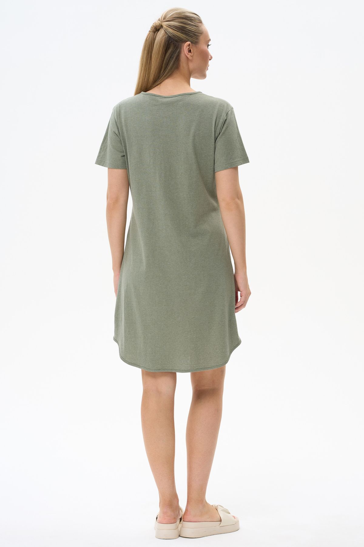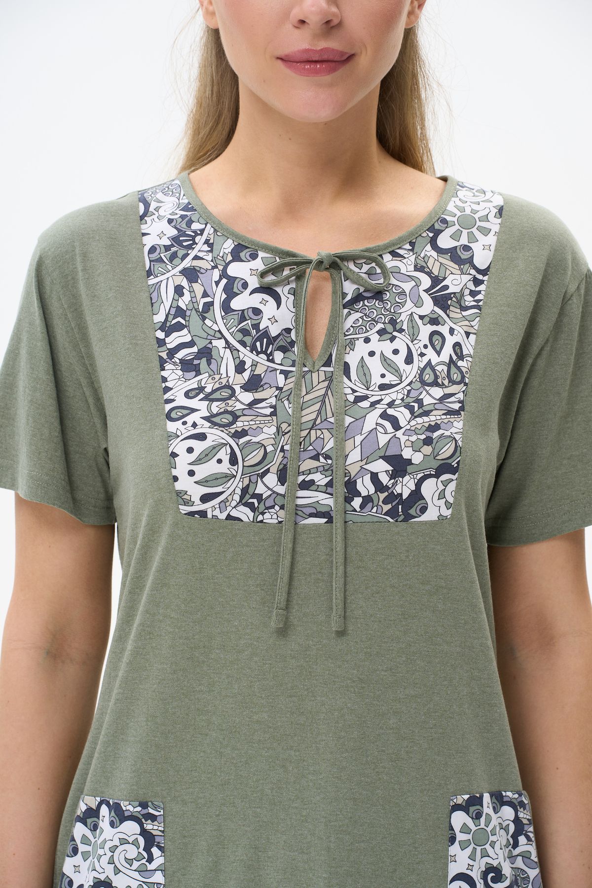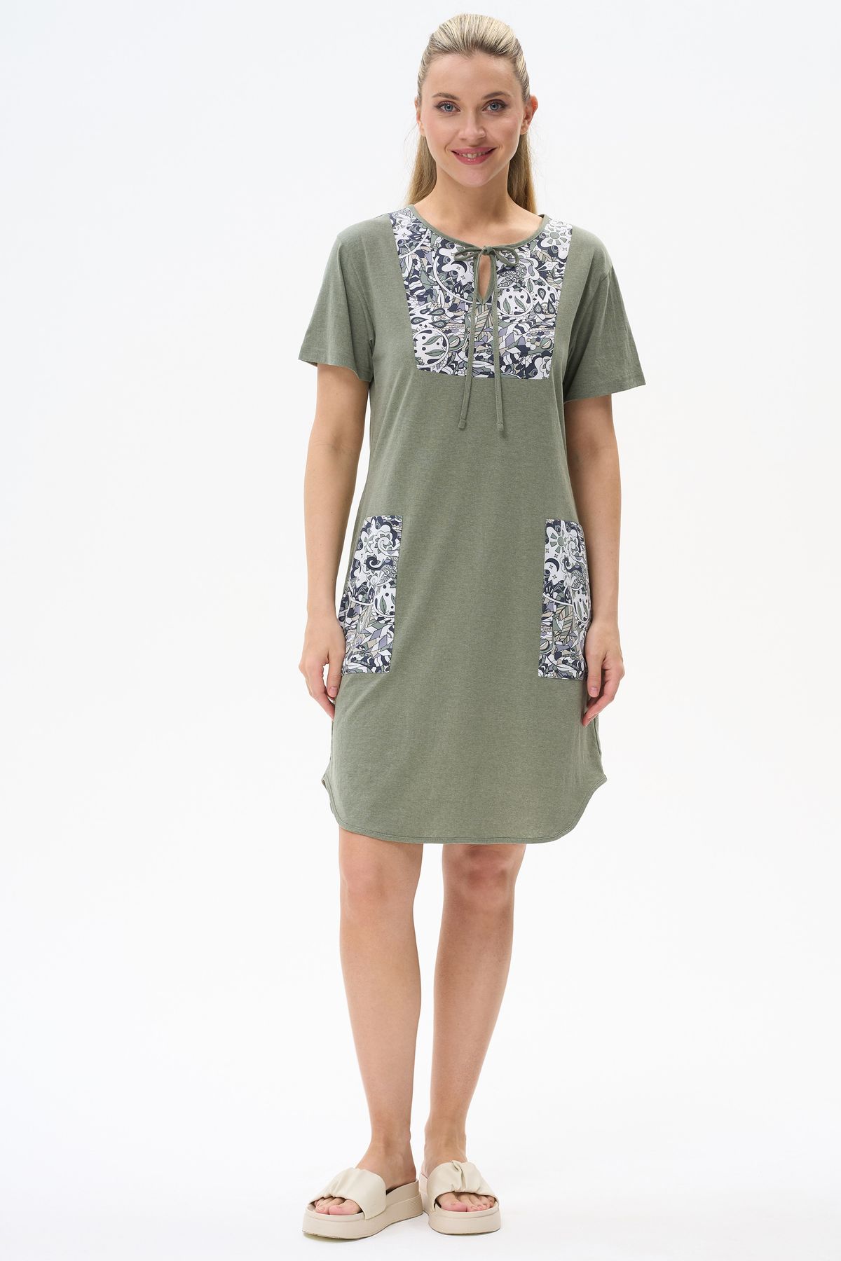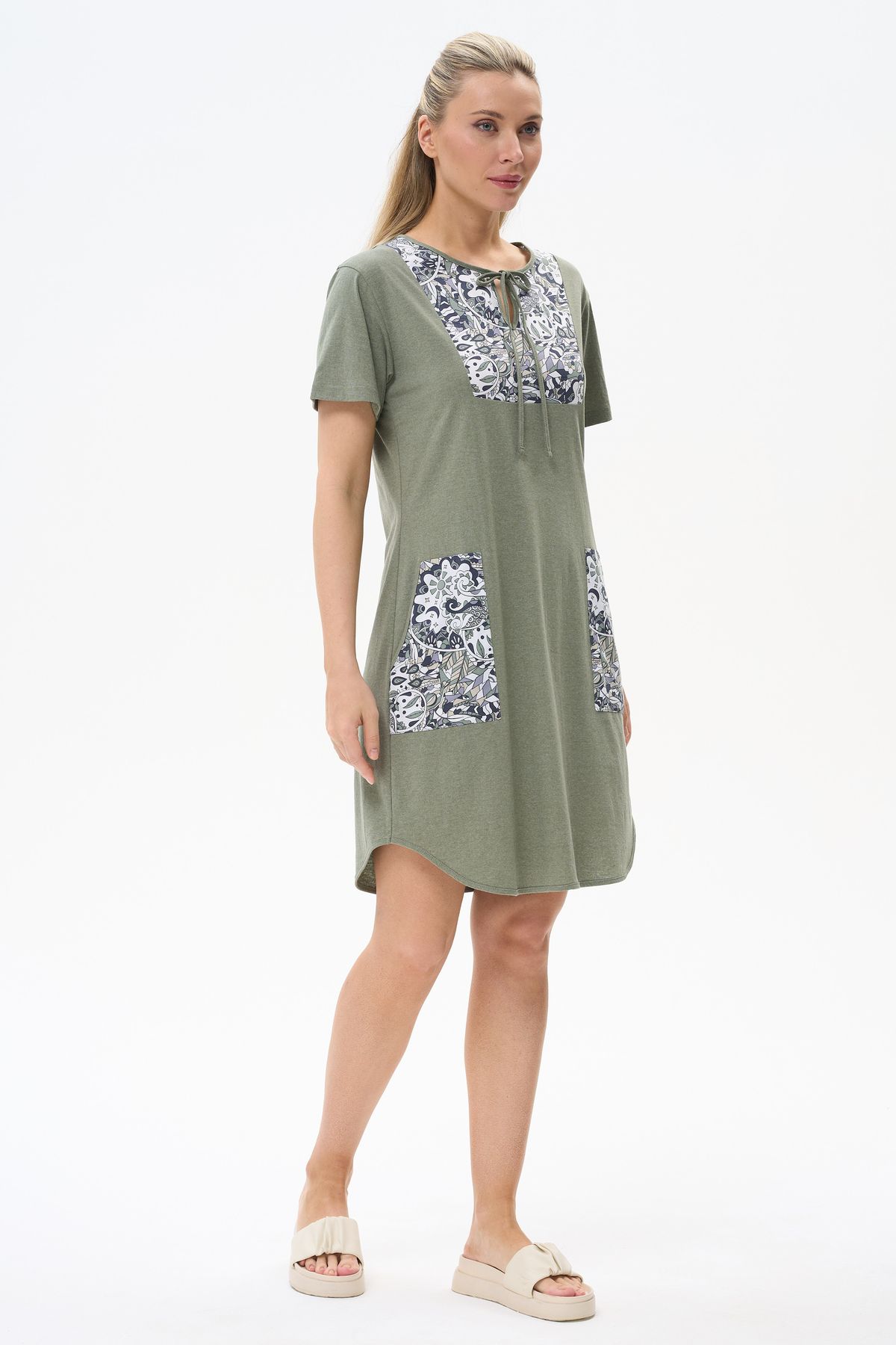 Описание: Платье А-силуэта выполнено из сочетания трикотажных полотен хлопкового и меланжевого качества пенье. Спереди фигурная кокетка с завязкой, накладные карманы. Короткие втачные рукава. Фигурная линия низа изделия окантована. Длина платья до колена. Рост модели на фото 178см