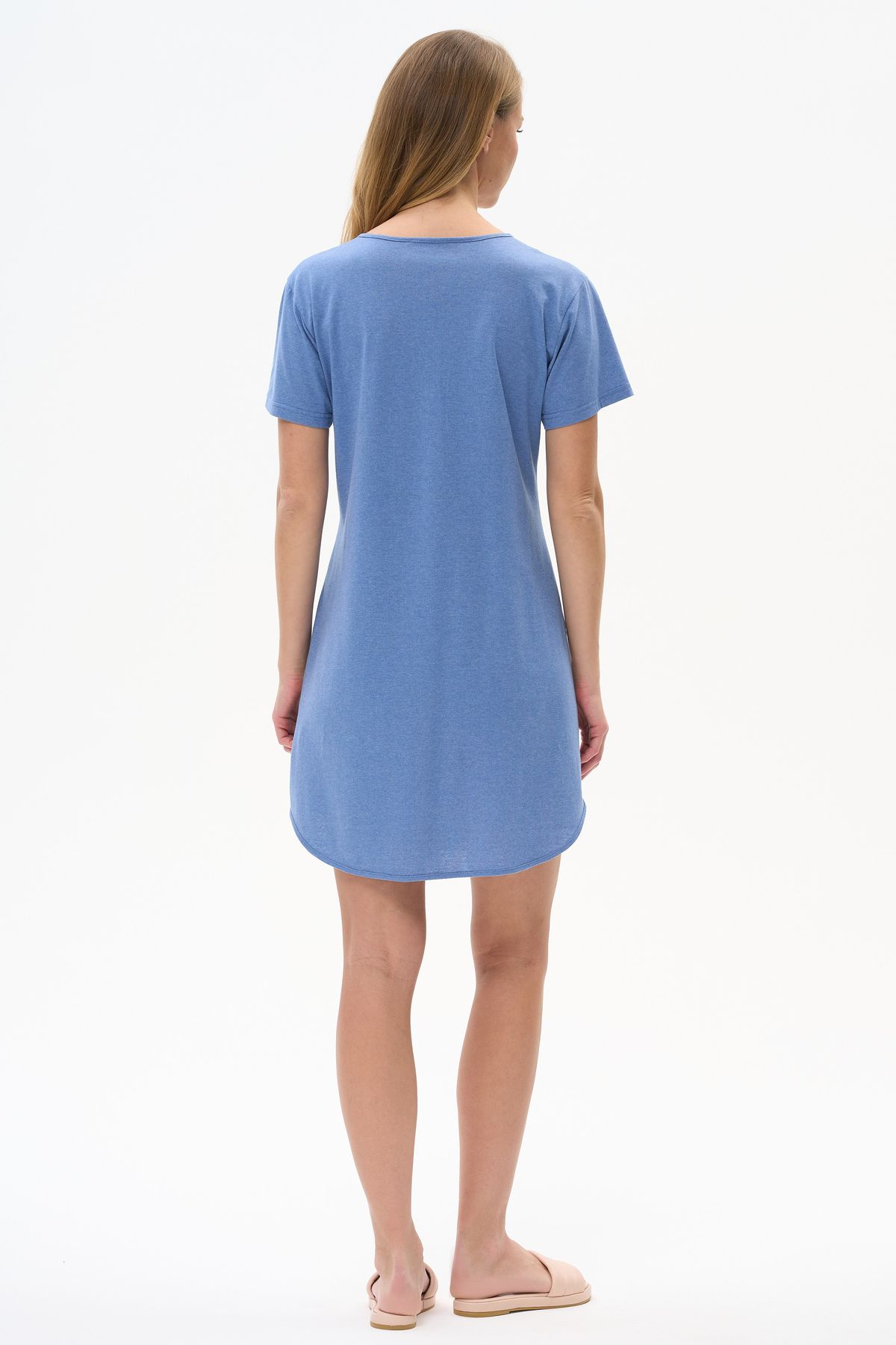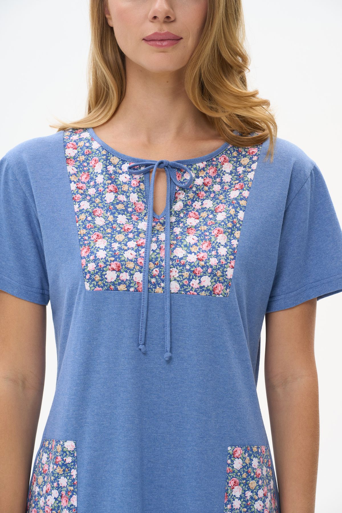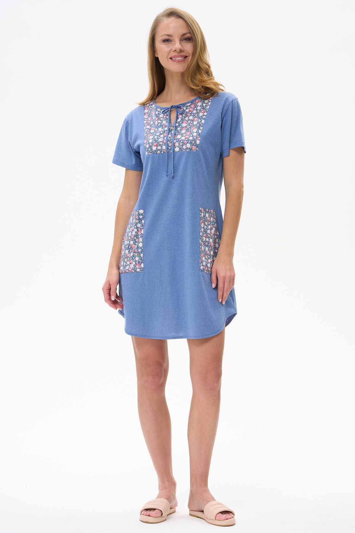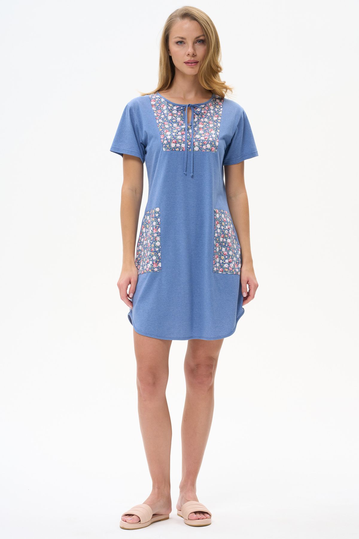Описание: Платье А-силуэта выполнено из сочетания трикотажных полотен хлопкового и меланжевого качества пенье. Спереди фигурная кокетка с завязкой, накладные карманы. Короткие втачные рукава. Фигурная линия низа изделия окантована. Длина платья до колена. Рост модели на фото 178см