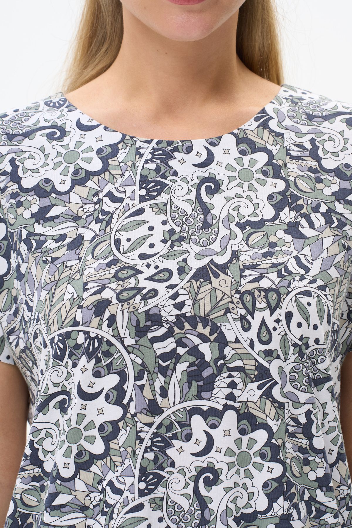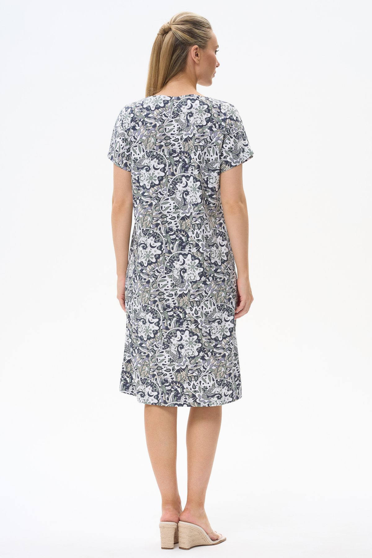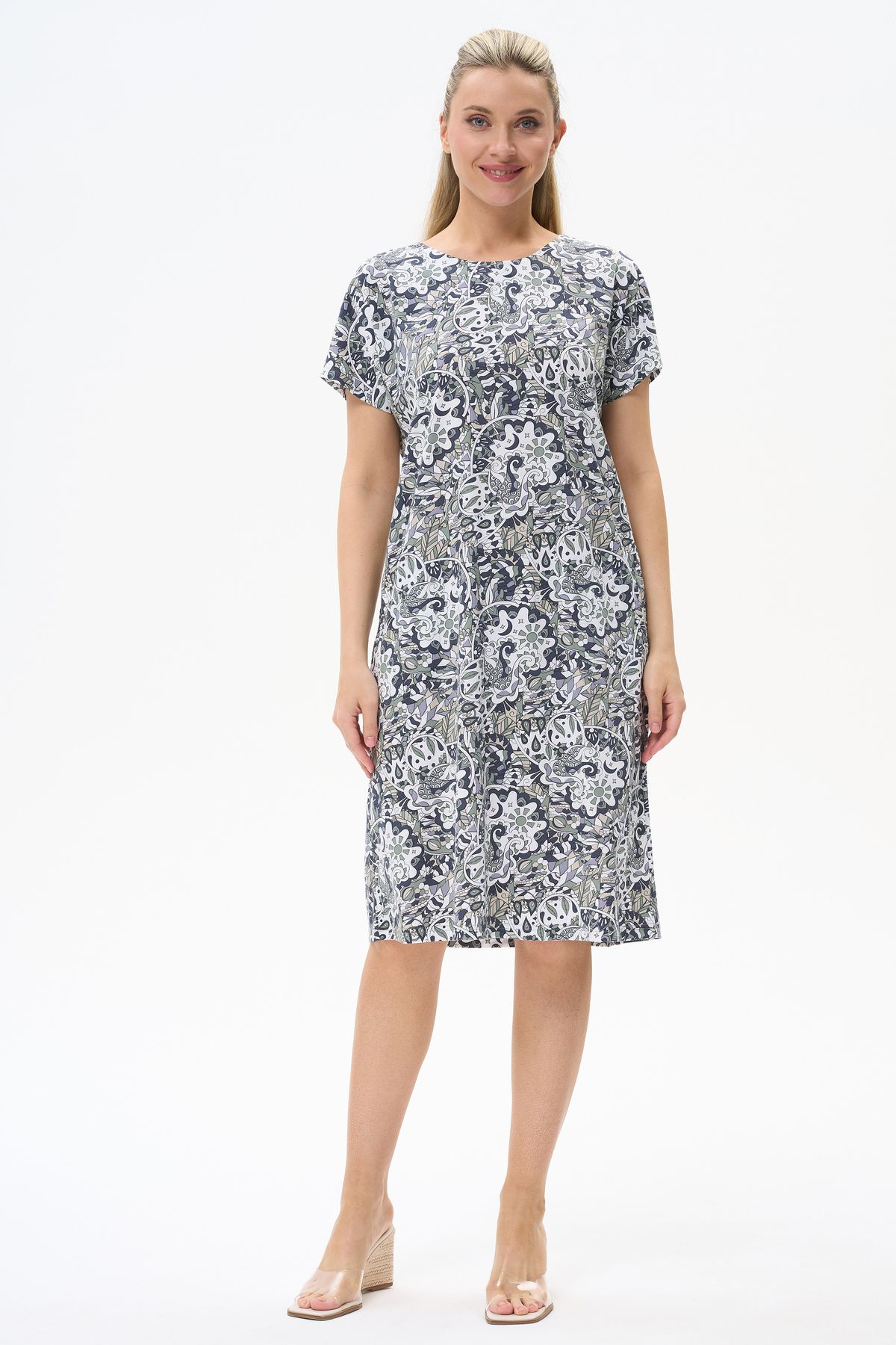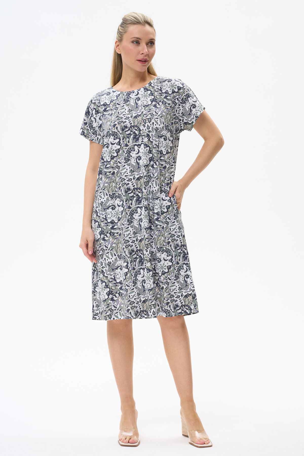 Описание: Платье прямого силуэта из трикотажного полотна качества пенье. Круглый вырез горловины, спущенная линия плеча, цельнокроенные короткие рукава, в боковых швах карманы. Длина изделия ниже колена. Рост модели на фото 177см.