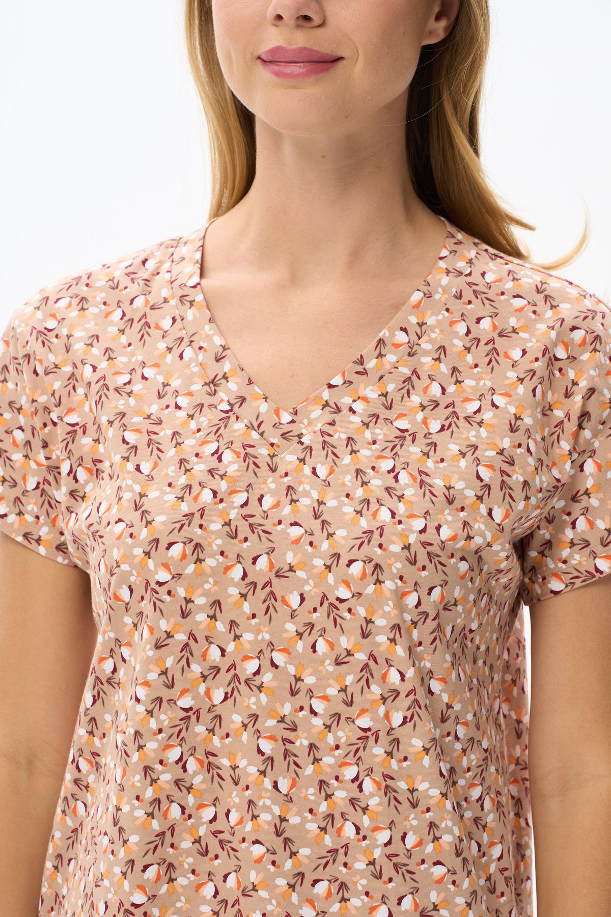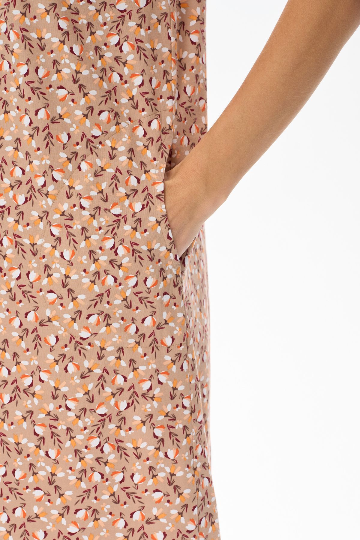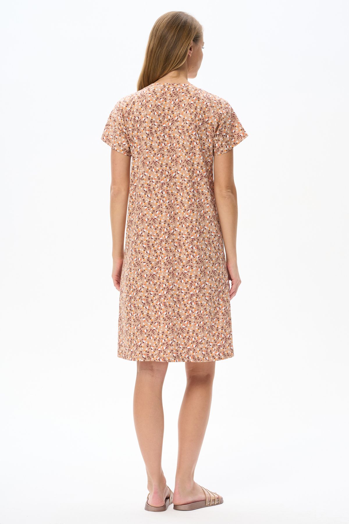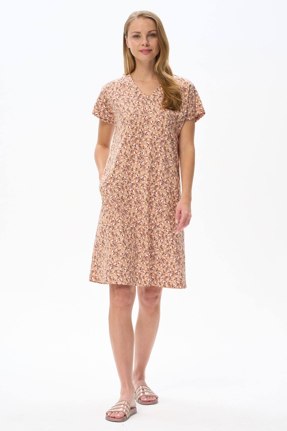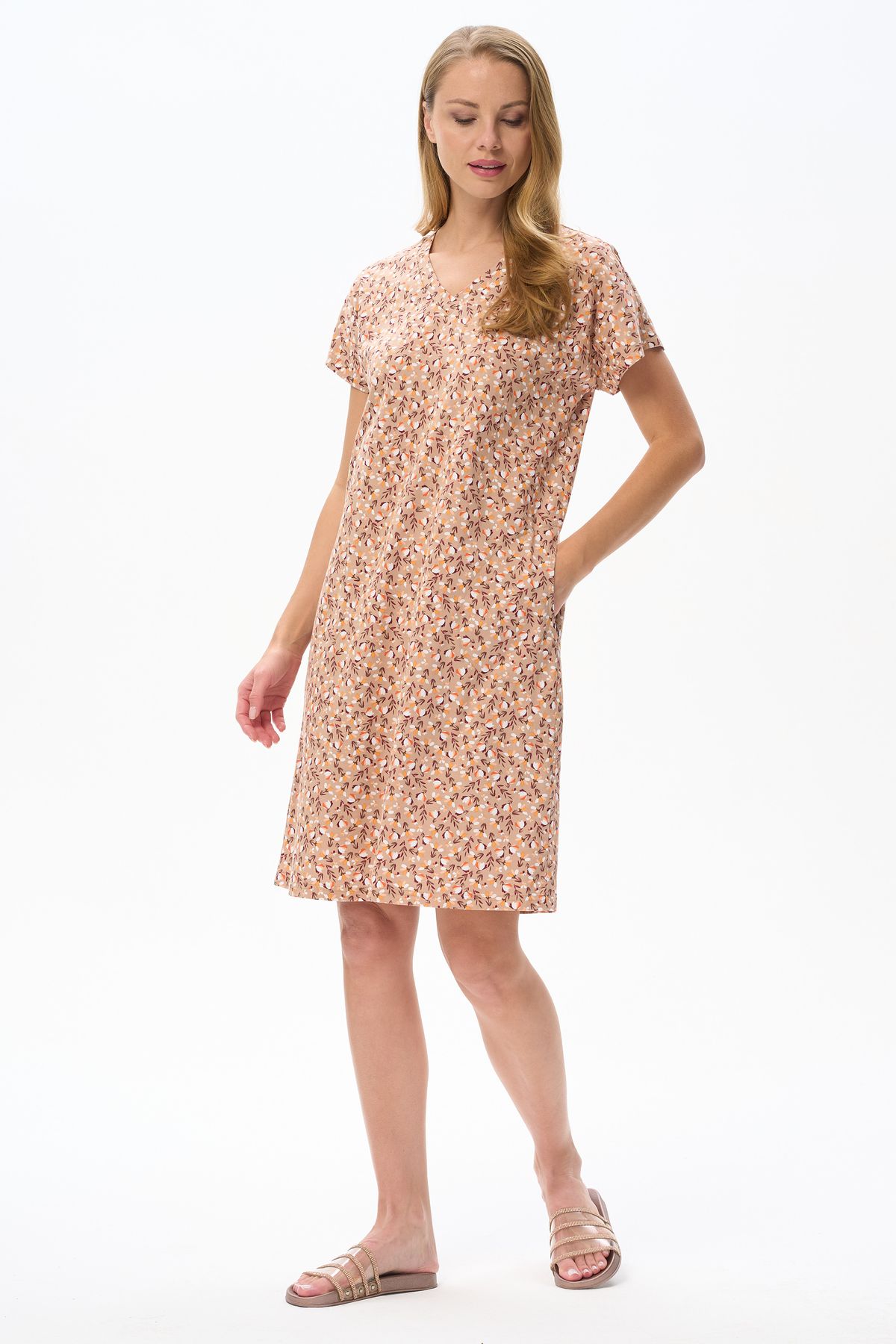 Описание: Платье прямого силуэта из хлопкового трикотажного полотна. V-образный вырез горловины, спущенная линия плеча, цельнокроенные короткие рукава, в боковых швах карманы. Длина изделия ниже колена. Рост модели на фото 178см.