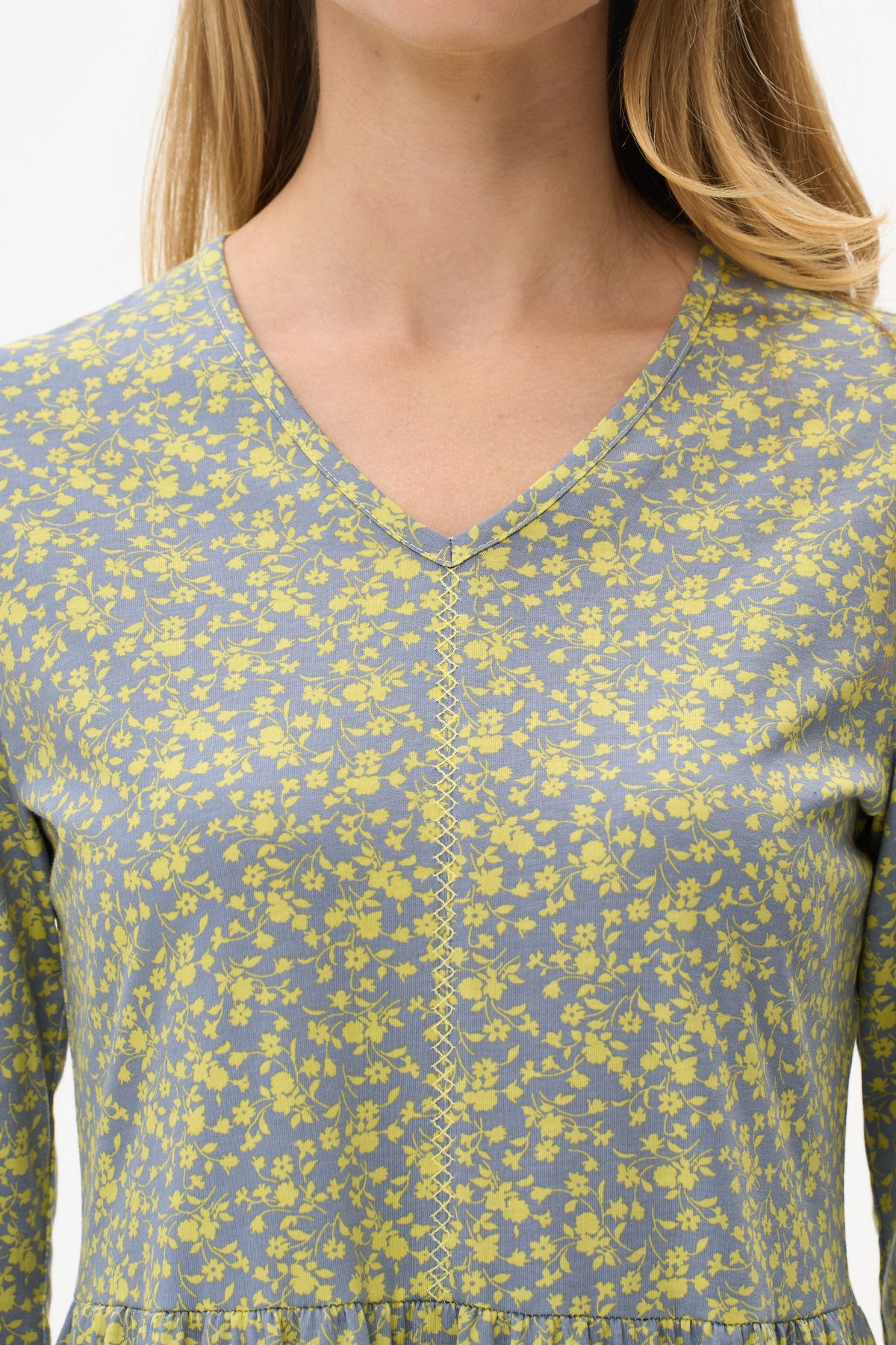 Описание: Платье расклешенного силуэта из хлопкового полотна. Вырез горловины V- образной формы, полочка декорирована мережкой. Рукава длинной чуть ниже локтя. Длина изделия ниже колена. Рост модели 177