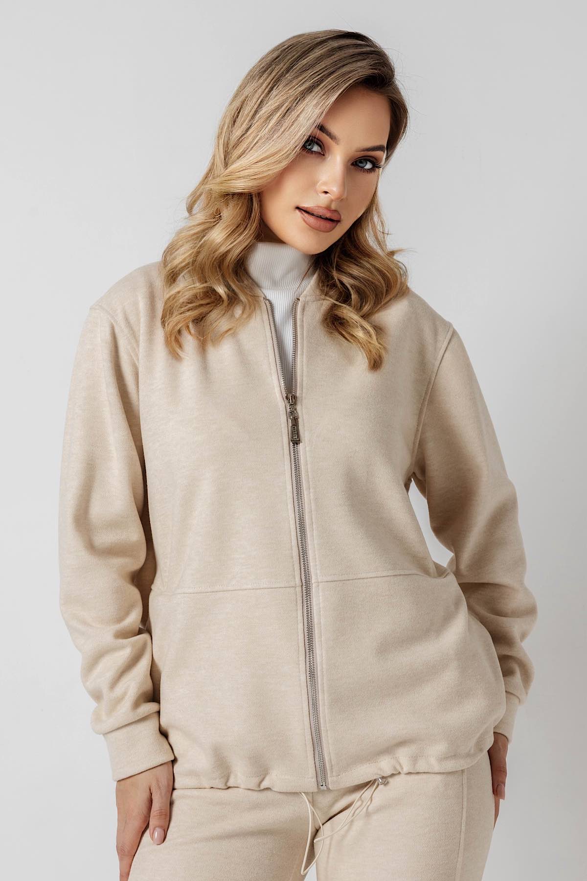 Описание: Трикотажный жакет без подклада, свободного силуэта в  стиле бомбера с круглым вырезом горловины и втачным рукавом полной длины — это универсальный предмет гардероба, который подойдет для повседневного образа. Застежка спереди на молнии, карманы в резе спереди. Низ изделия собирается на резинку с фиксаторами Жакет будет подойдет для офиса, школы, повседневного образа.