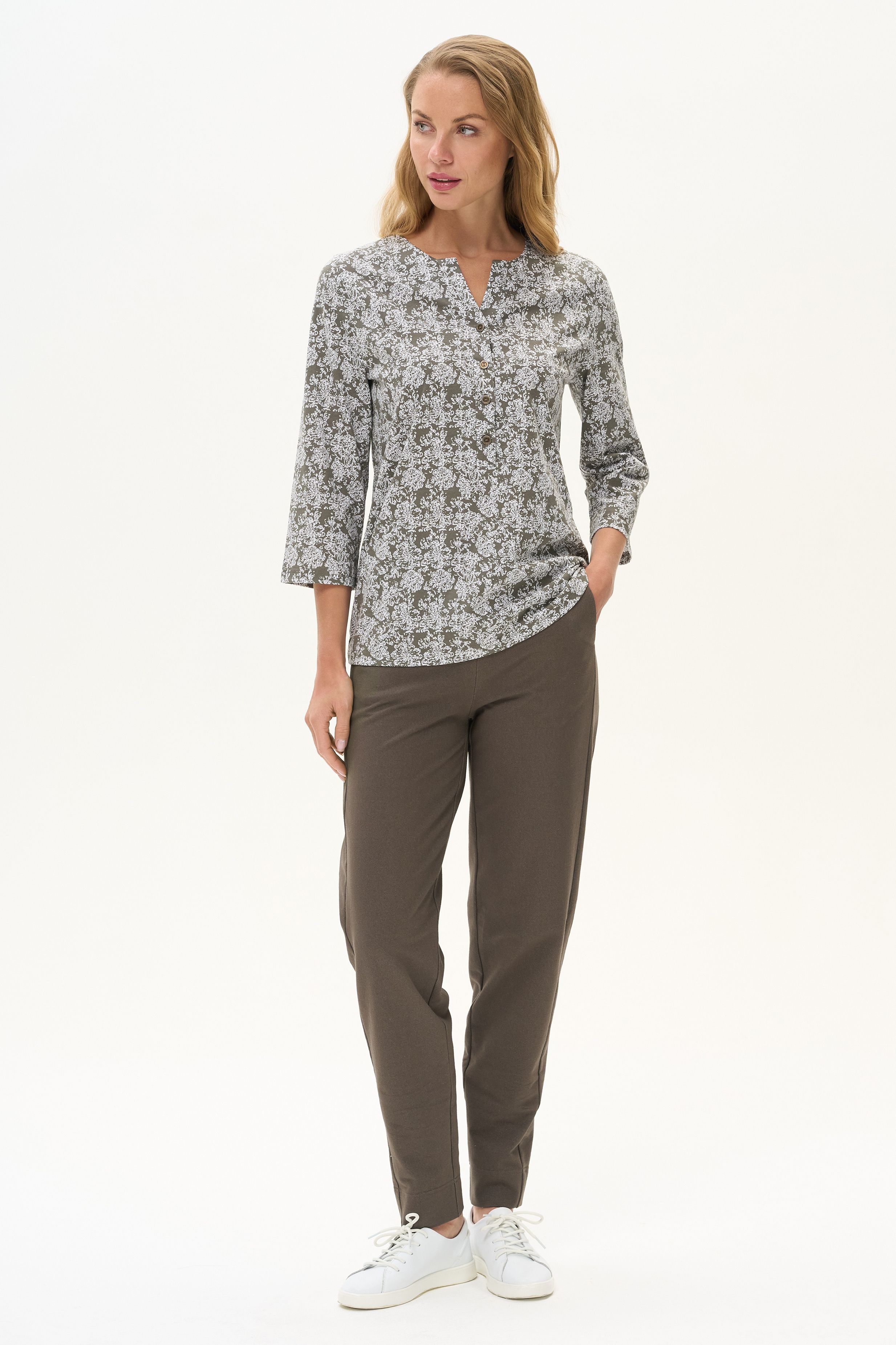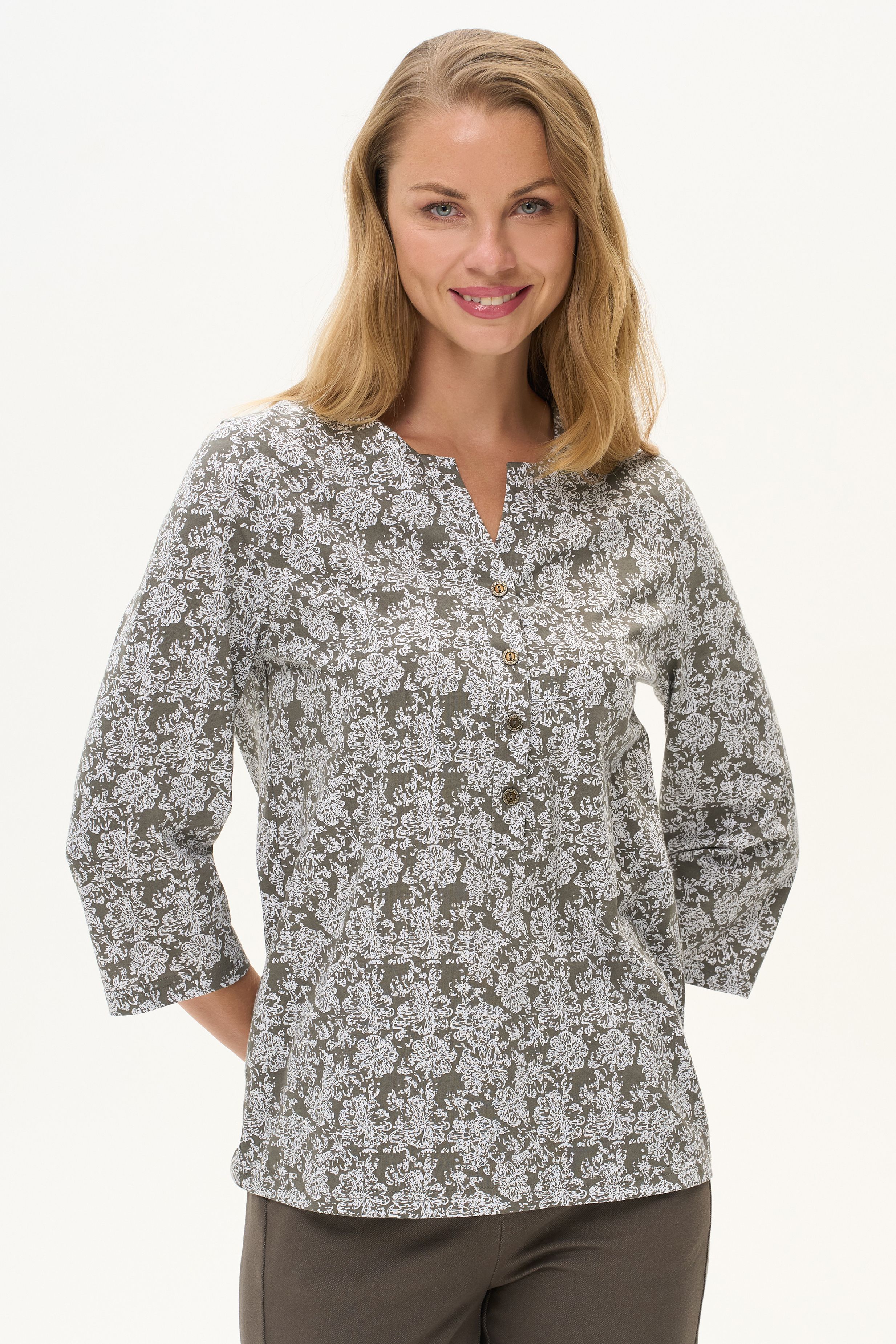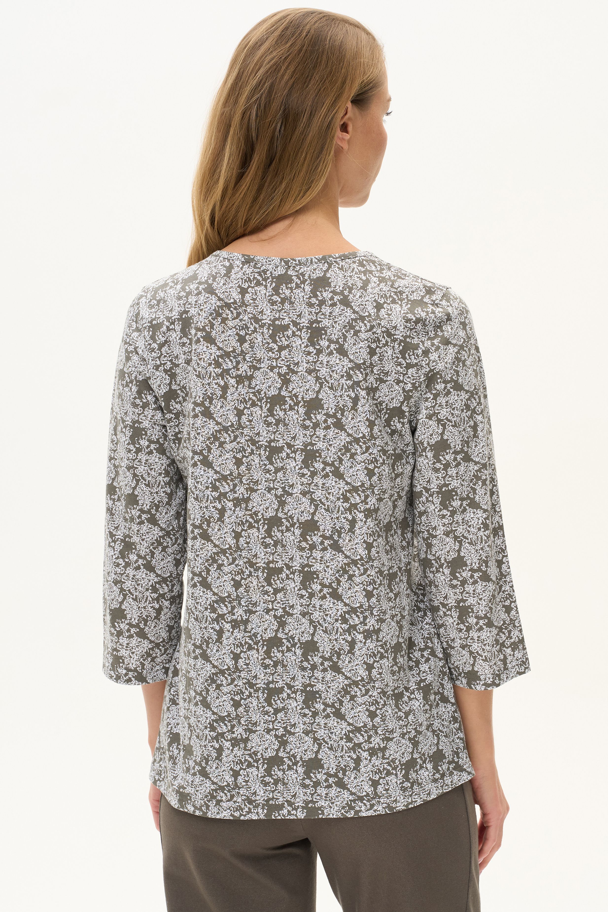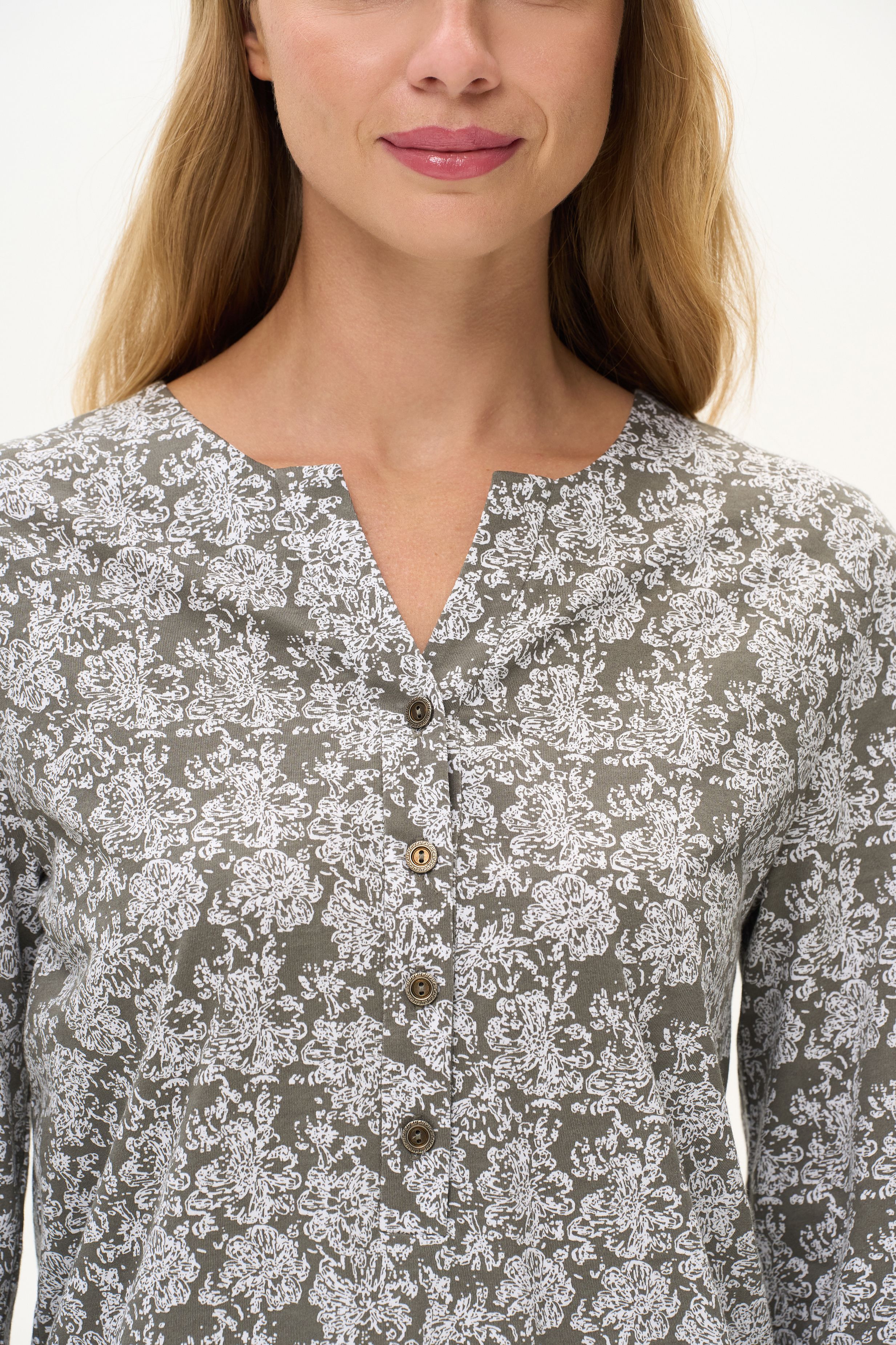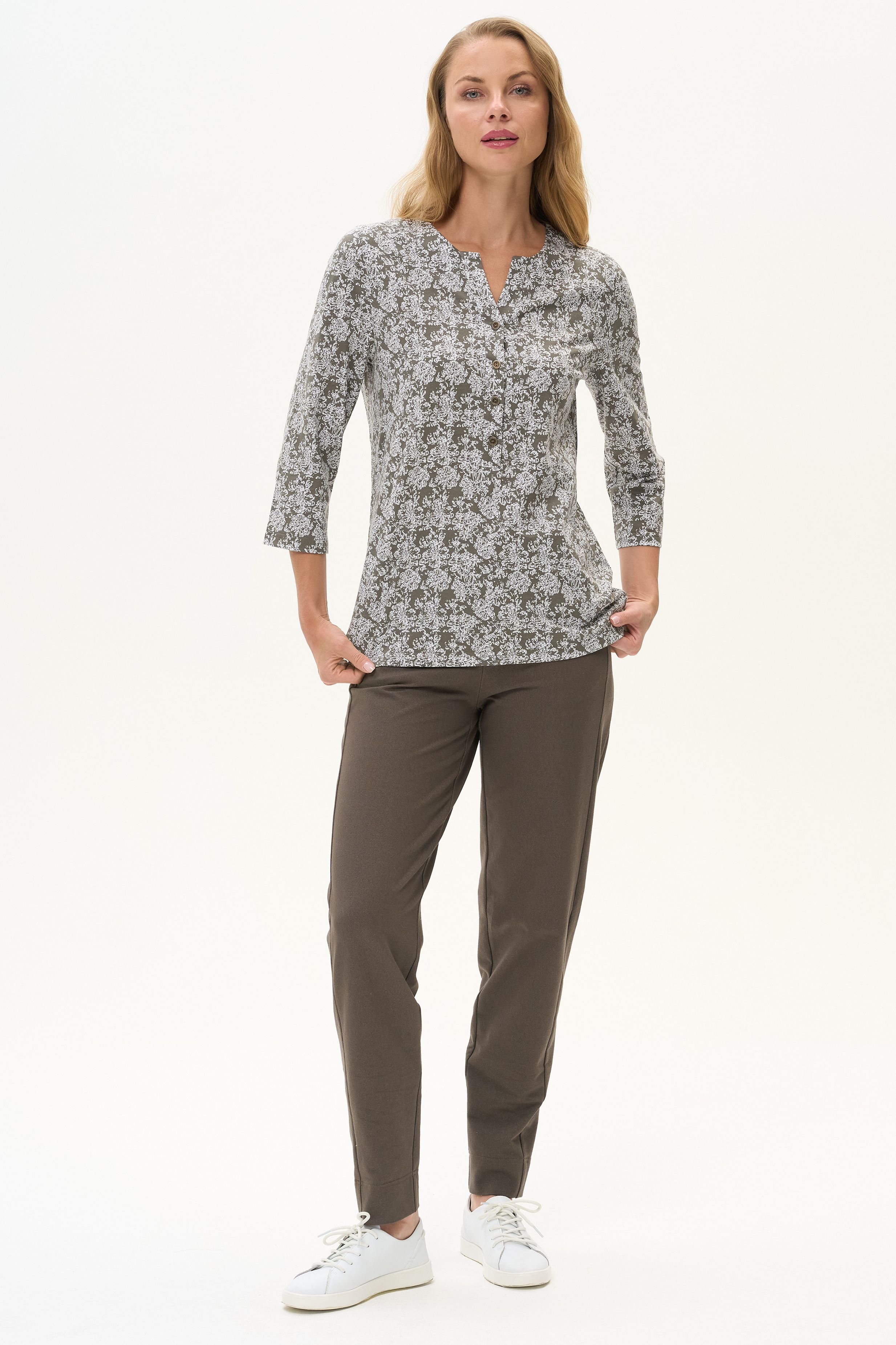 Описание: Блузка прямого силуэта из хлопкового трикотажного полотна. Круглый вырез горловины с планкой-застежкой на четыре пуговицы. Рукава длинной 3/4. Рост модели на фото 178 см.