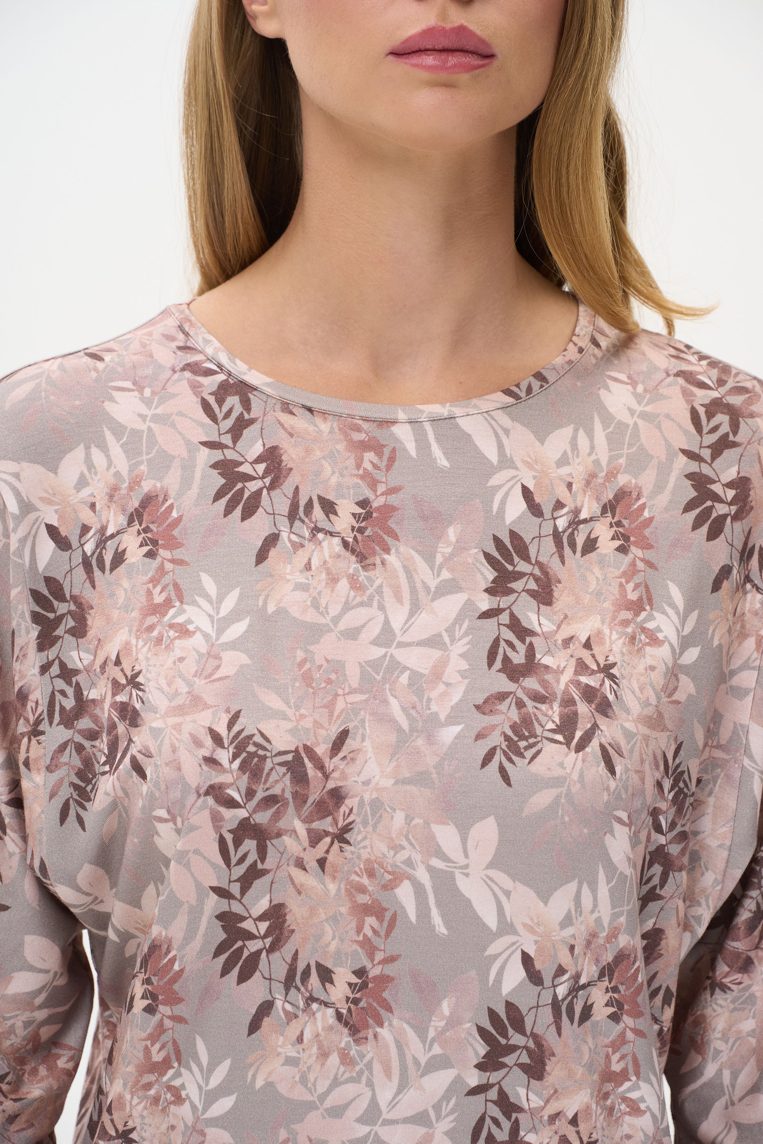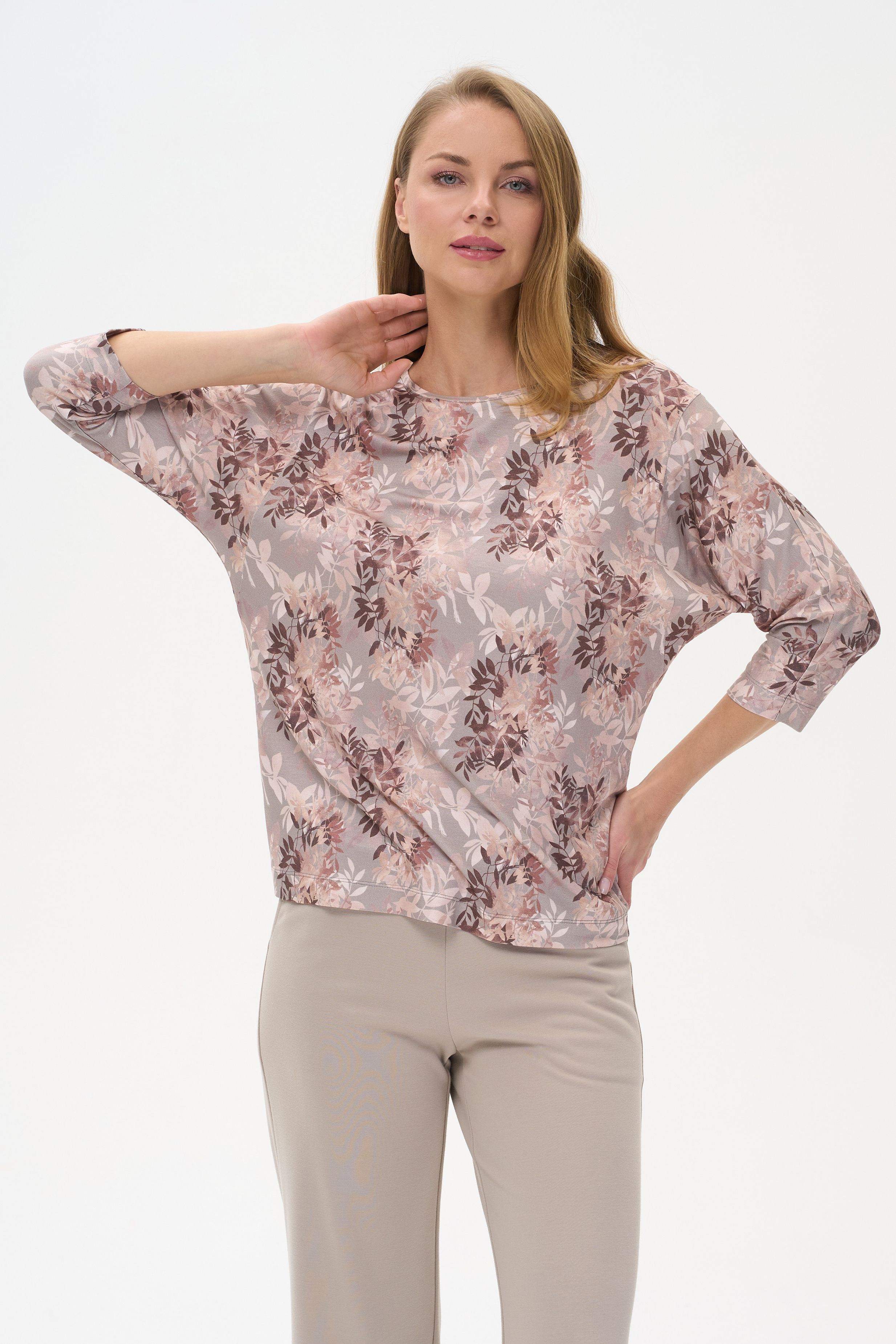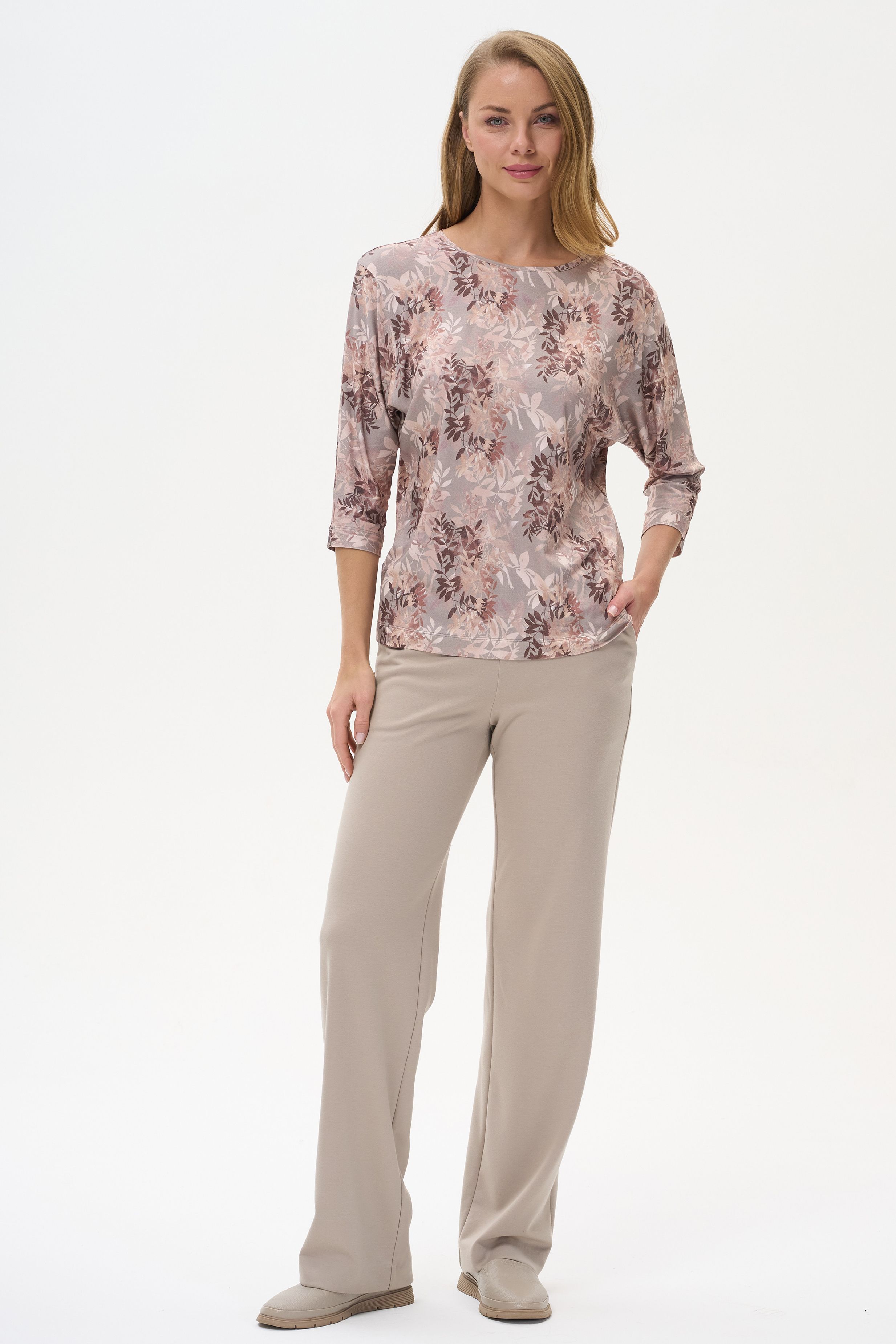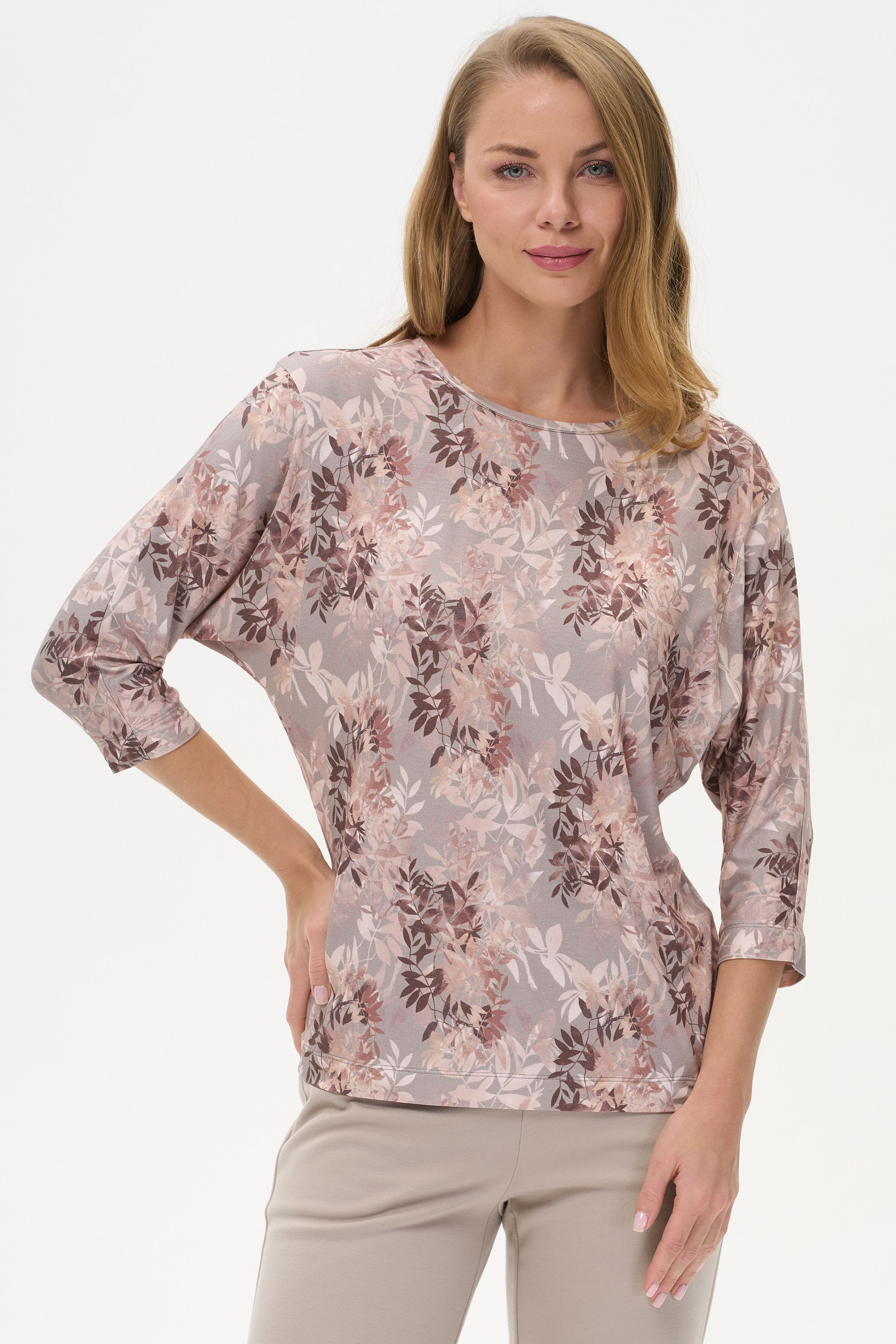 Описание: Блузка из вискозного трикотажного полотна с эластаном с эффектной цифровой печатью. Вырез- округлой формы. Комбинированный покрой рукава - по полочке- цельнокроенный (летучая мышь), по спинке со швом. Длина рукава 3/4. Рост модели на фото 178 см.