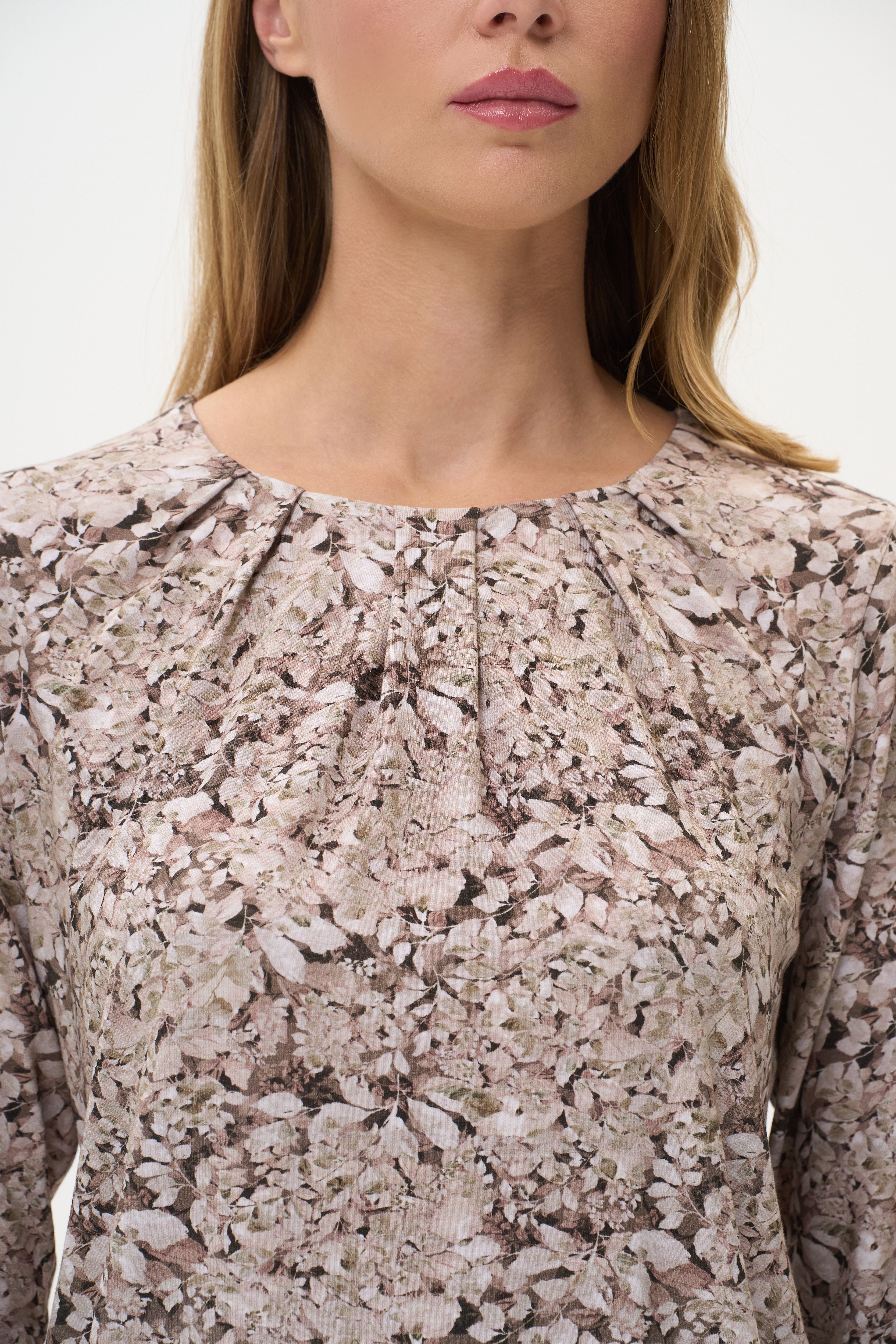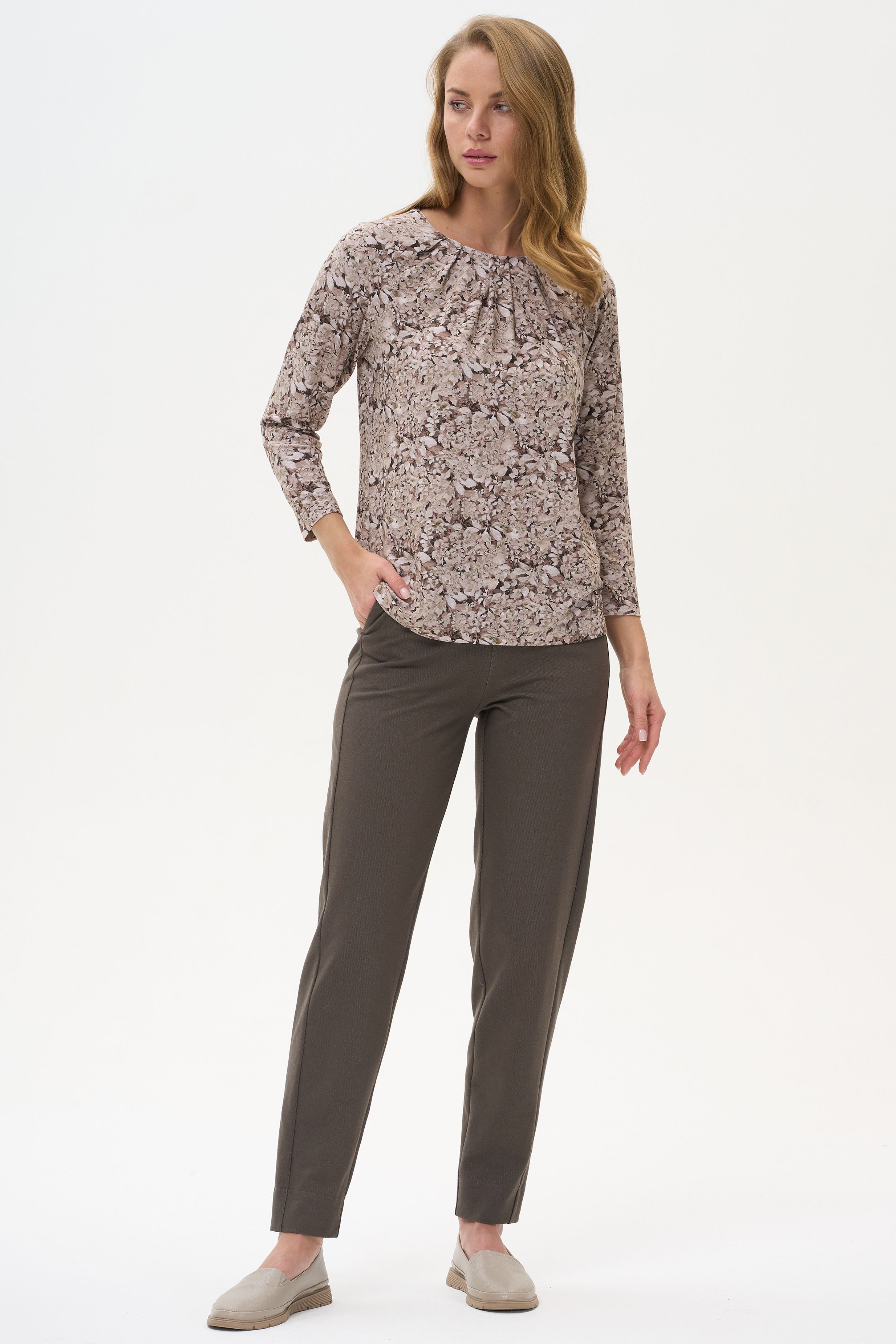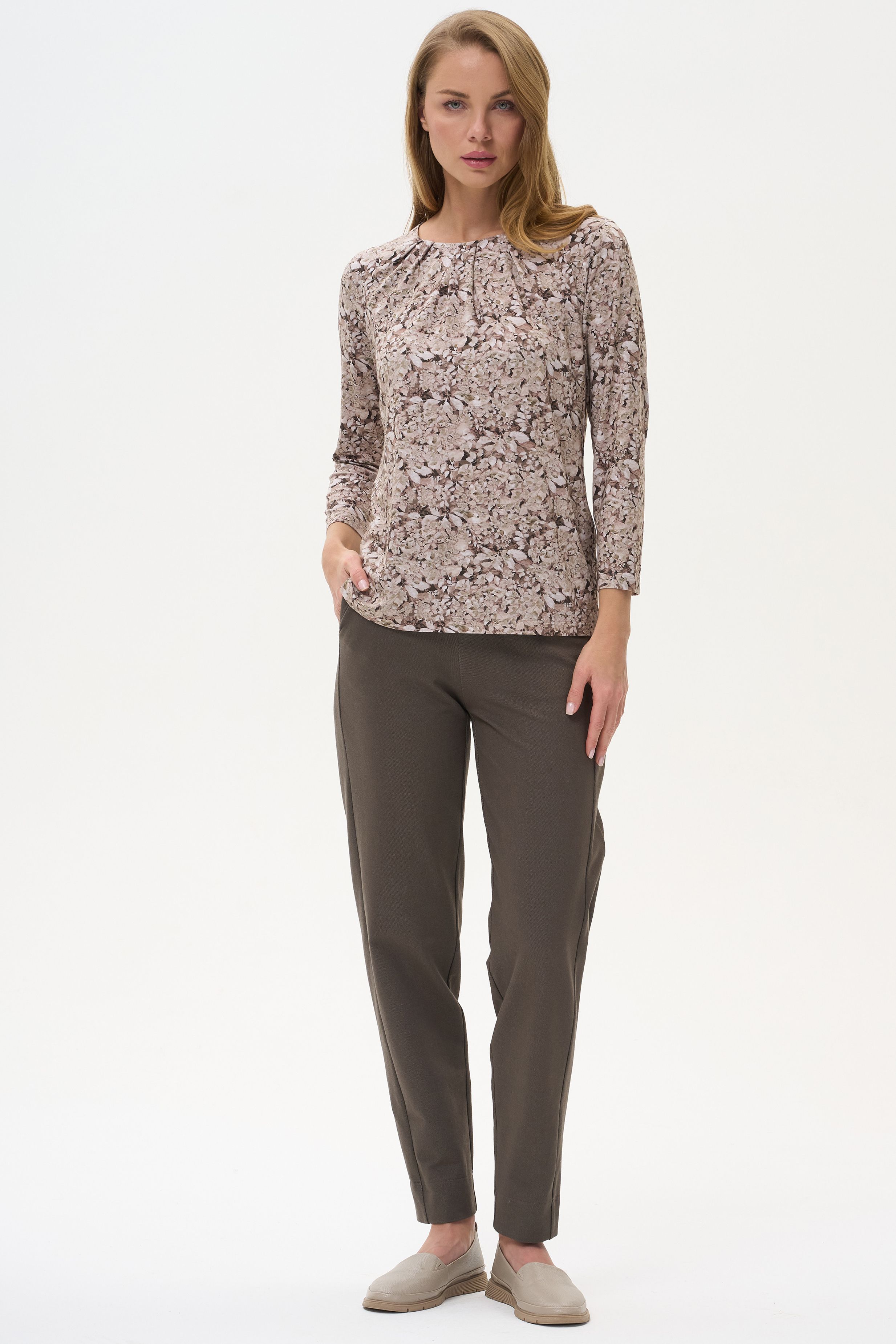 Описание: Блузка выполнена из вискозного полотна. Модель с округлой горловиной и мягкими складками. Втачные длинные рукава. Рост модели на фото 178 см.