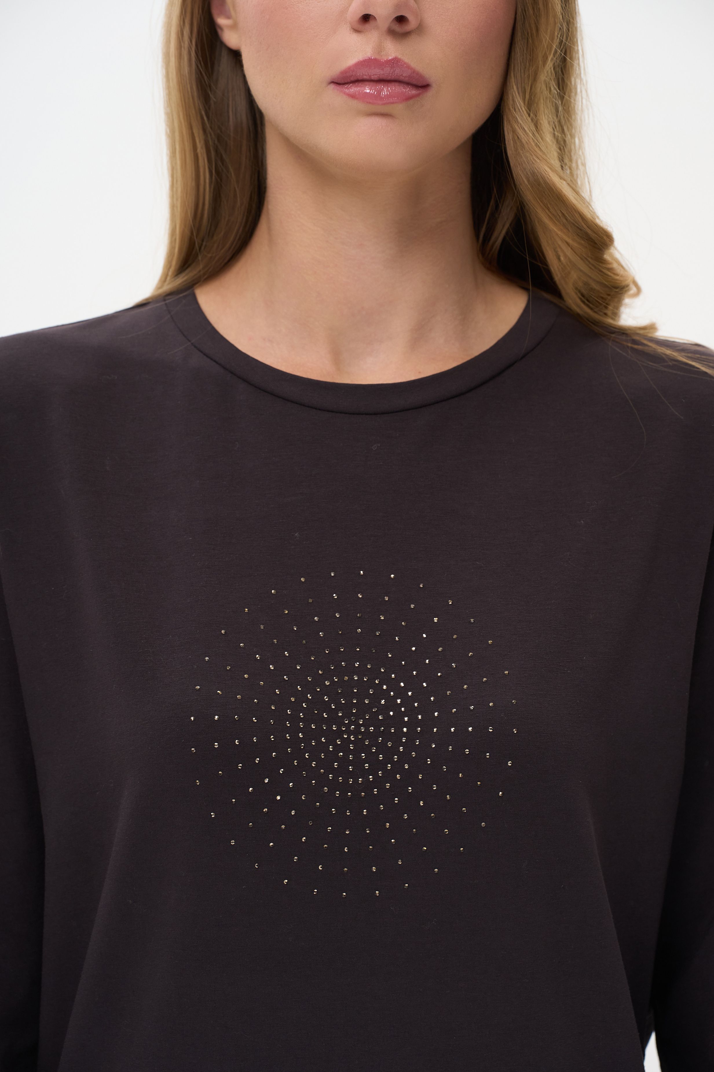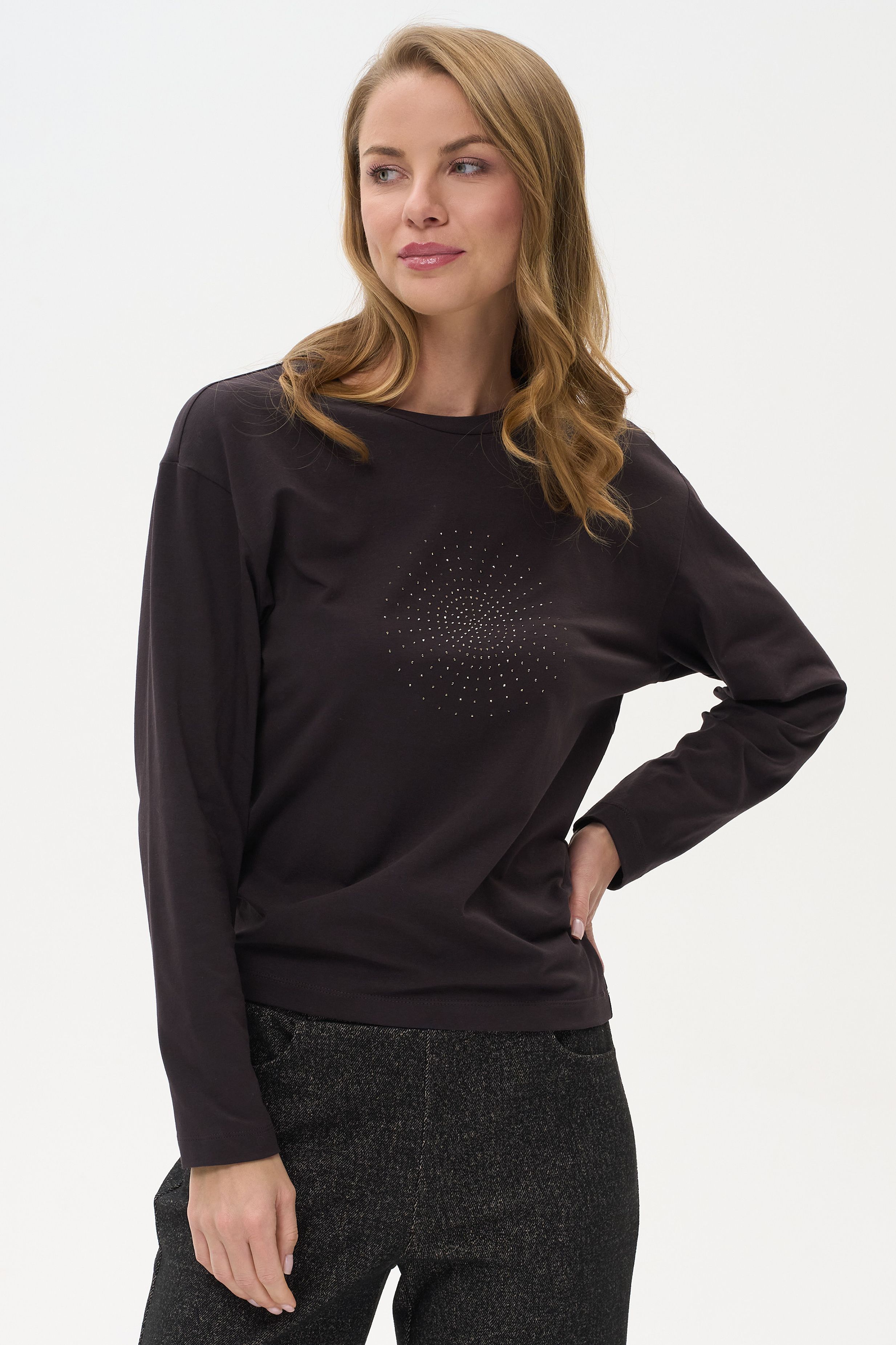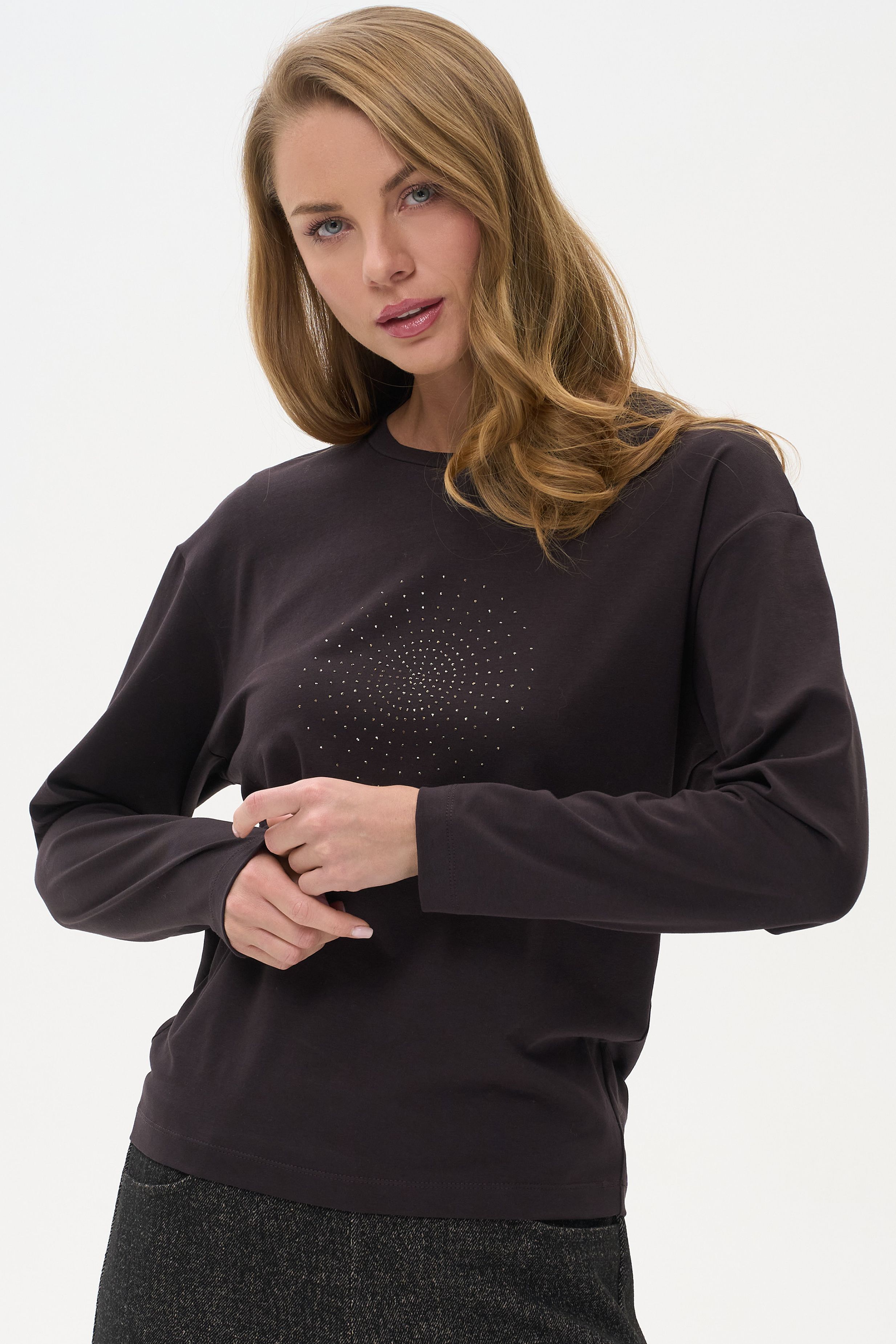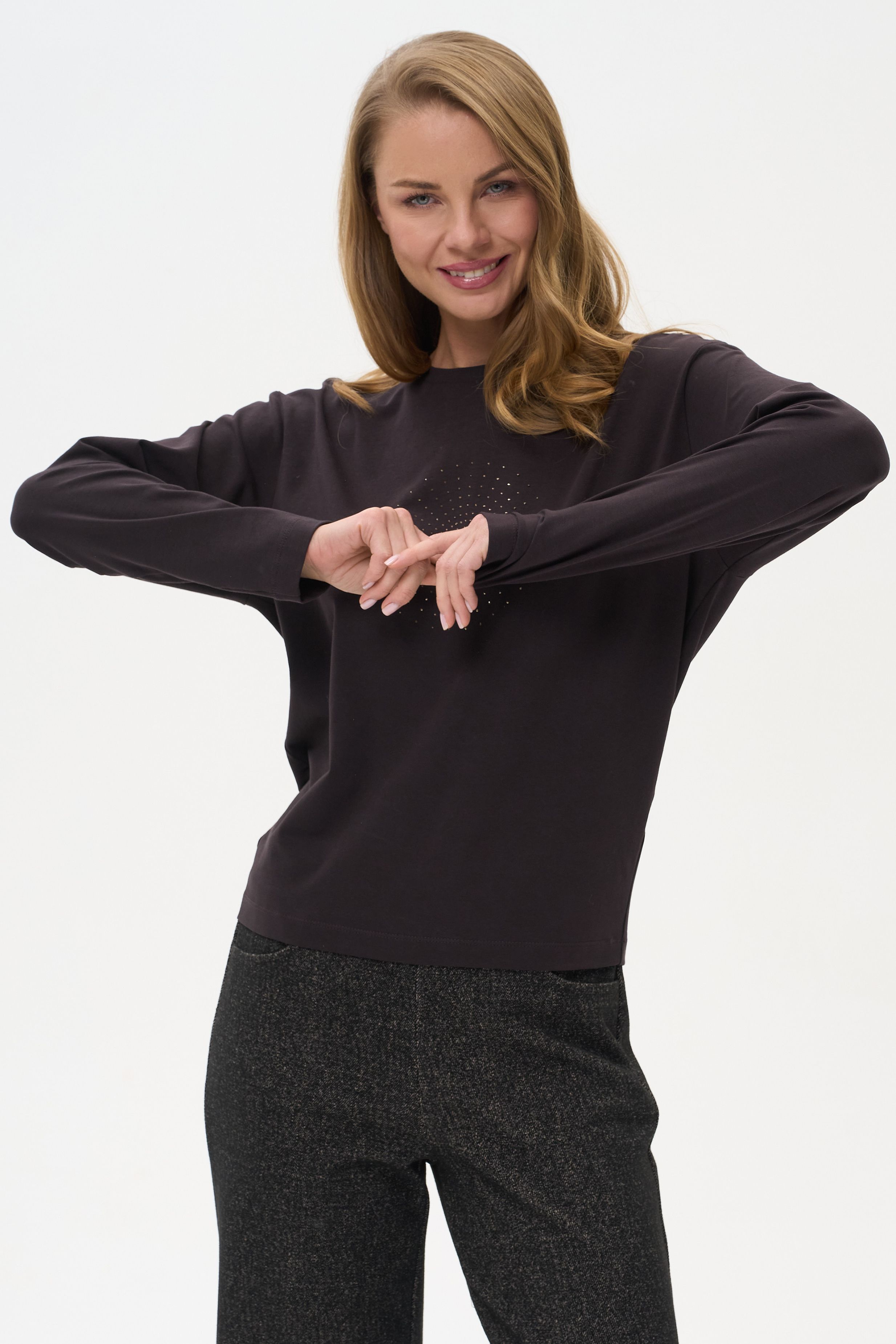 Описание: Лонгслив с принтом прямого силуэта, выполнен из хлопкового трикотажного полотна с эластаном. Круглый вырез горловины, длинные втачные рукава. Рост модели на фото 175.