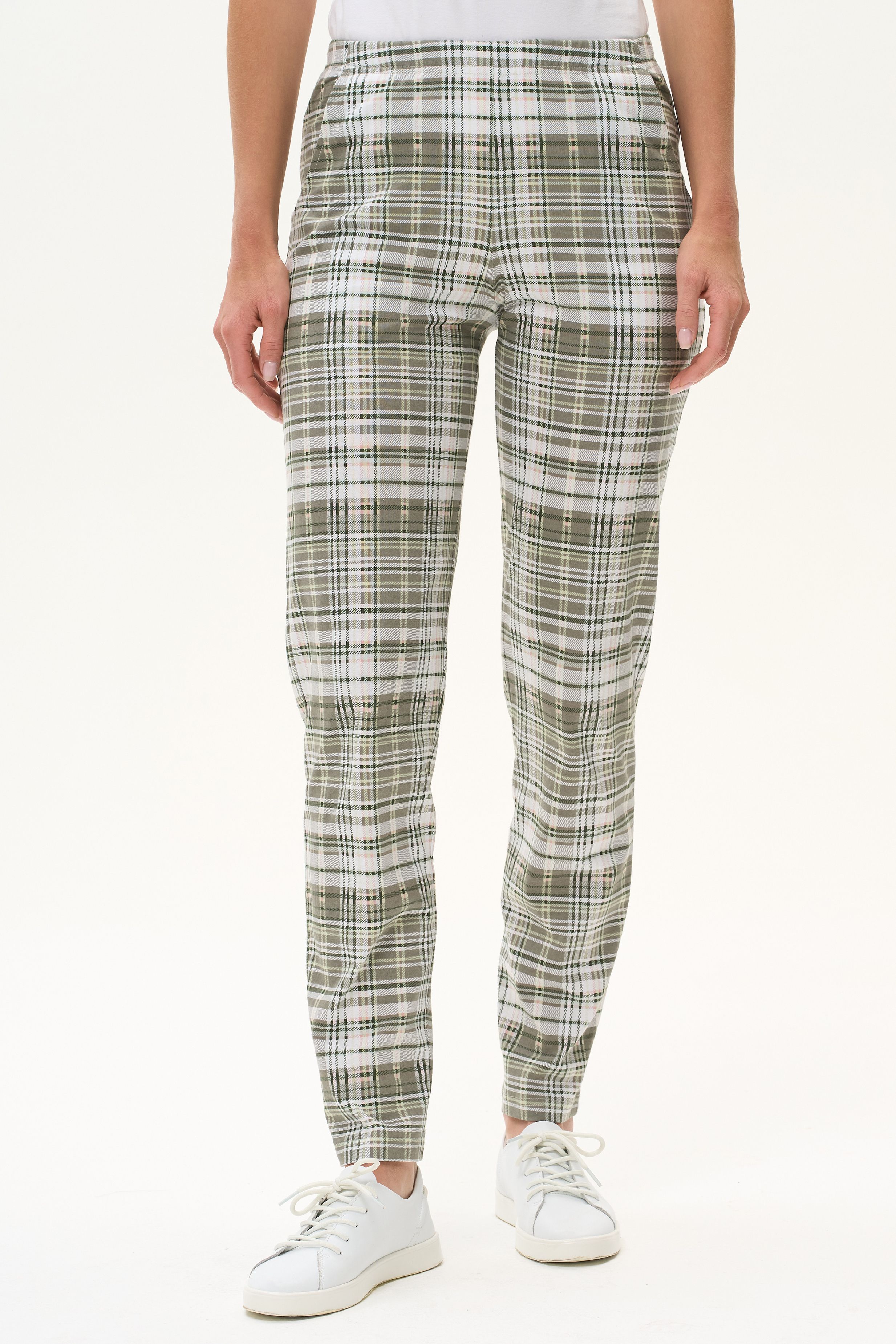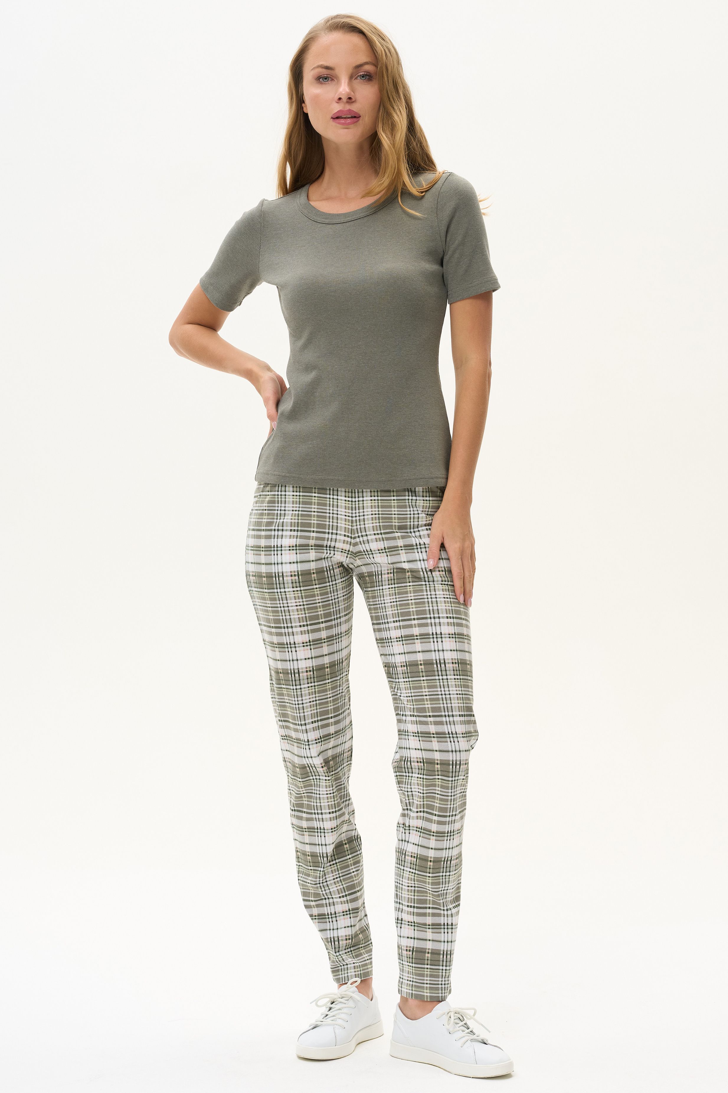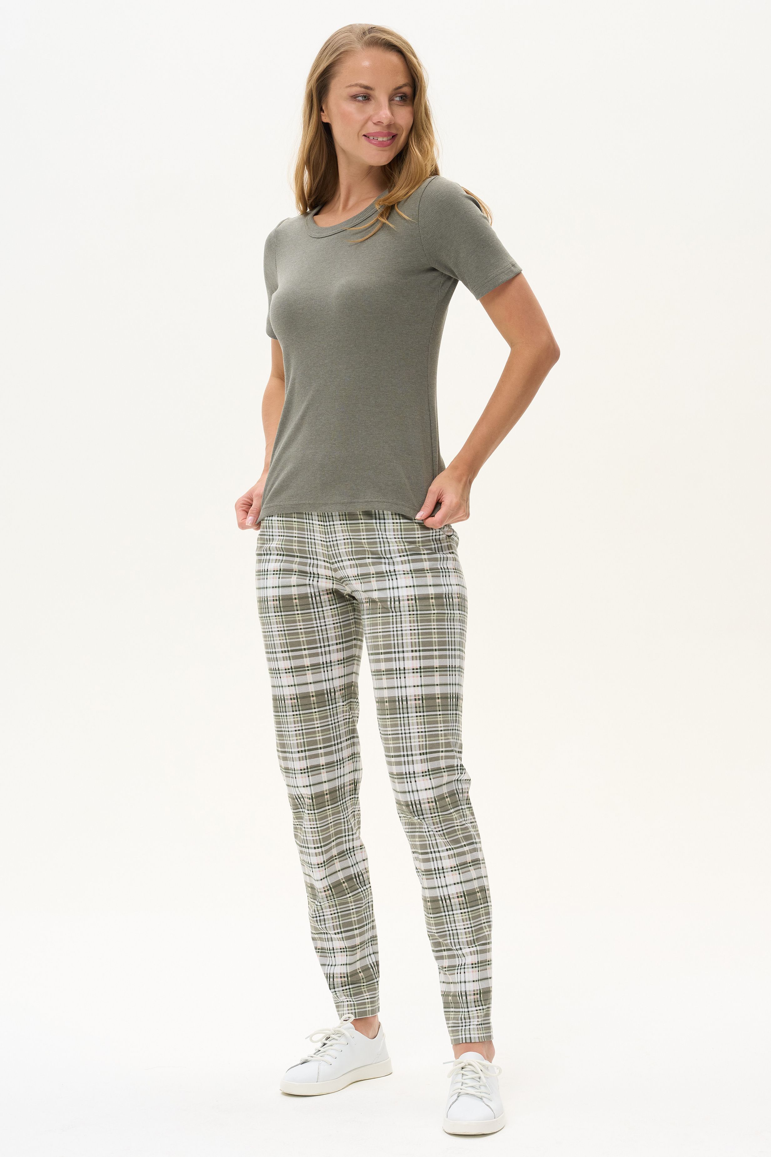 Описание: Зауженные брюки с карманами из хлопкового трикотажного полотна. Пояс с эластичной лентой внутри. Длина брюк по боковому шву в 44 размере - 103см. Рост модели 178.