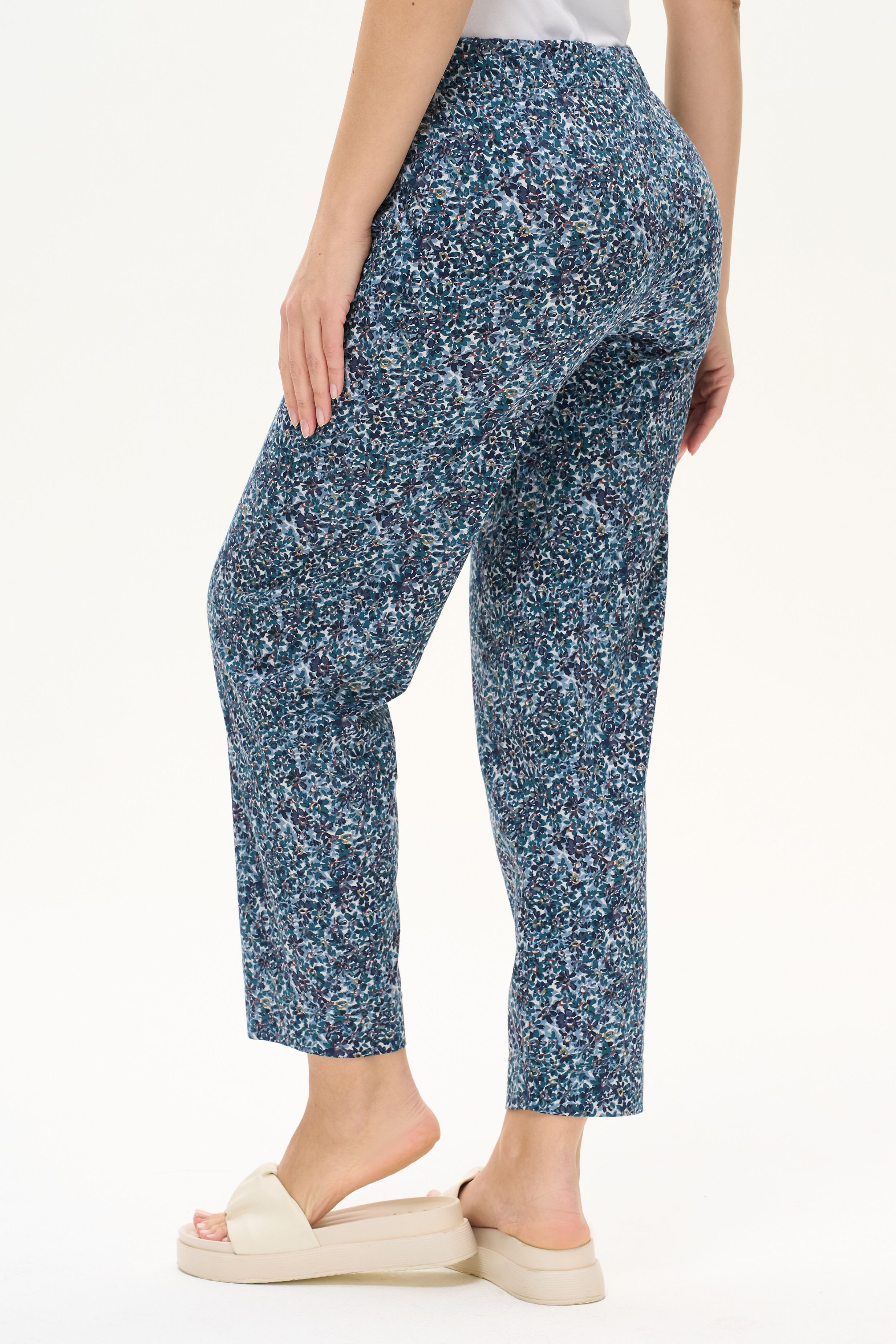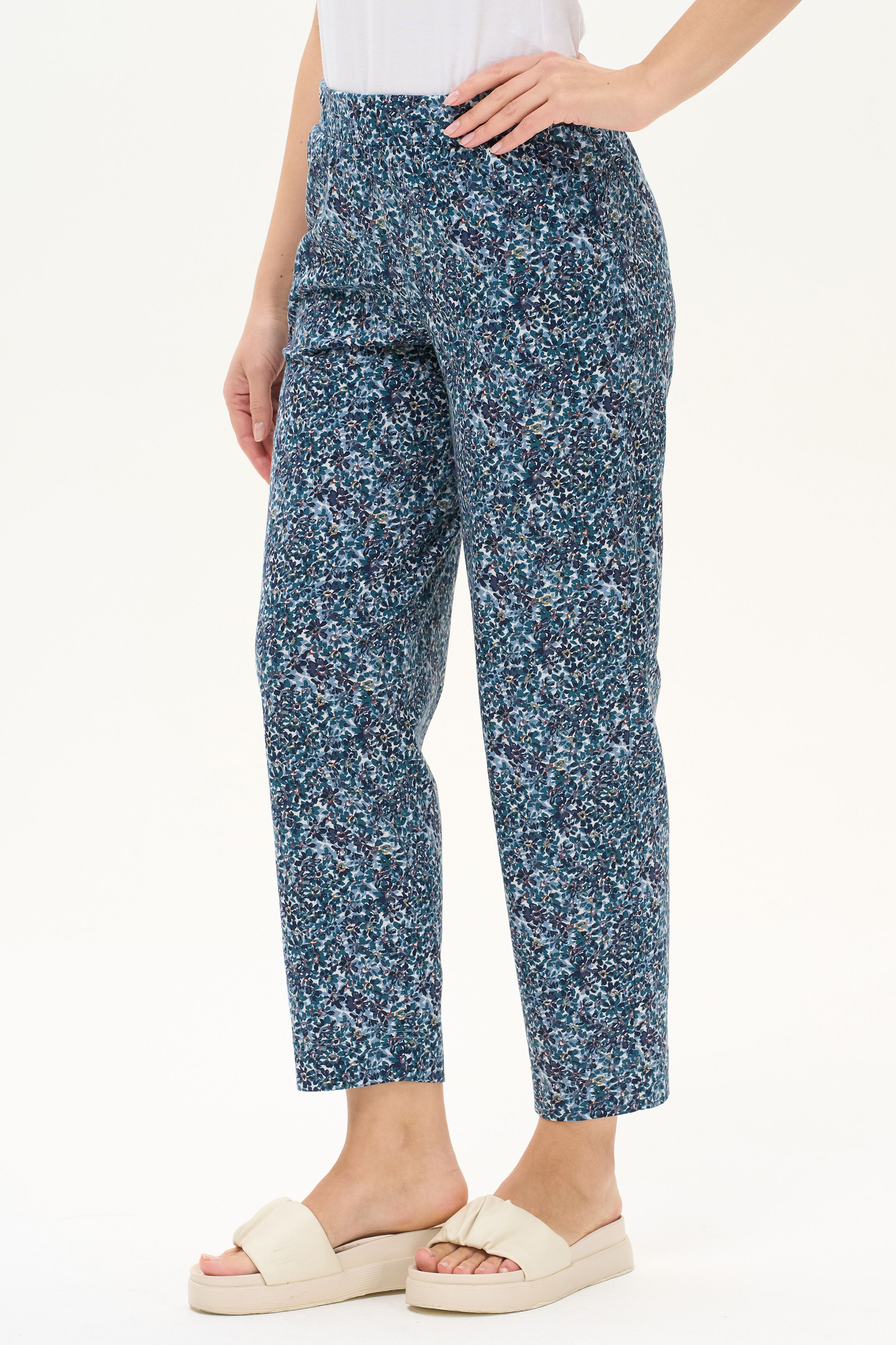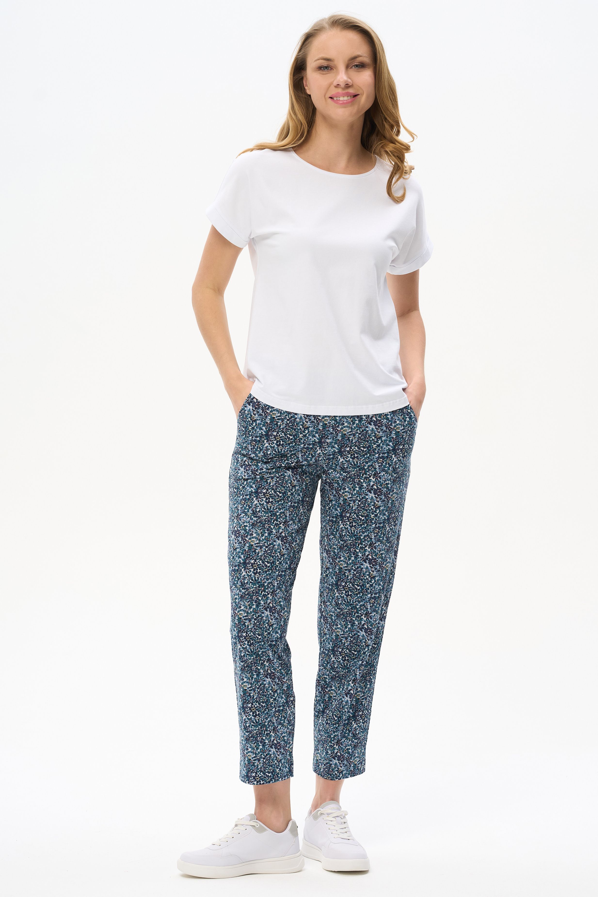 Описание: Универсальные брюки длиной 7/8 из хлопкового полотна. Пояс с эластичной лентой, два фигурных боковых кармана. Рост модели на фото 178.