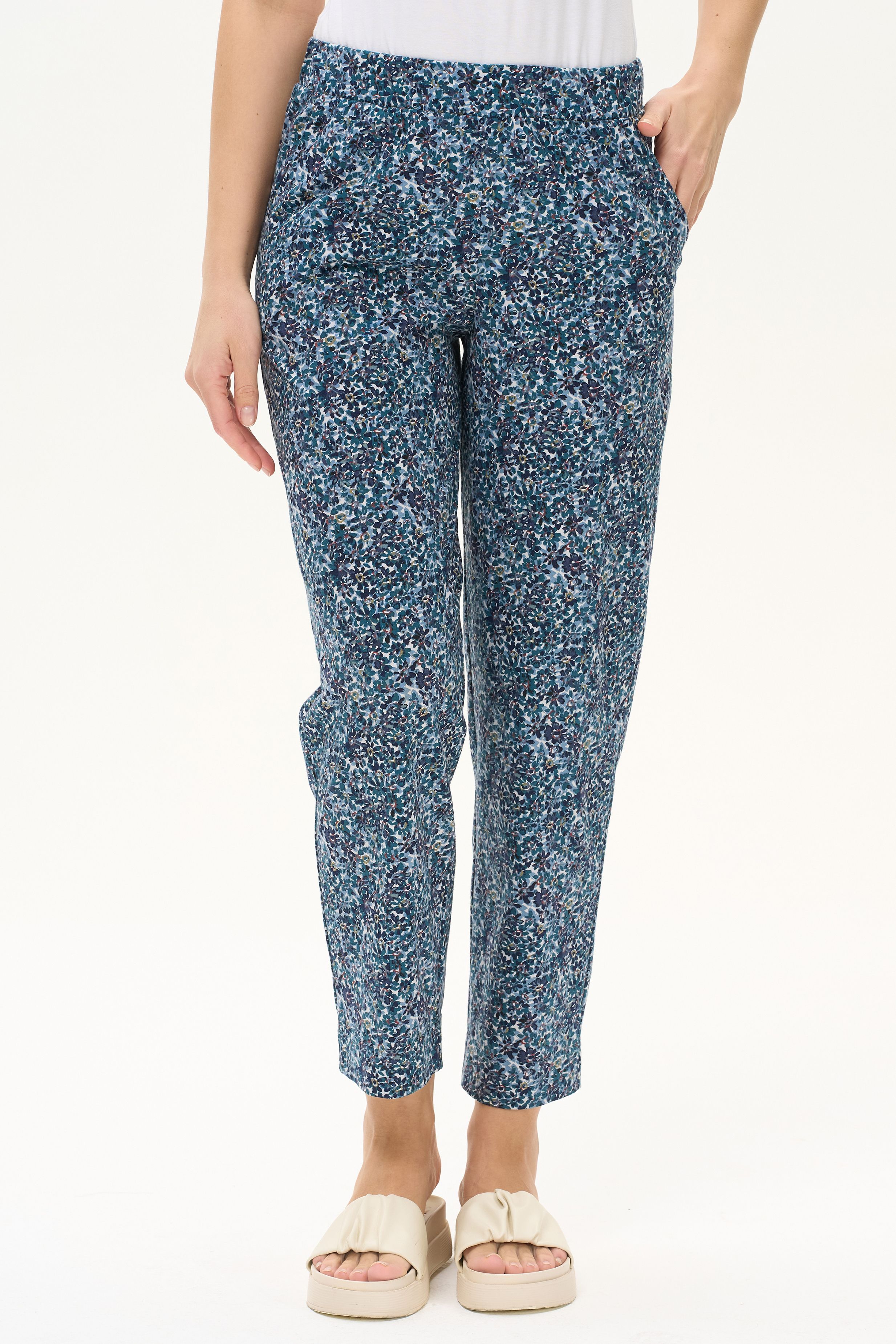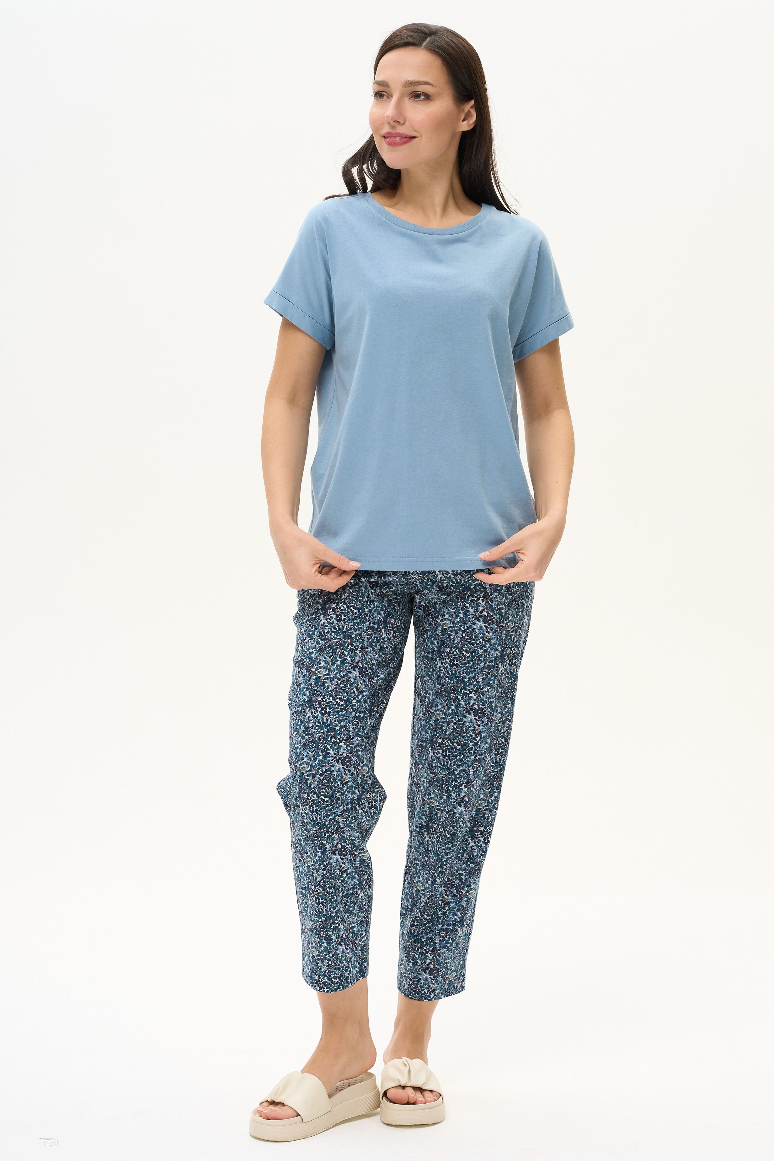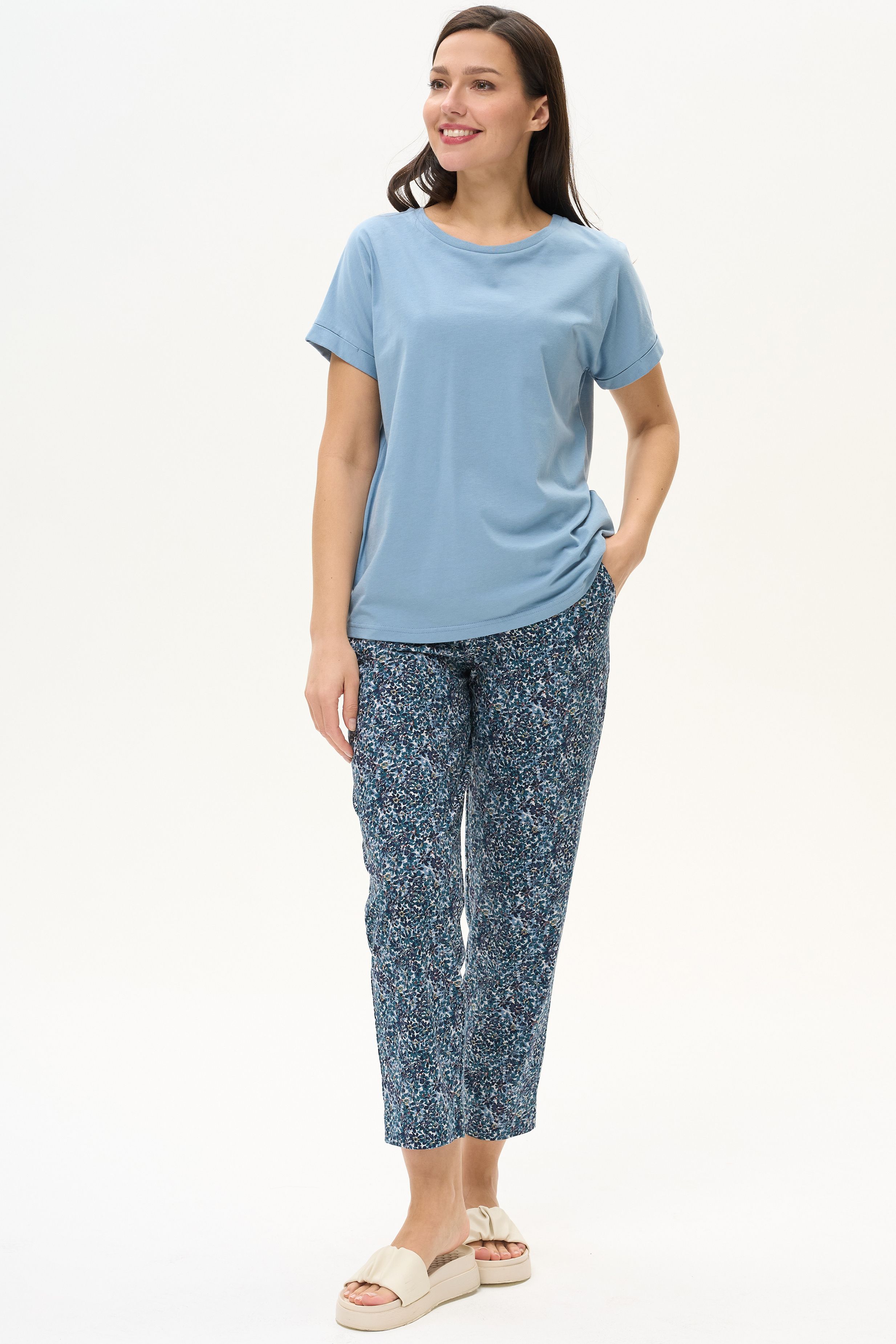 Описание: Универсальные брюки длиной 7/8 из хлопкового полотна. Пояс с эластичной лентой, два фигурных боковых кармана. Рост модели на фото 178.