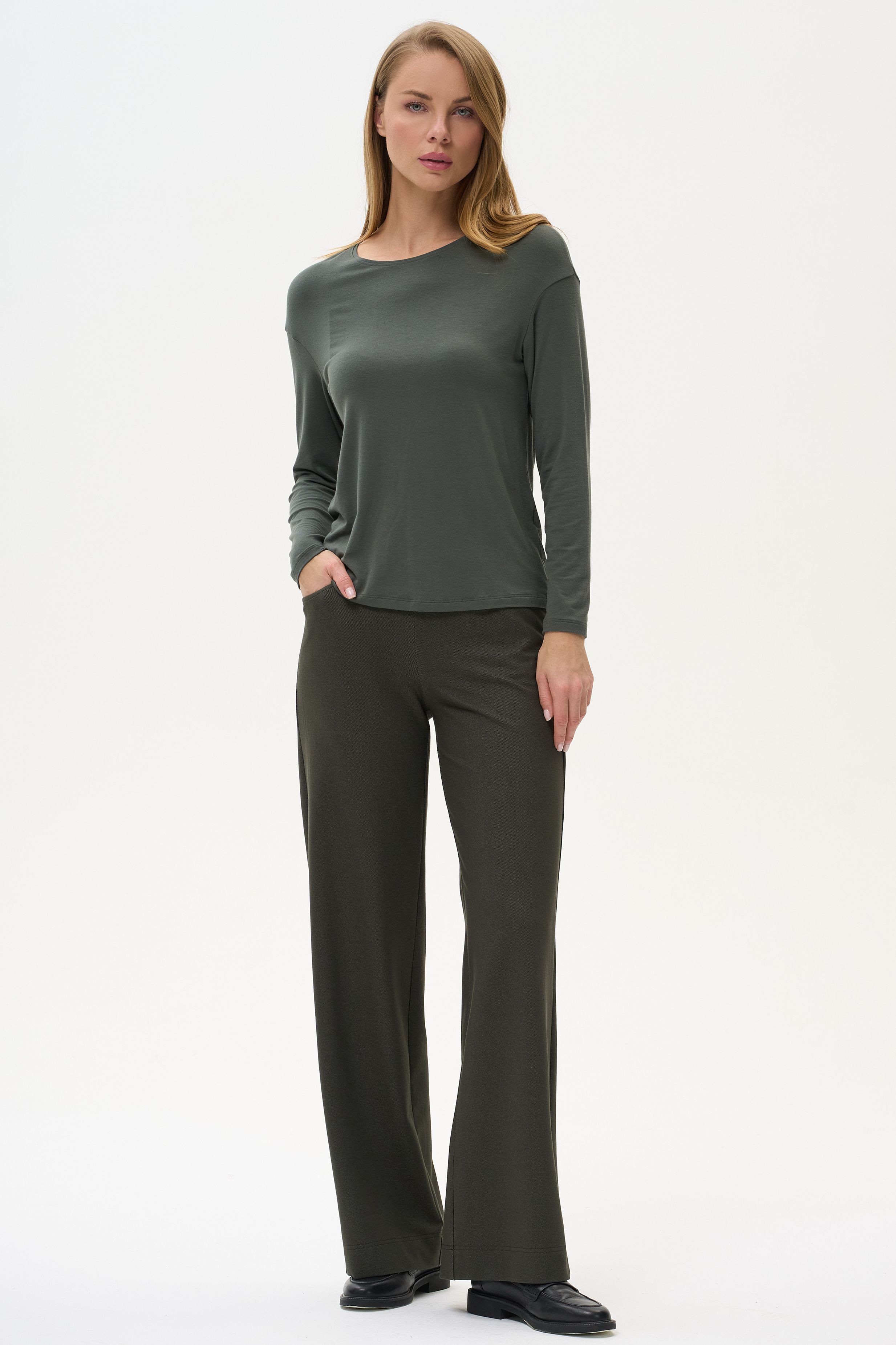Описание: Прямые брюки с высокой посадкой. Выполнены из хлопкового полотна джинскотт. Спереди фигурные карманы, пояс с эластичной лентой внутри. Длина по боковому шву (без пояса ) в 44 размере - 104 см. Рост модели на фото 178.