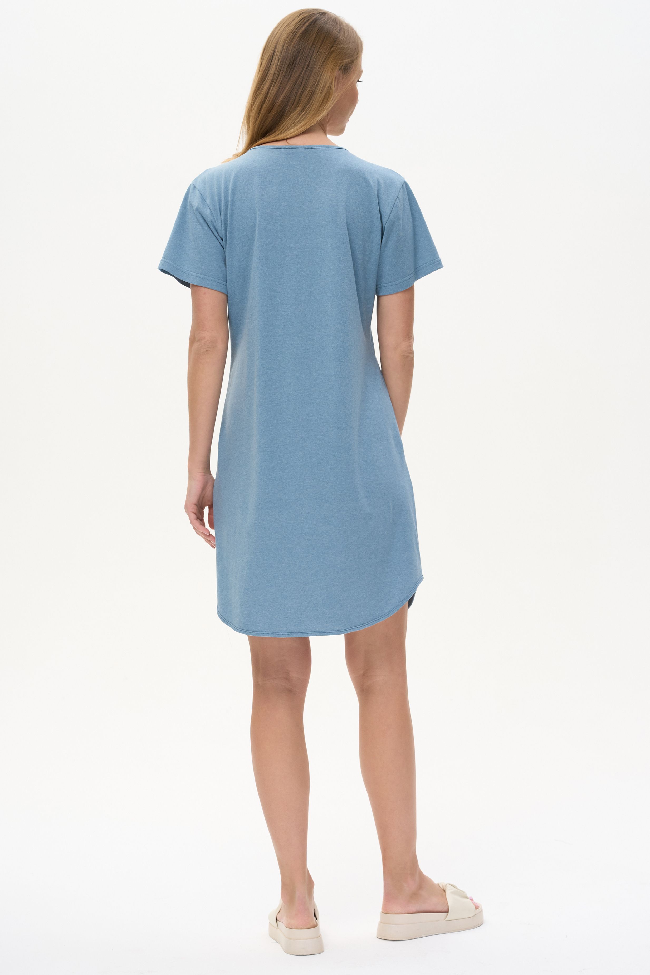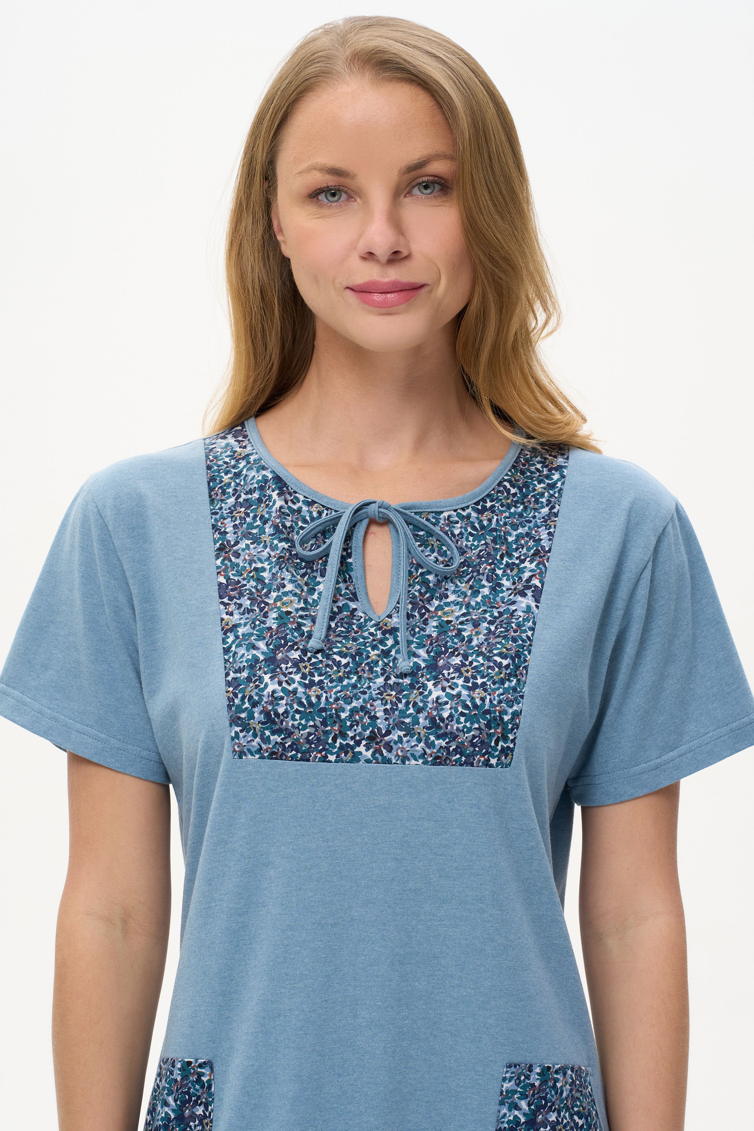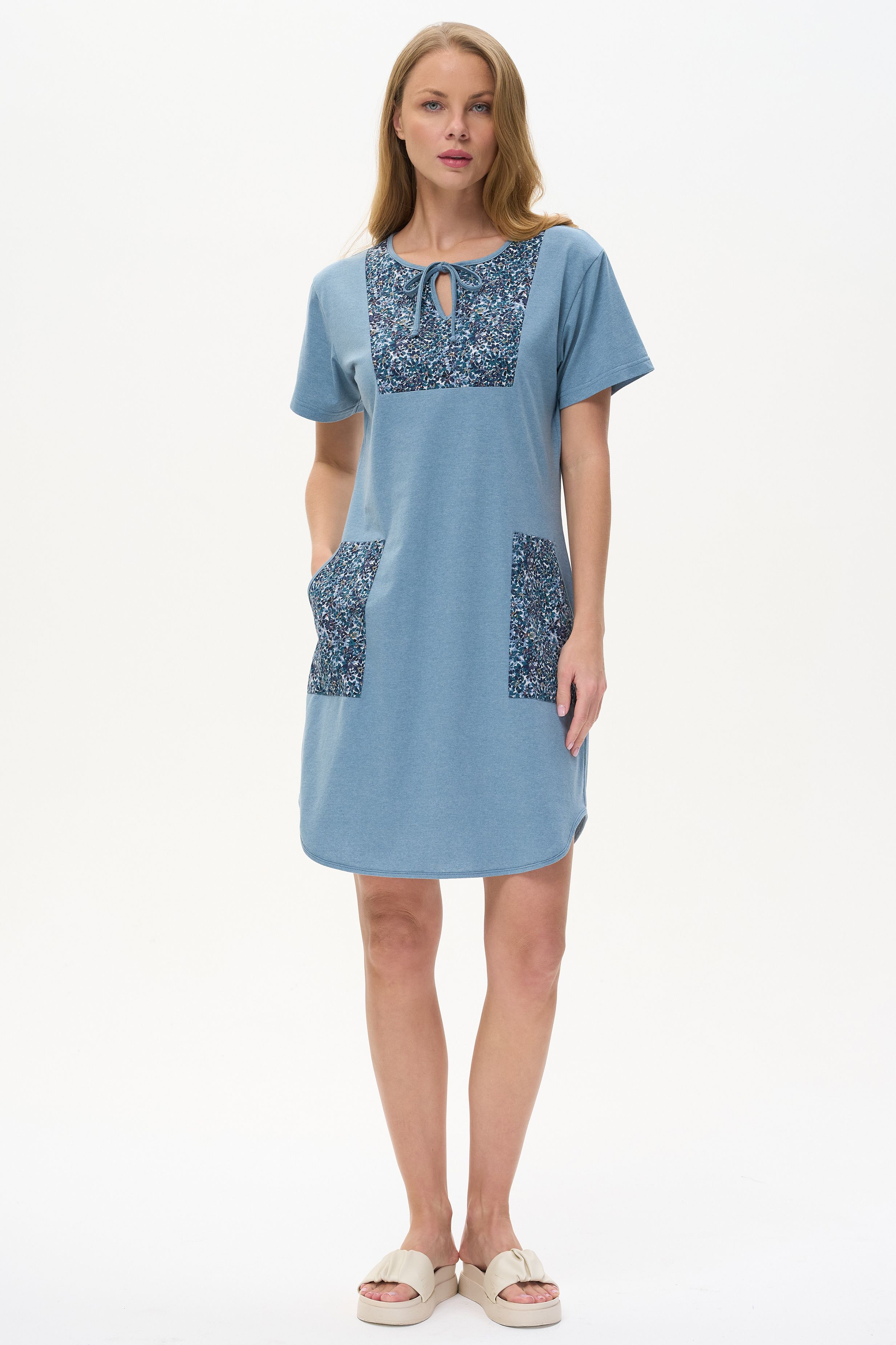 Описание: Платье А-силуэта выполнено из сочетания трикотажных полотен хлопкового и меланжевого качества пенье. Спереди фигурная кокетка с завязкой, накладные карманы. Короткие втачные рукава. Фигурная линия низа изделия окантована. Длина платья до колена. Рост модели на фото 178 см.