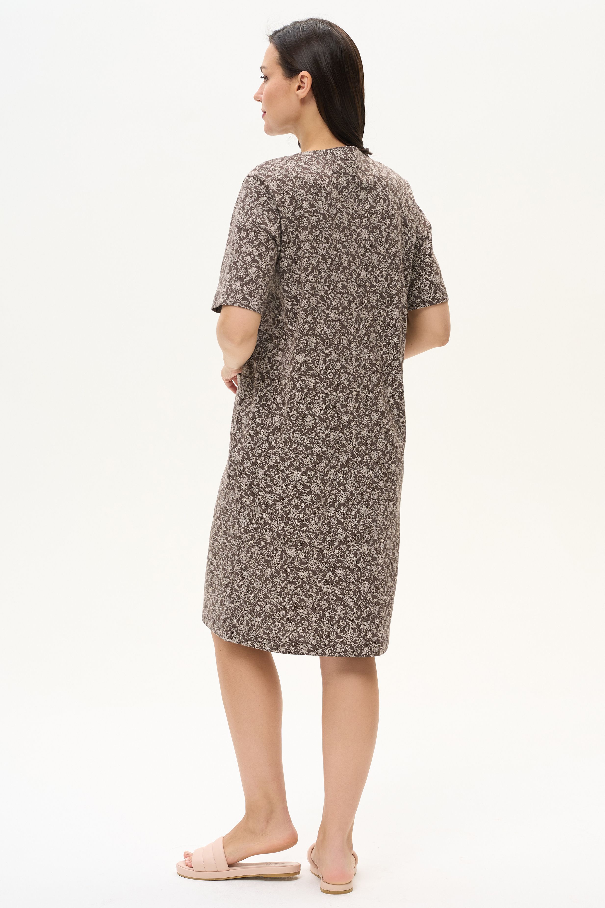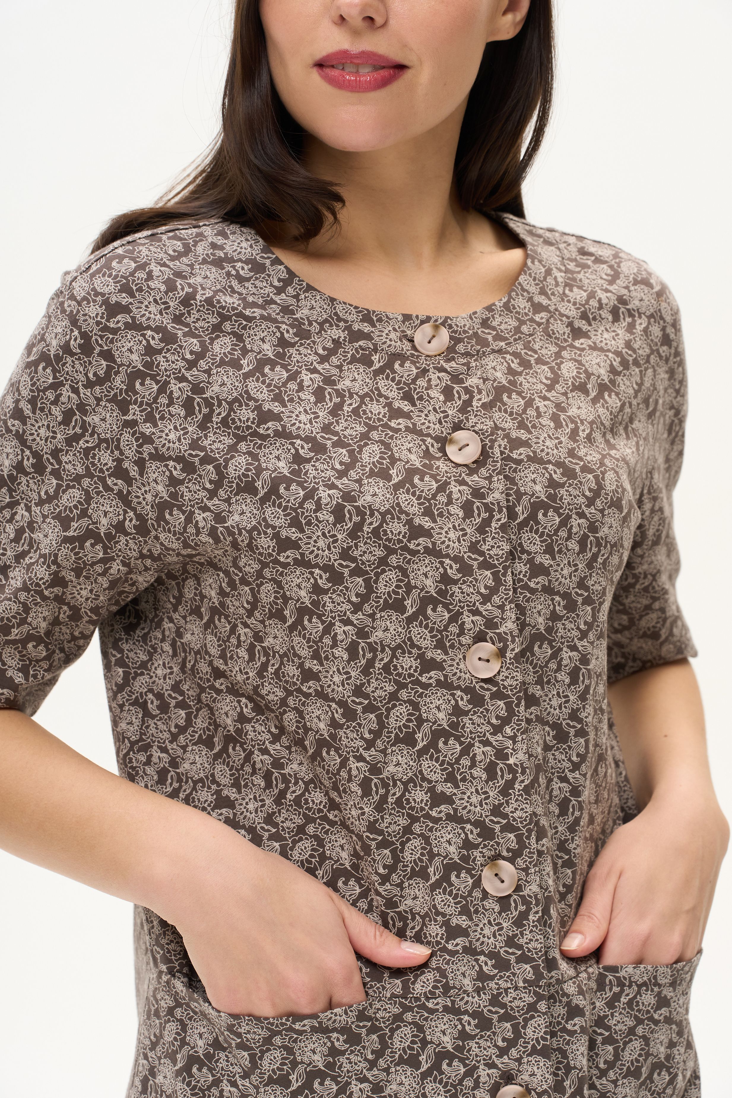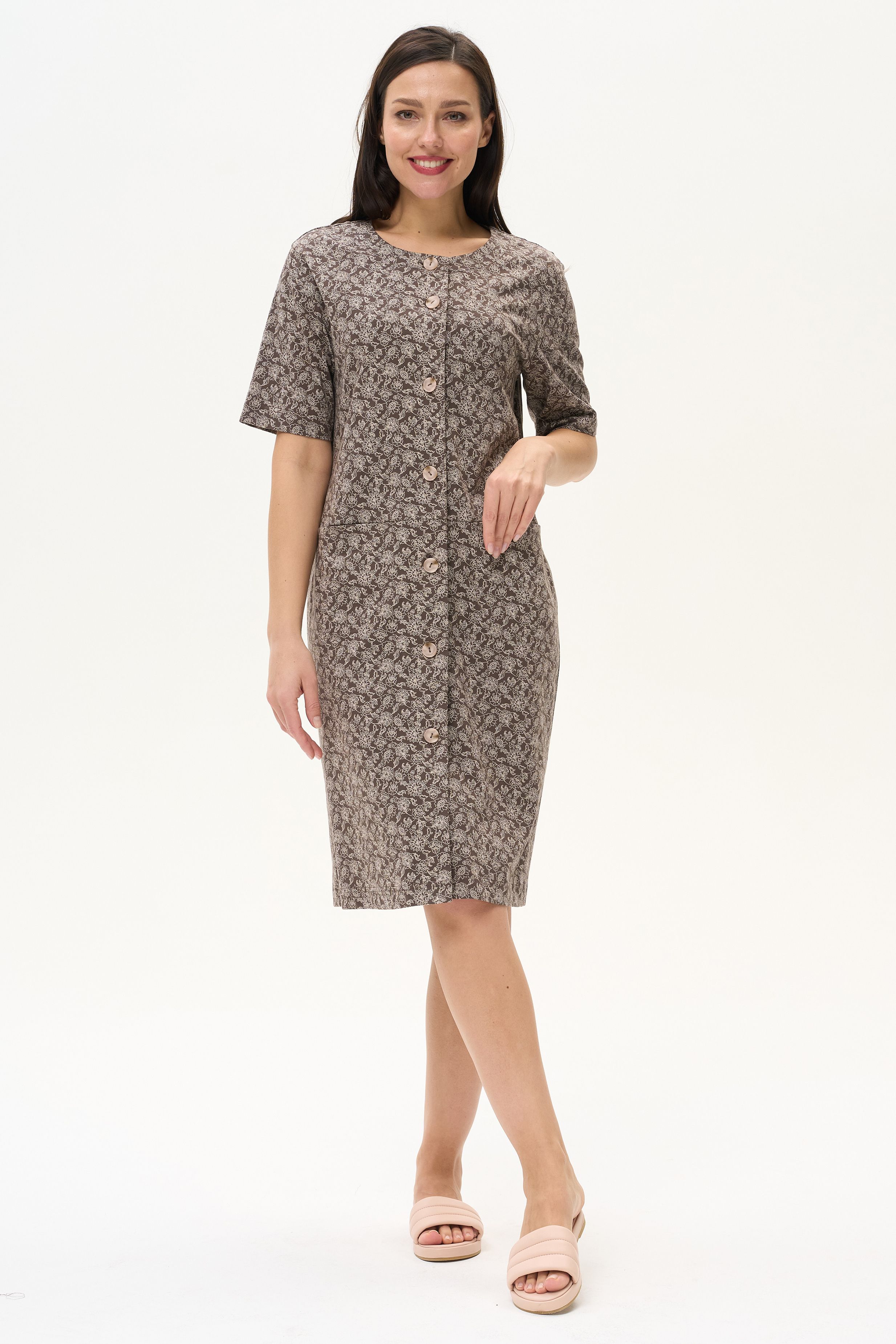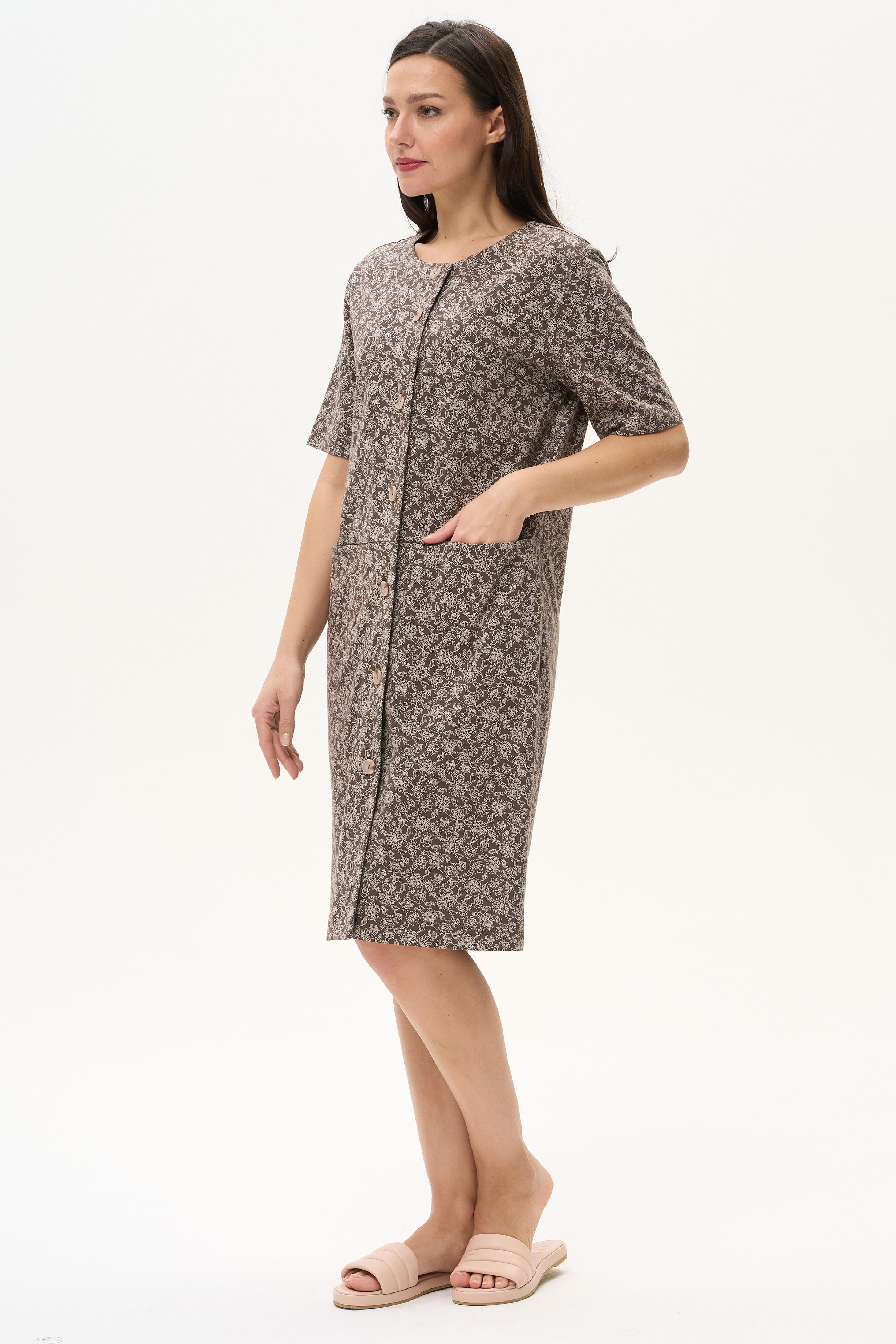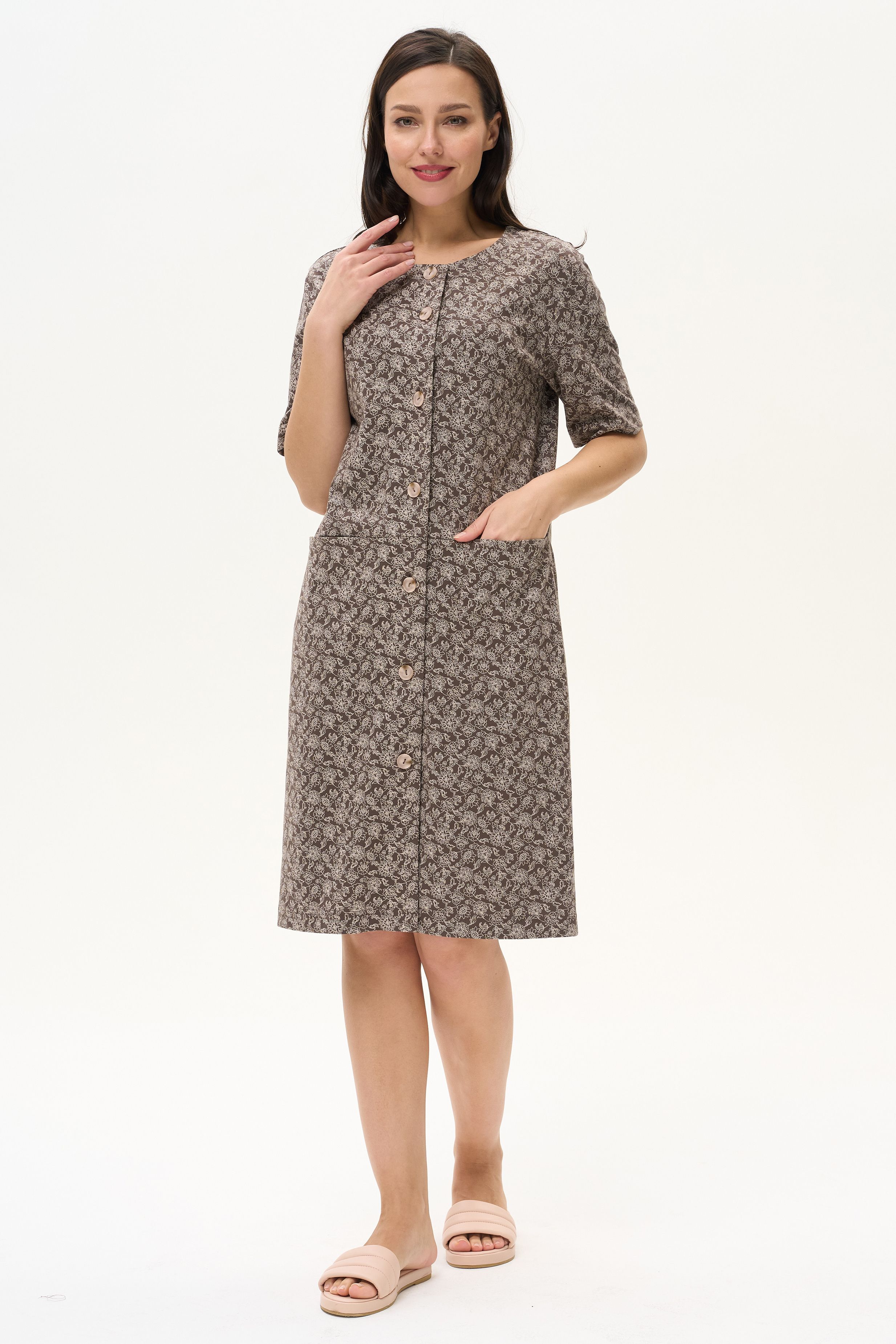 Описание: Халат прямого силуэта из хлопкового трикотажного полотна. Круглый вырез горловины, центральная застежка на пуговицы, В подрезах полочки карманы. Втачные рукава 3/4. Длина изделия ниже колена. Рост модели на фото 175 см.