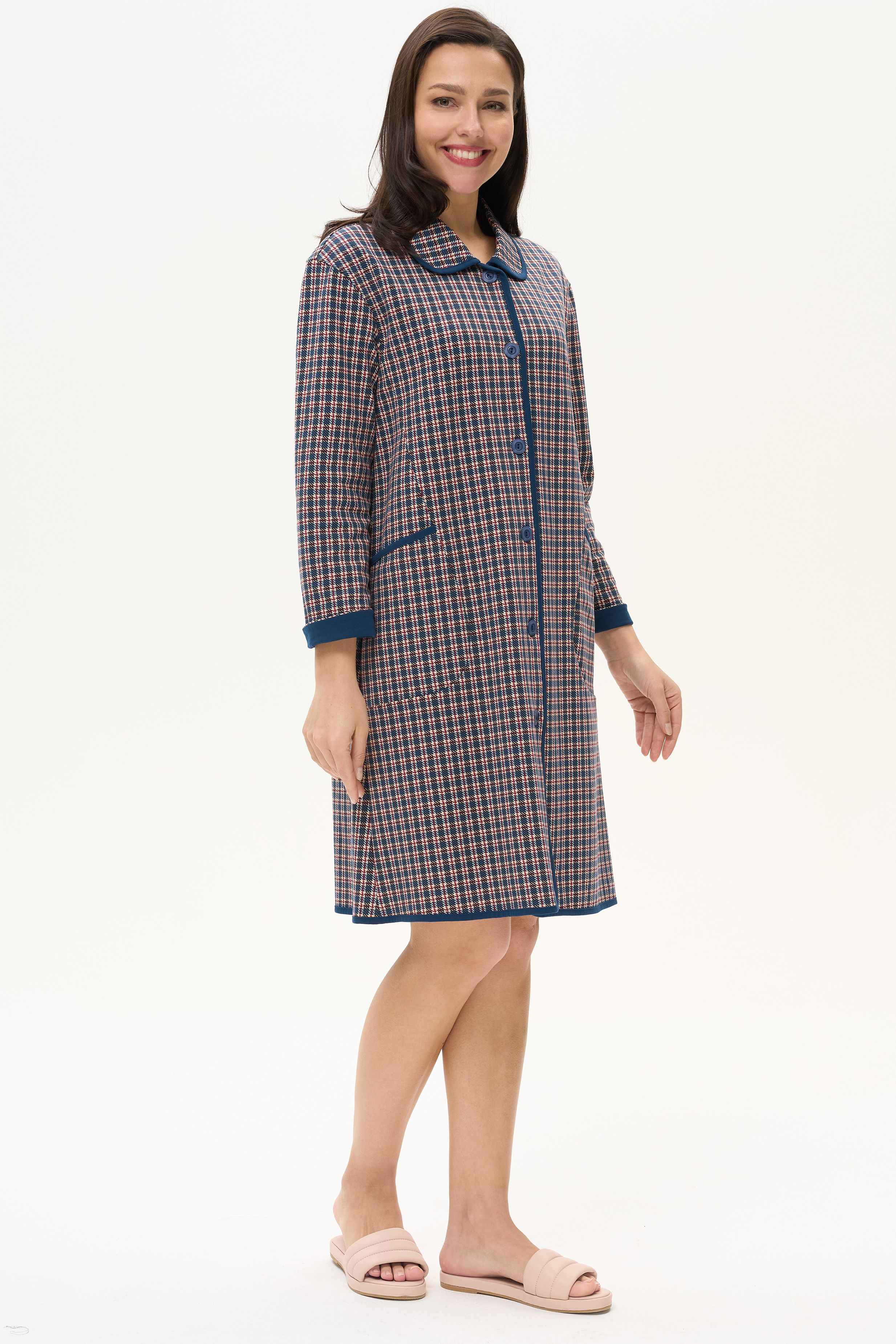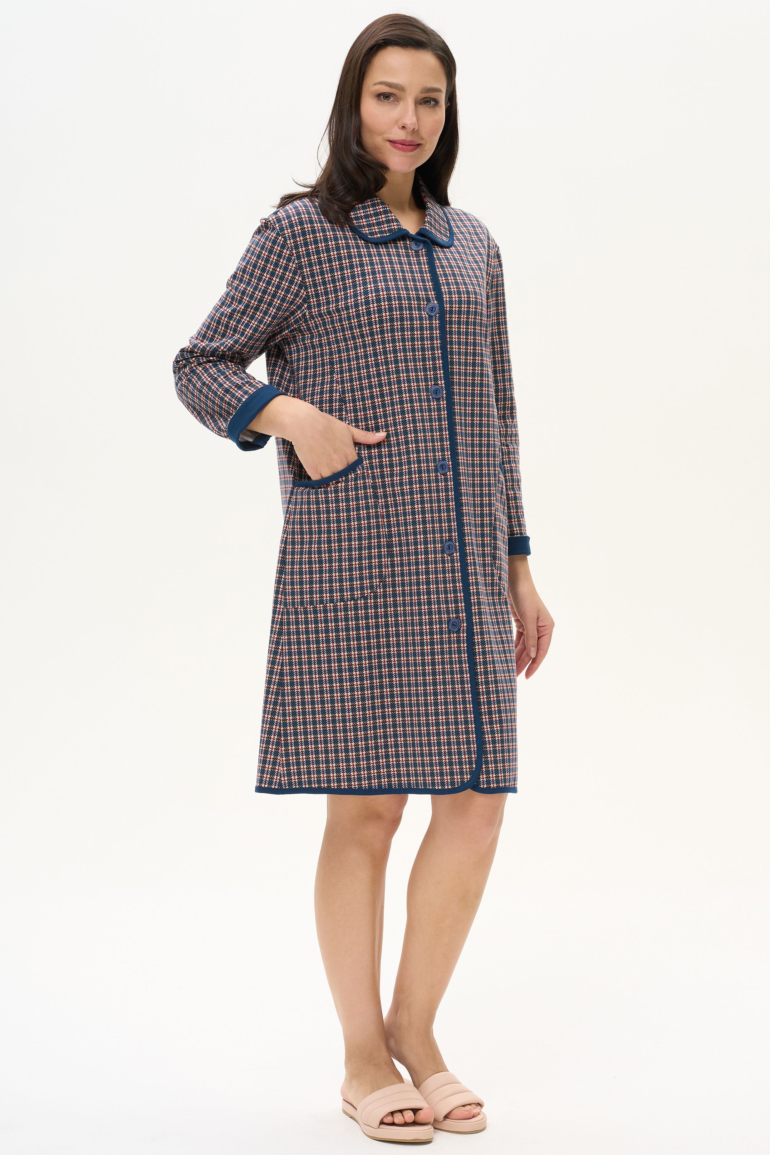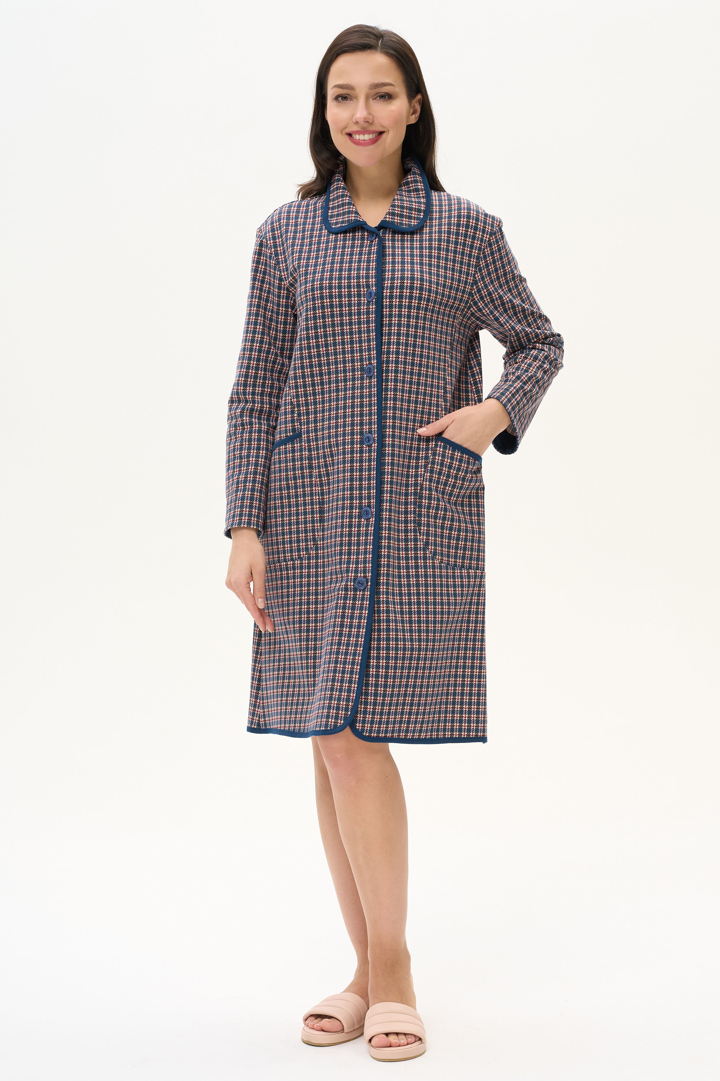 Описание: Тёплый халат из хлопкового трикотажного футера. Элегантный отложной воротник, длинные втачные рукава. Застёжка на пуговицы, накладные карманы. Рост модели на фото 170 см.