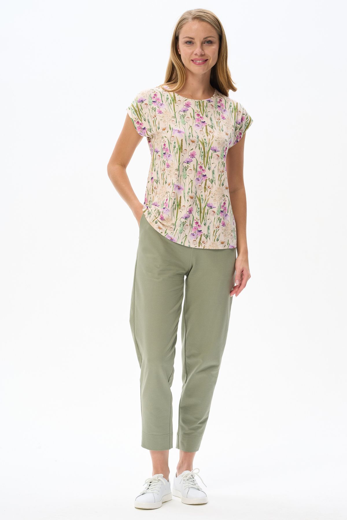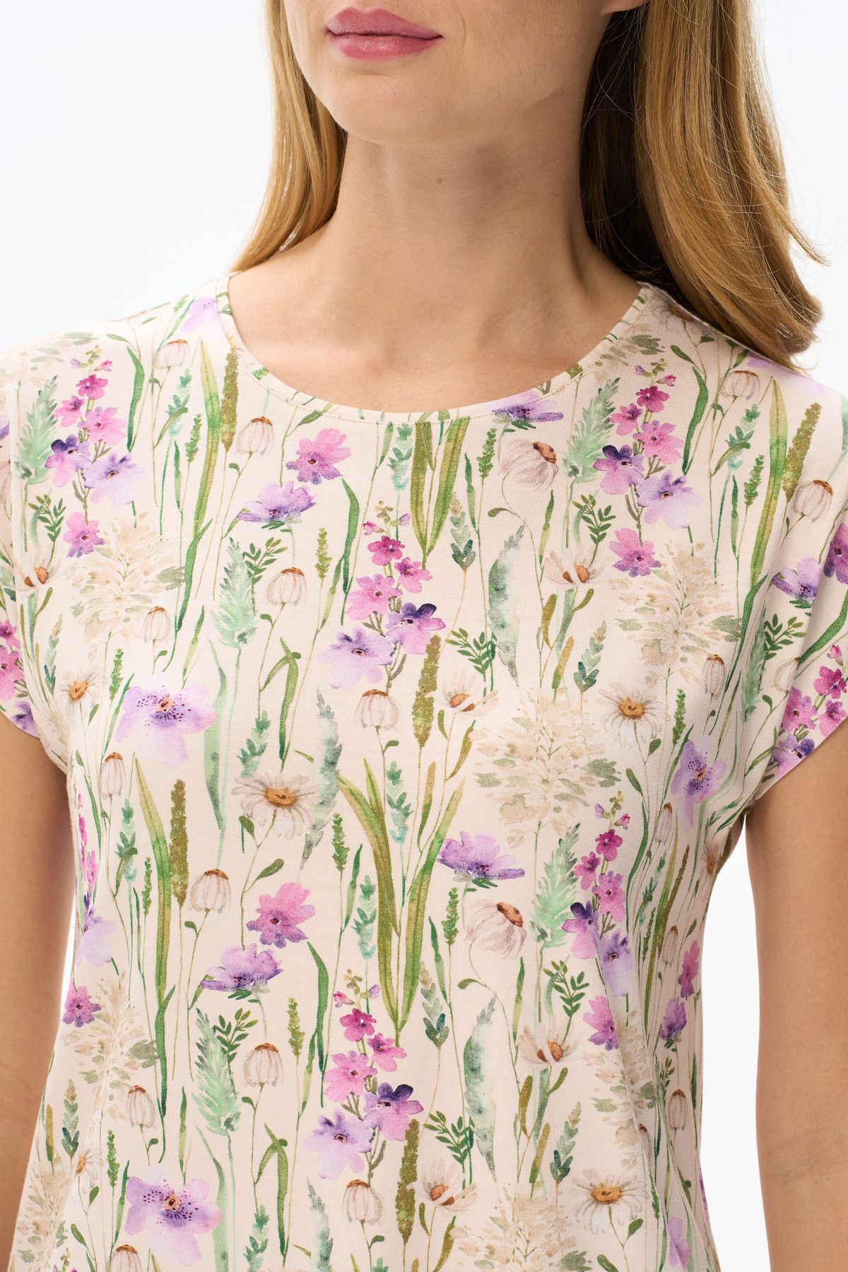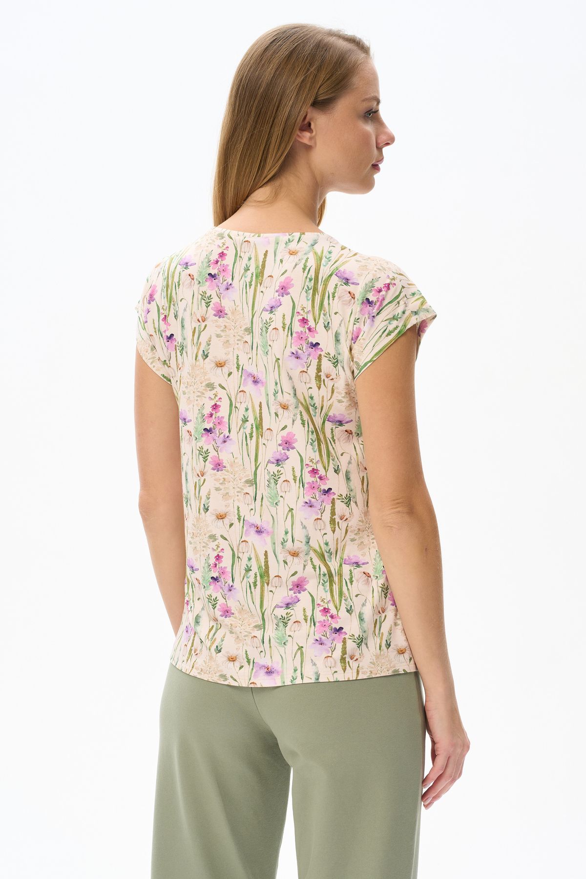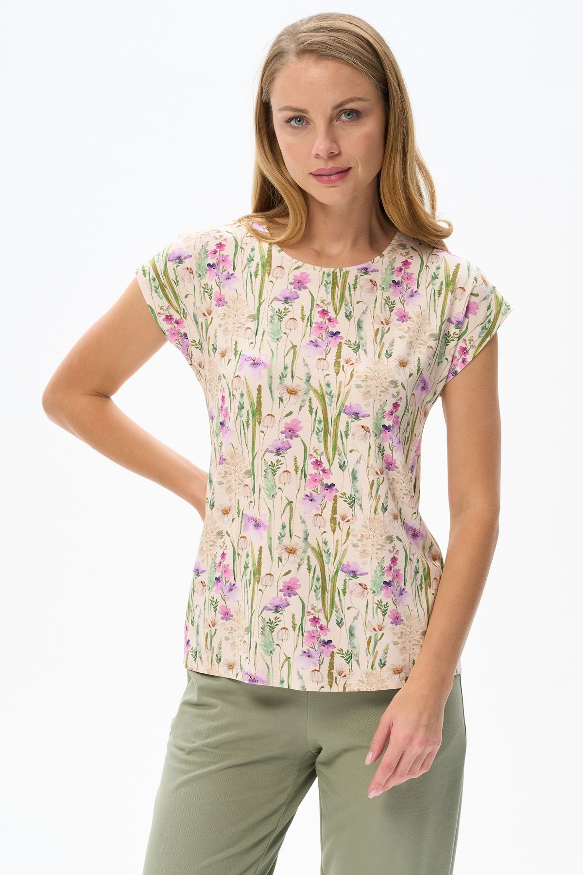 Блузка прямого силуэта из вискозного трикотажного полотна с эластаном. Круглый вырез горловины, цельнокроеные короткие рукава. Рост модели на фото 175 см.