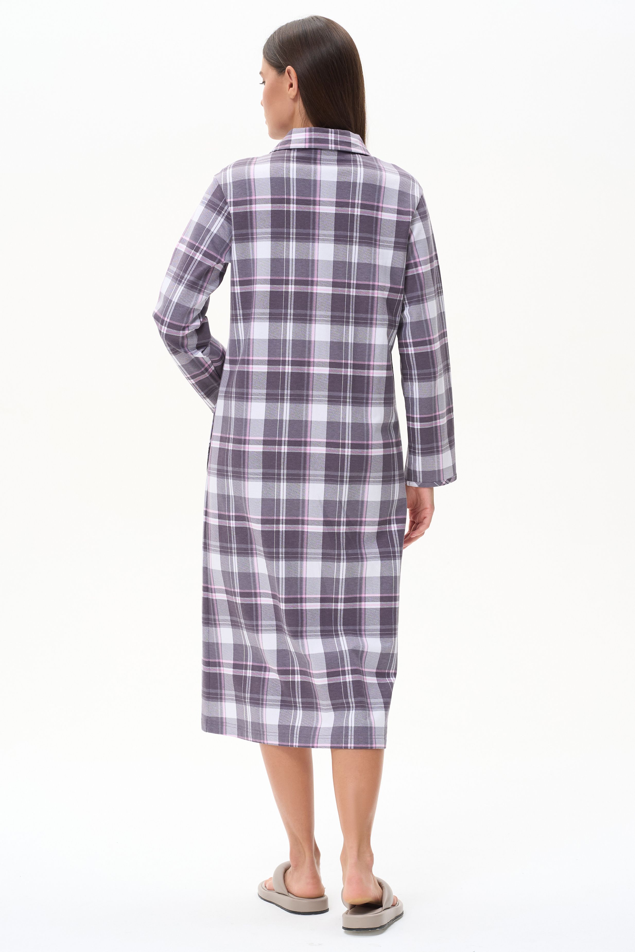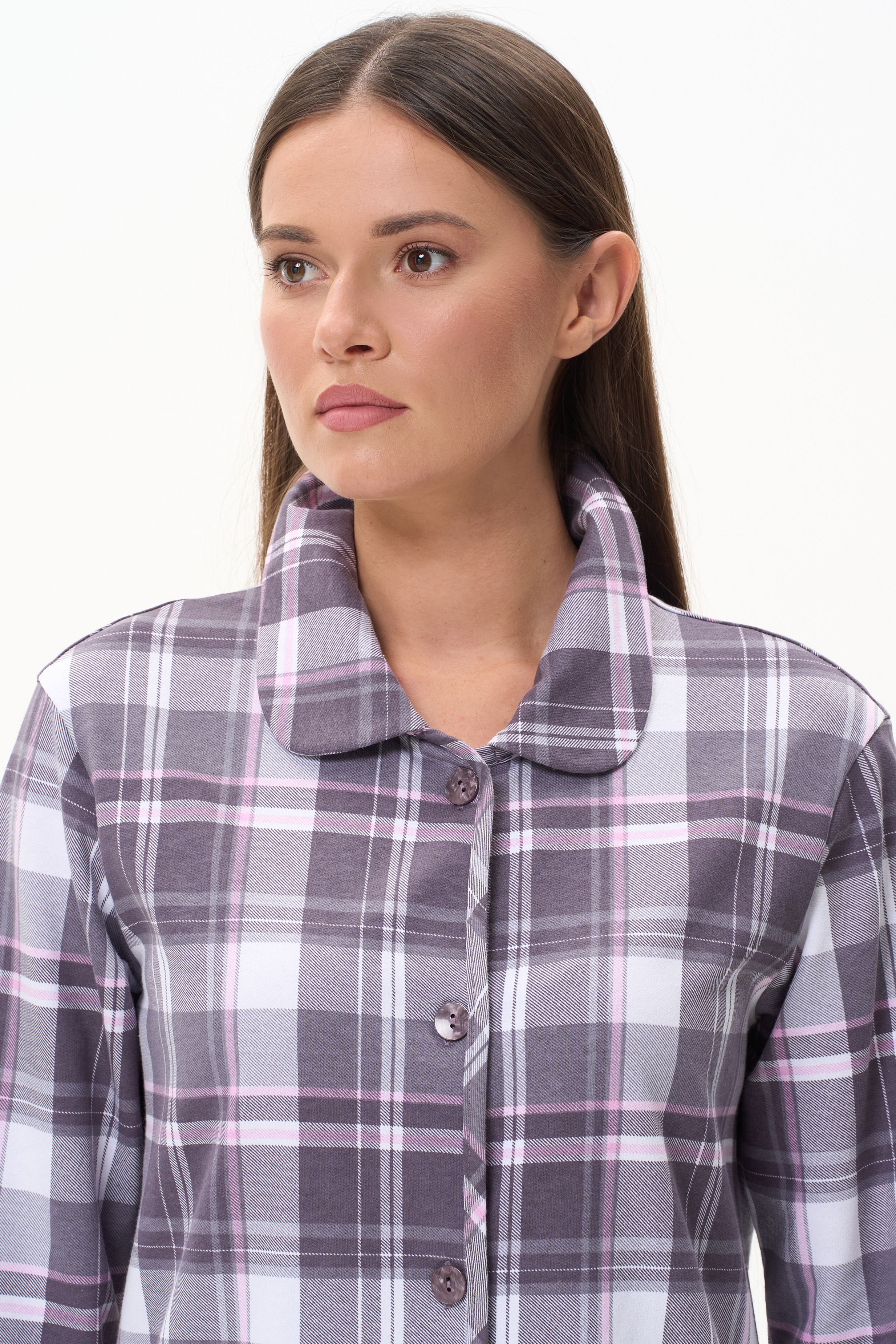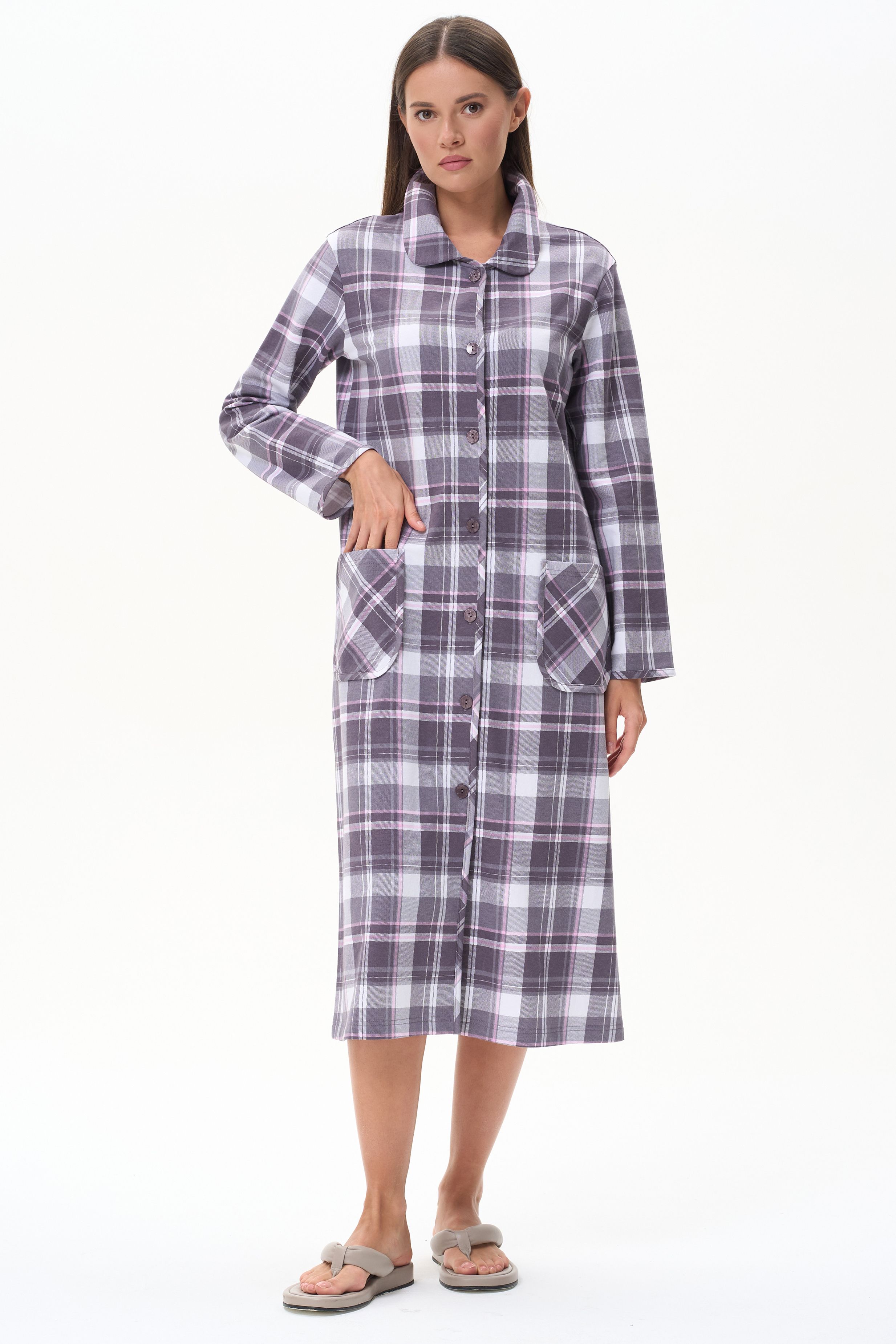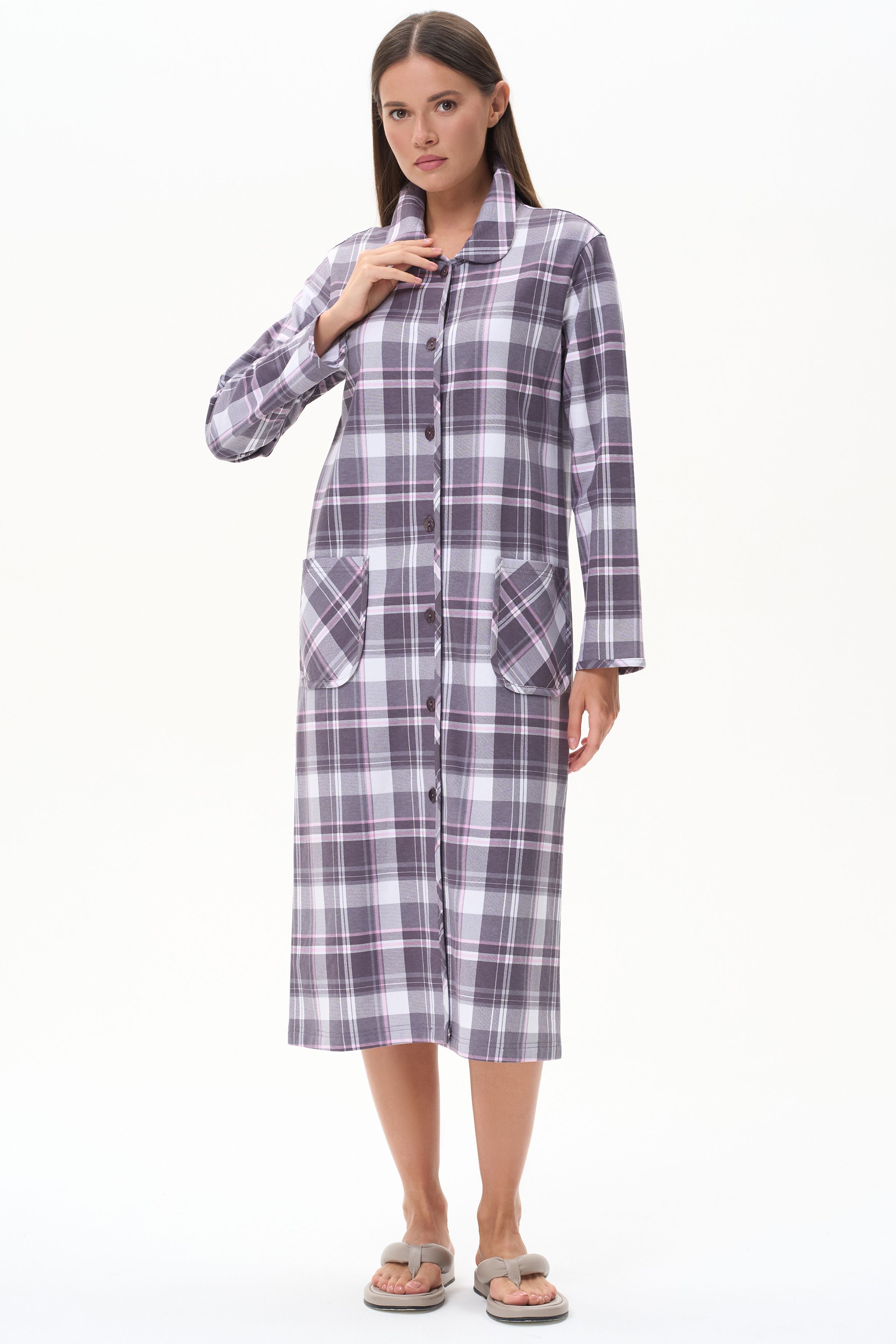 Описание: Тёплый халат из хлопкового трикотажного футера с начёсом. Элегантный отложной воротник, длинные втачные рукава. Застёжка на пуговицы, накладные карманы. Длина изделия ниже колена. Рост модели на фото 178 см.