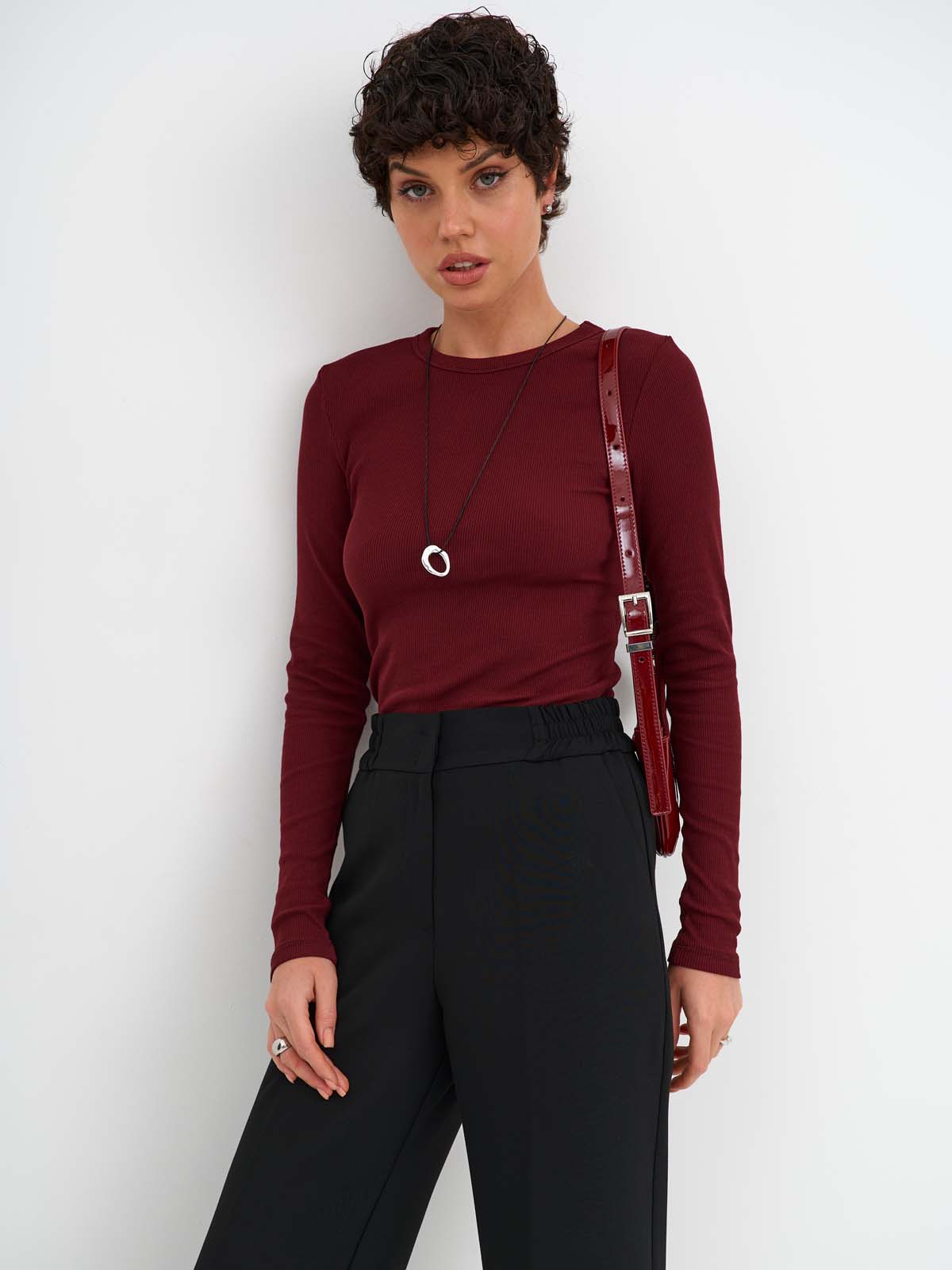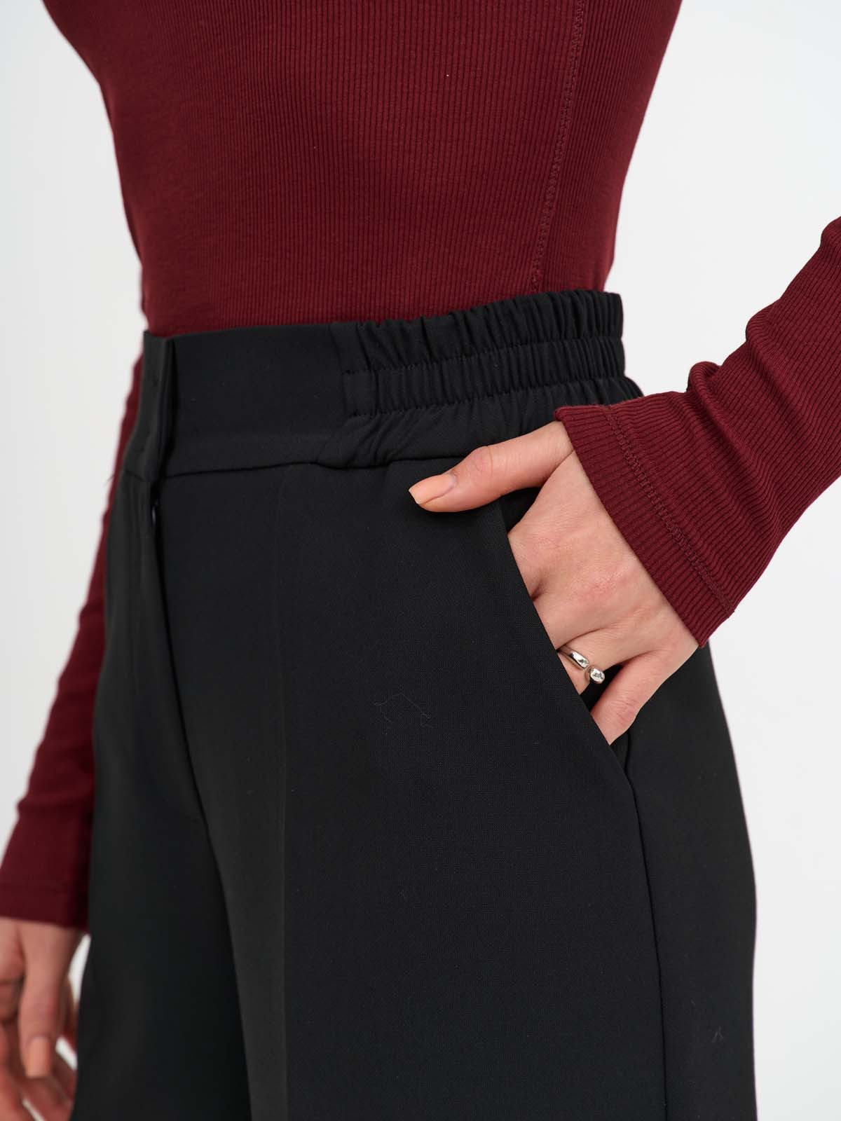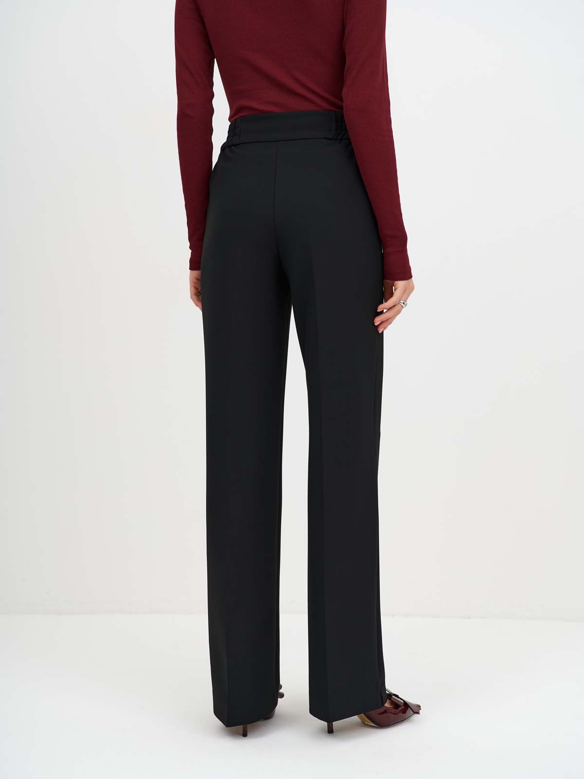Прямые брюки со стрелками помогут в создании официальных образов. Модель с высокой посадкой сшили из плотной фактурной ткани, которая хорошо держит форму. Притачной пояс надежно фиксируется на талии, или дополнительно стилизуйте его с ремнем.