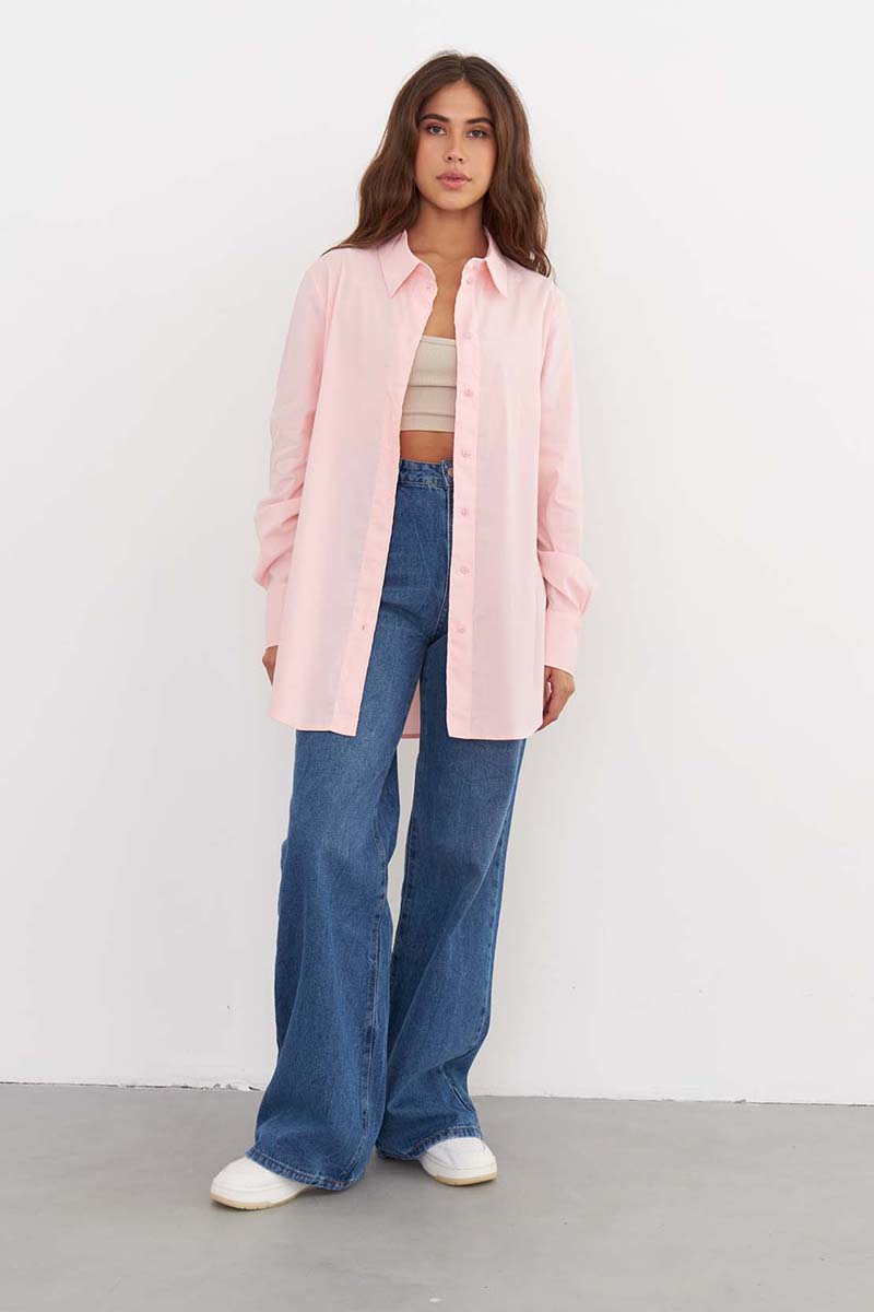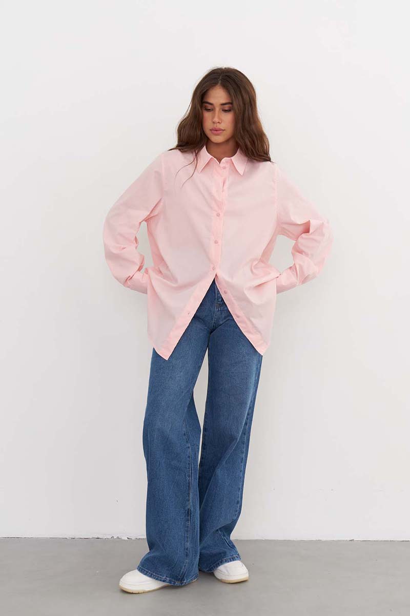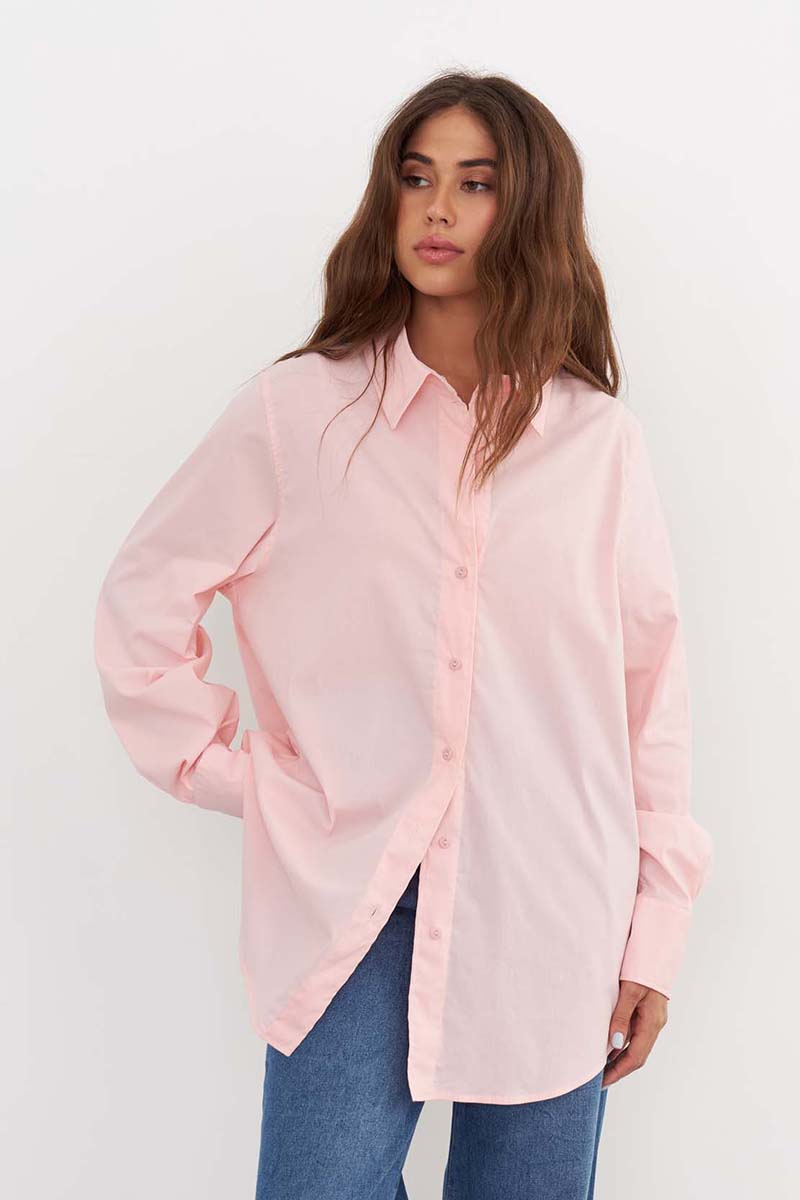 Качественная женская рубашка из хлопка свободного кроя, светло-розового цвета, с кокеткой на спине, и разрезами по бокам. Рубашка подходит как для офиса, так и для повседневных образов. Рубашку можно носить как блузку, а можно носить как второй слой поверх футболки или топа. Сделано в России на собственном производстве.