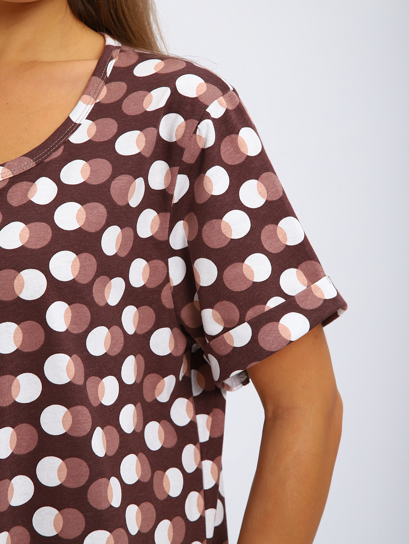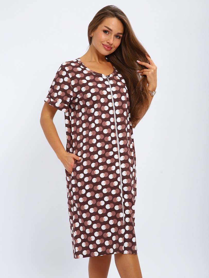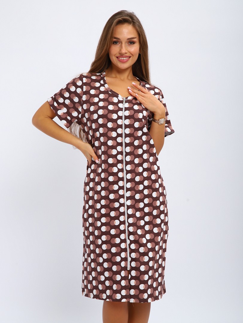 Халат женский выполнен из трикотажного полотна кулирка. халат свободного силуэта, втачной короткий рукав, горловина окантована, карманы в боковых швах, застежка на молнию.