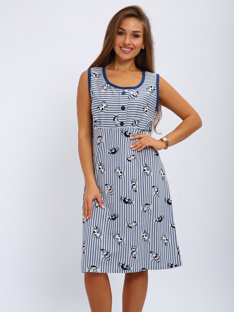 Ночная сорочка выполнена из трикотажного полотна кулирка. Ночная сорочка полуприлегающего силуэта, подрез под грудь, имитация застежки до подреза обработана планками ткань- компаньон.