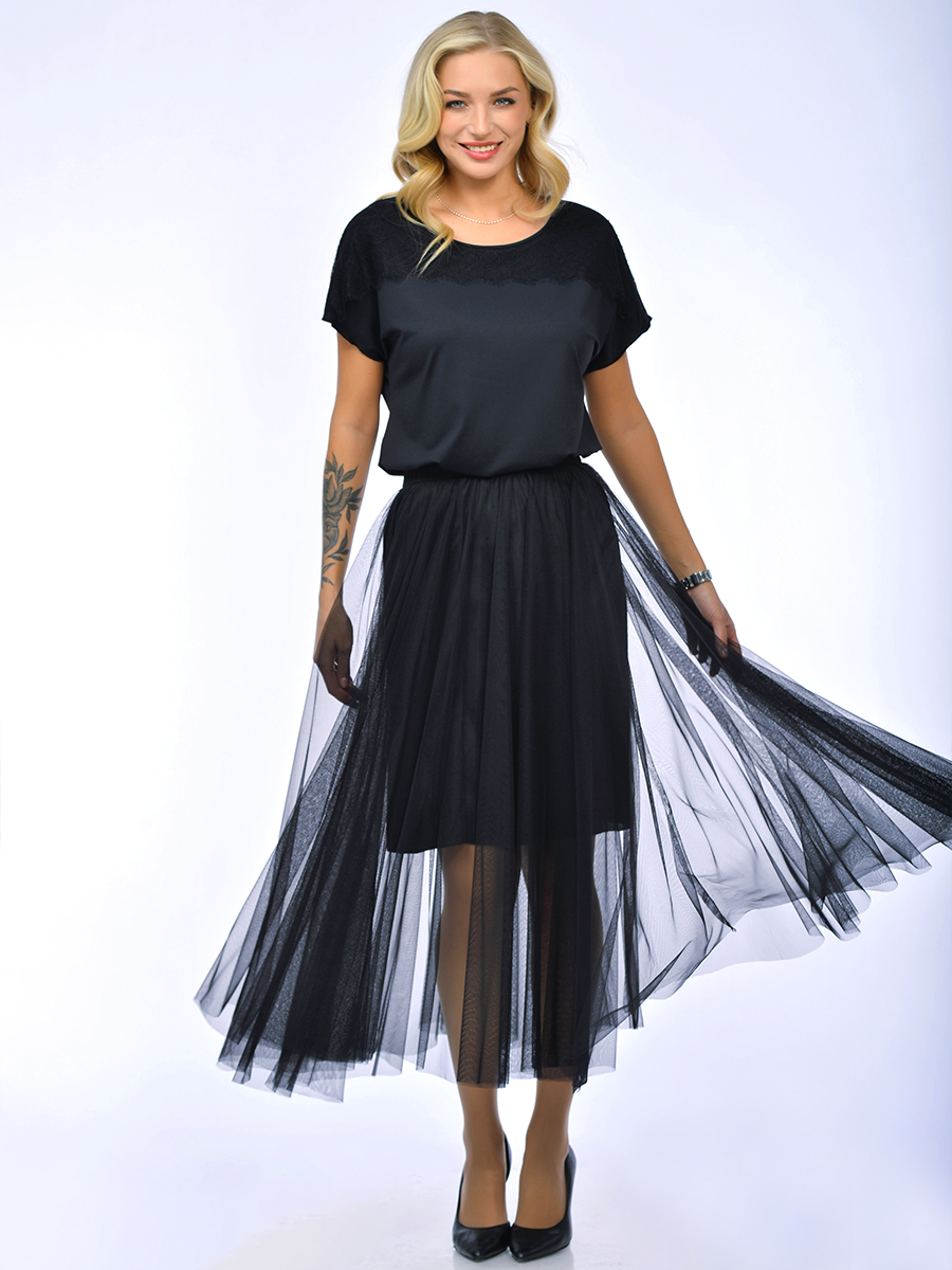 Элегантная женская блузка из плотного струящегося полиамидного трикотажа со спущенной линией плеча украшена кружевом «ресничка». По низу рукавов и по нижнему краю изделия выполнена закрутка, которая подчеркивает плавные линии силуэта. Кружевная