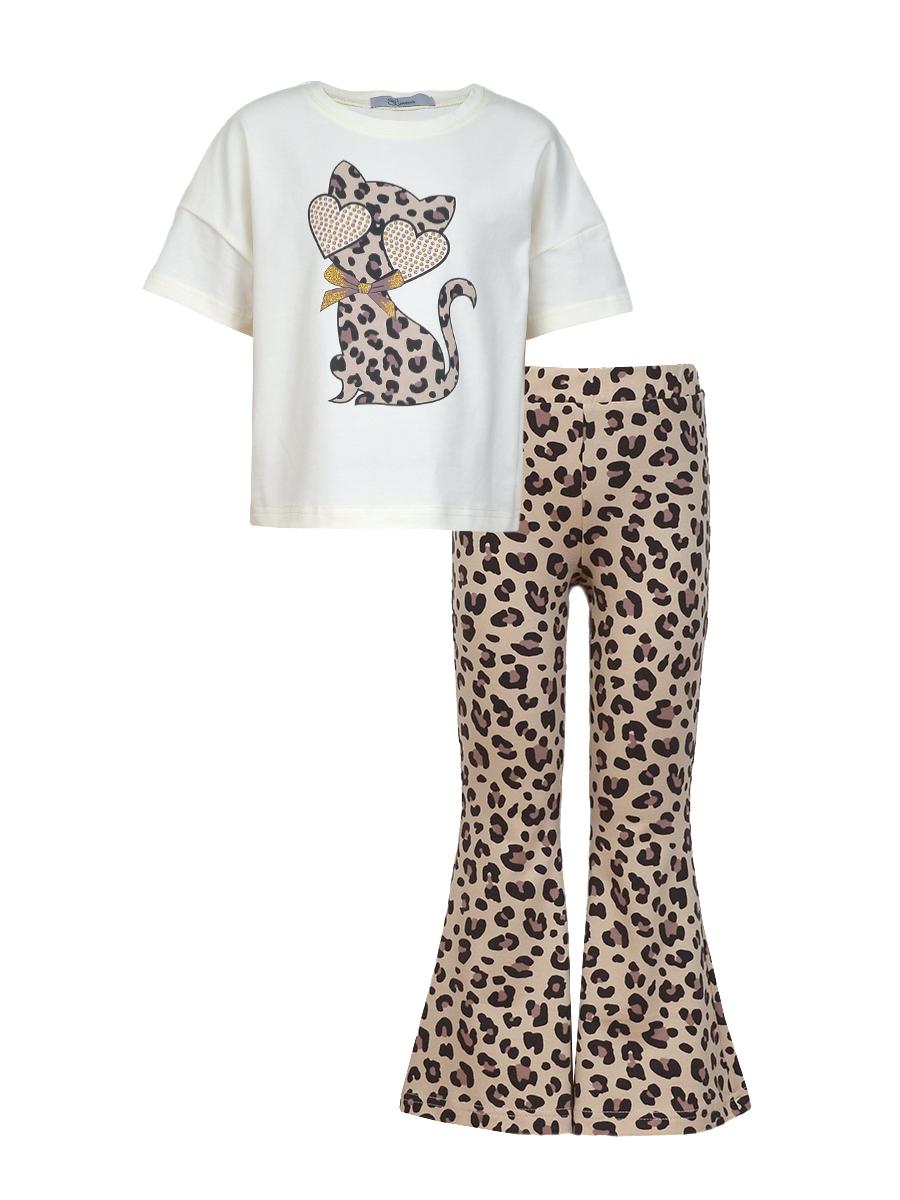Джемпер (оверсайз)-спущенное плечо, короткий рукав. Горловина обработана планкой. Печать на переде. Брюки-на поясе с резинкой, расширены к низу.