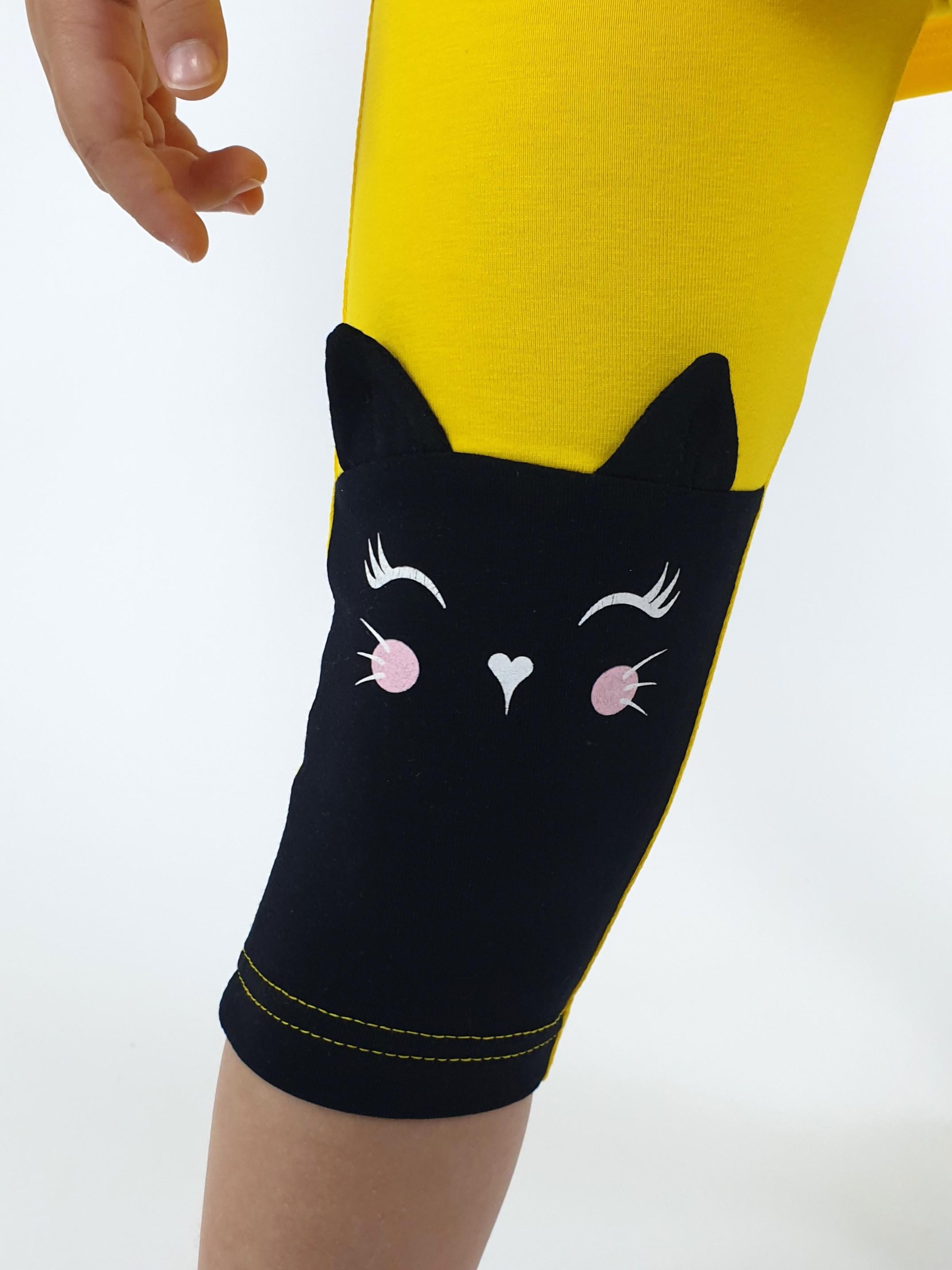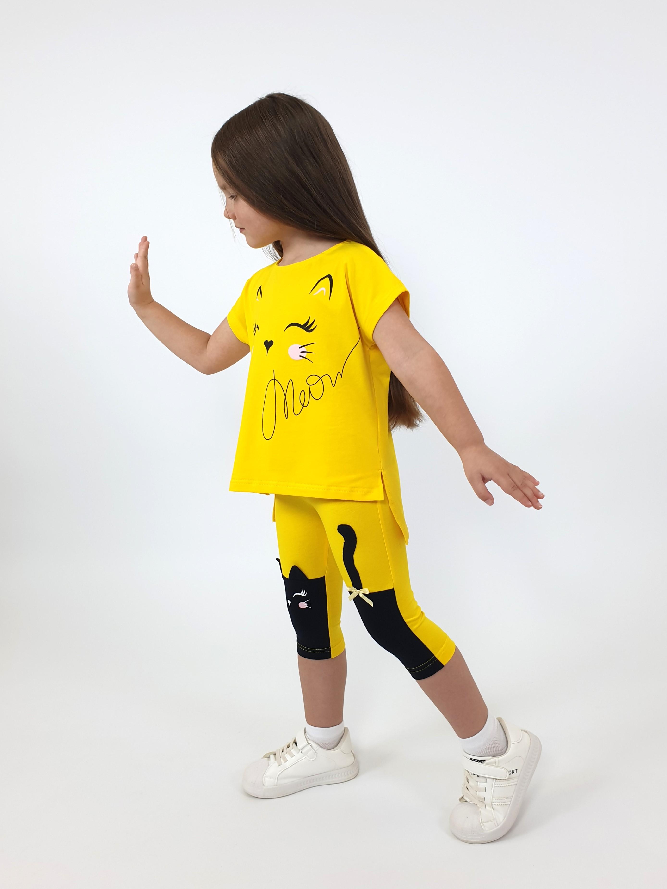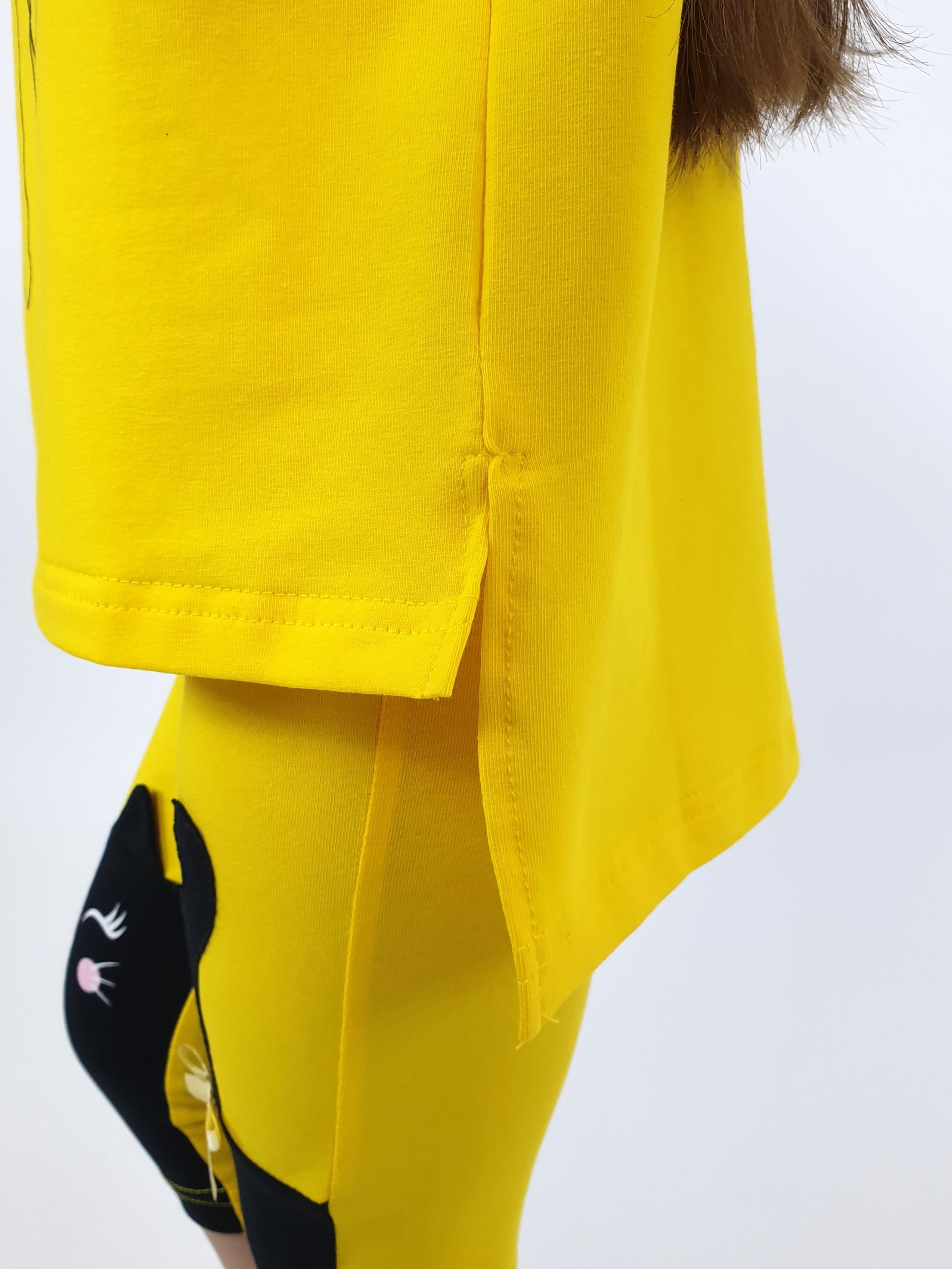 Фуфайка-прямой силуэт, удлиненная спинка с разрезами, перед с печатью. Спущенное плечо, горловина окантована и подшита. Лосины-укороченные, передние половинки с подрезами. Вышивка-аппликация слева, печать на правой передней стороне. Отделочный бантик.