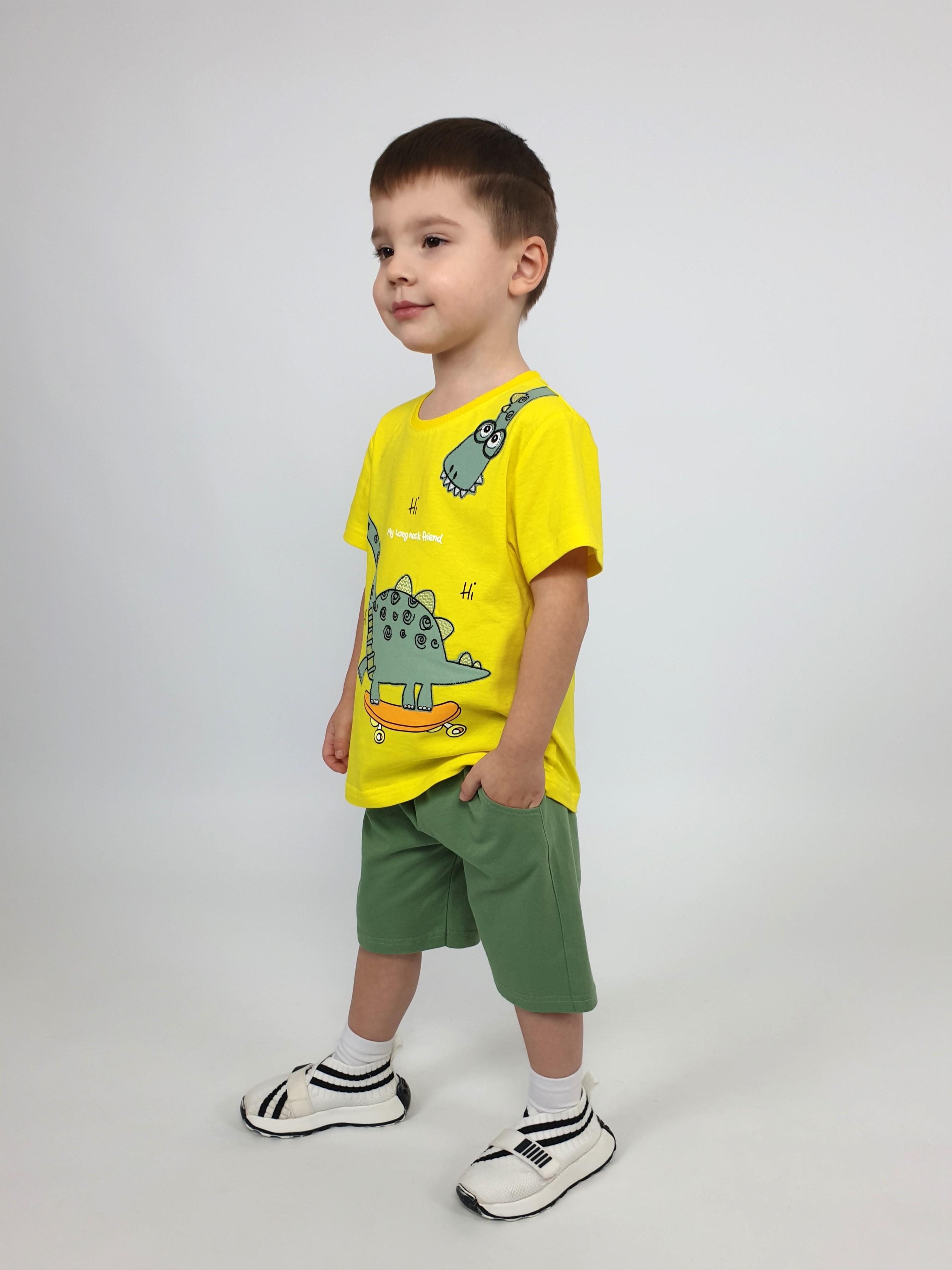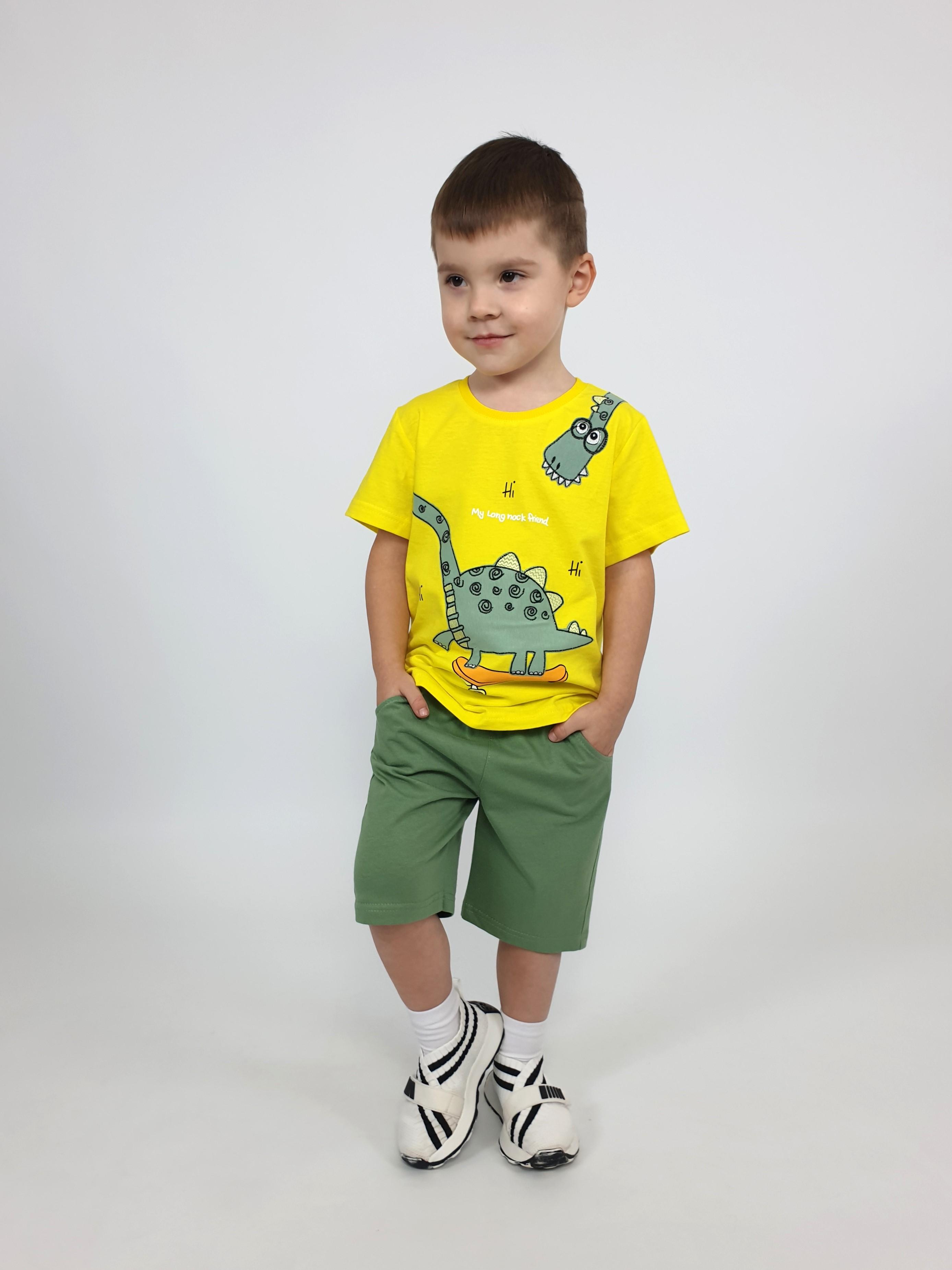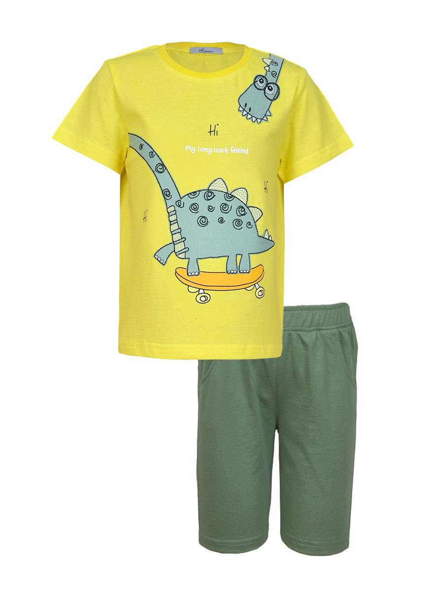 Фуфайка-прямая, перед с печатью и вышивкой. Рукав втачной, короткий. Горловина обработана ластиком. Шорты-укороченные с притачным поясом и резинкой. Два боковых кармана.