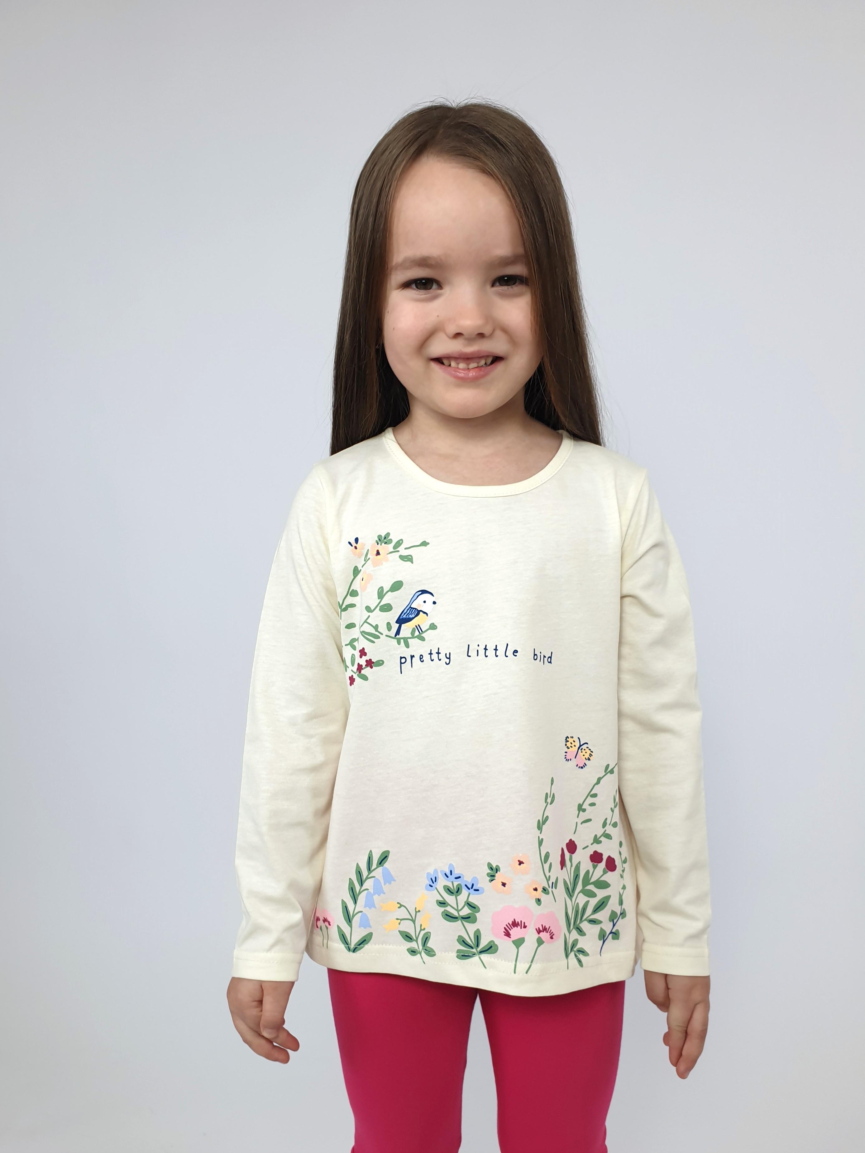 Джемпер-силуэт трапеция, удлиненная спинка со сборкой из под кокетки. Рукав втачной, длинный. Перед с печатью. Горловина окантована, застежка по спинке на кнопки. Лосины-длинные, вверху на резинке.