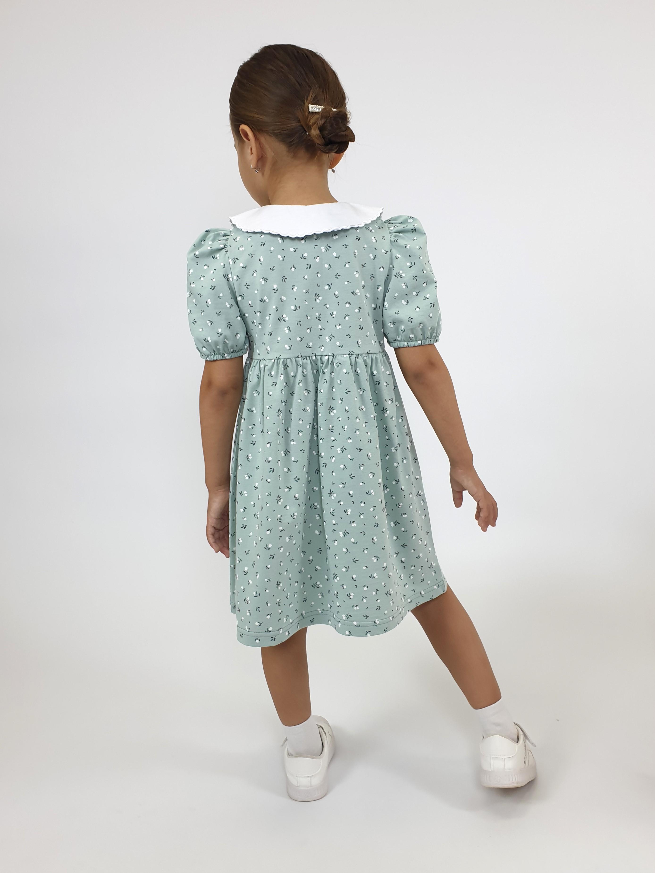 Платье-с отрезной юбкой в сборку. Короткий рукав с резинкой внизу, сборка по окату. Горловина окантована и подшита. Вышитый отделочный воротник, настрочен на окантовку. Застежка центральная на пуговицы.