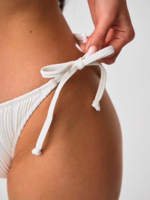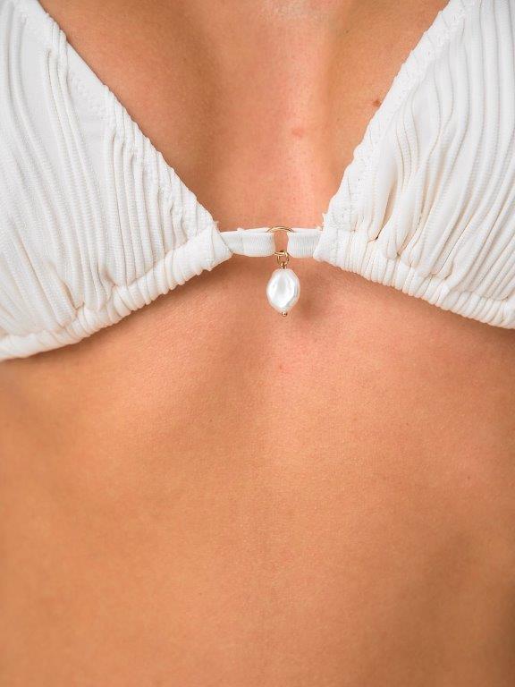 Раздельный купальник из эластичного фактурного полона, имитирующего плиссеровку, нежного молочного цвета. Мягка чашка без каркасов, без боковых корсетных вставок, со съемными вкладышами. Середина грудки украшена нежноц подвеской, в виде жемчужины. Бретели не съемные, завязываются на шее. Эластичная лента под грудью завязывается на спинке..Плавки со средней посадкой, на подкладке, с завязками по бокам.. По линии талии и вырезу ножек подгиб и плоский шов с резинкой.