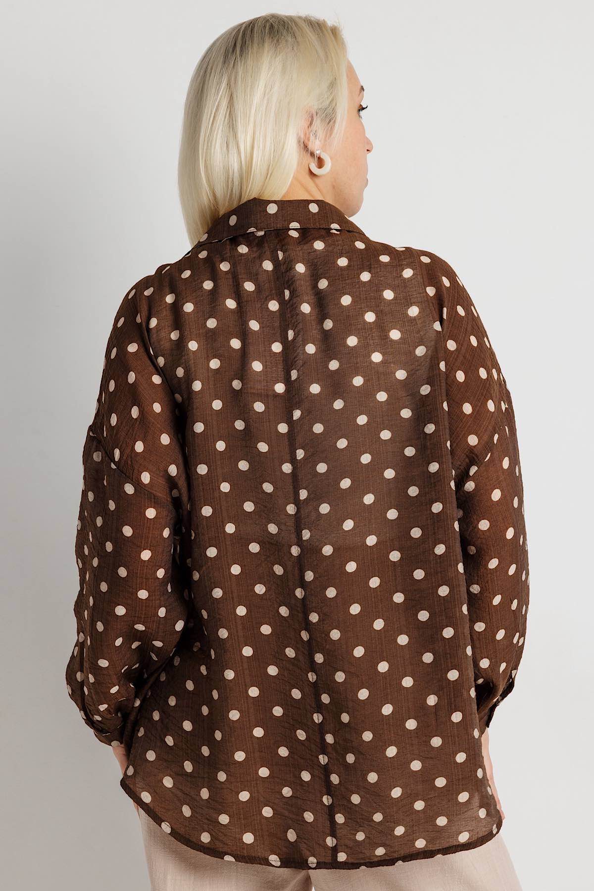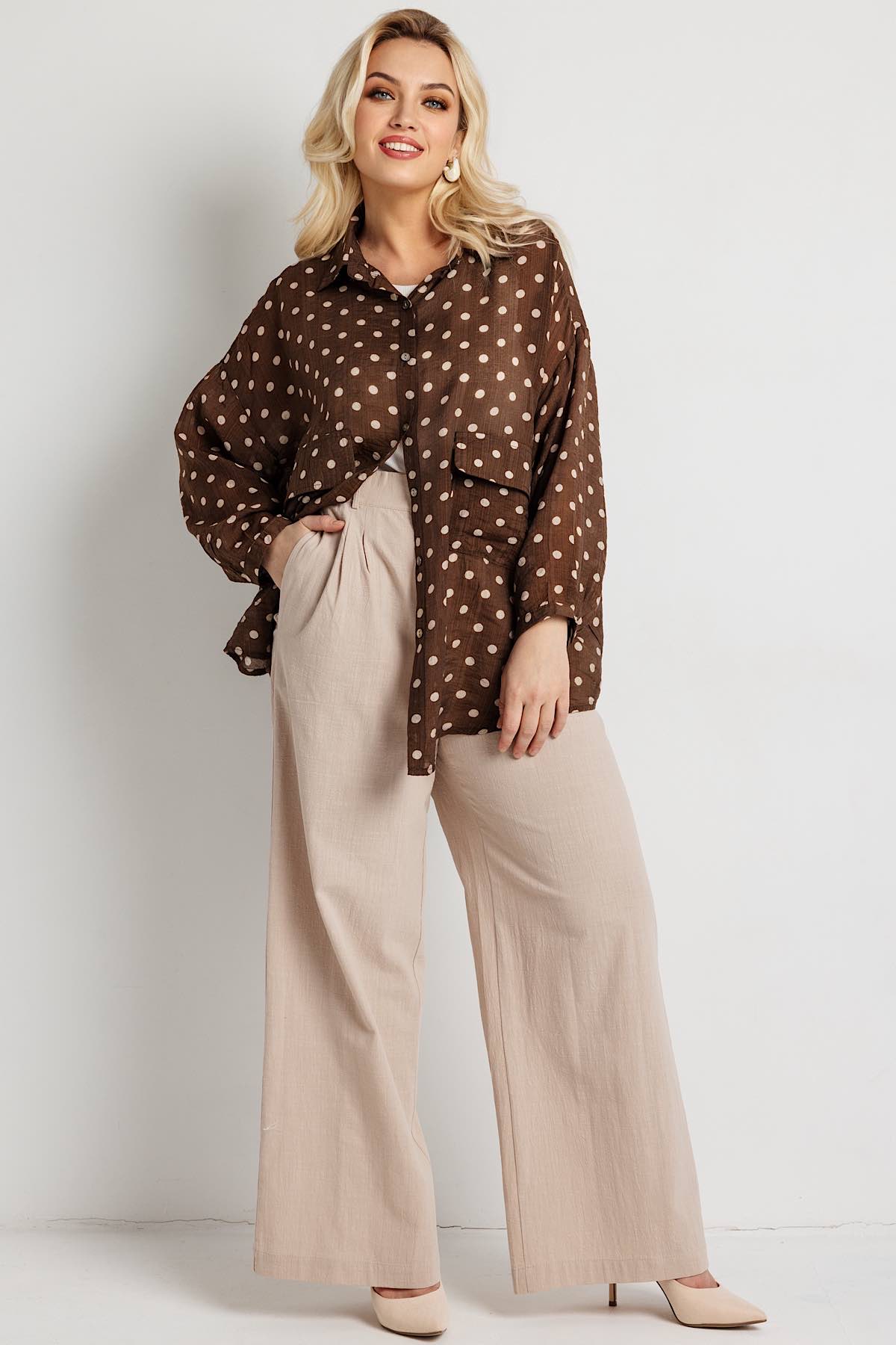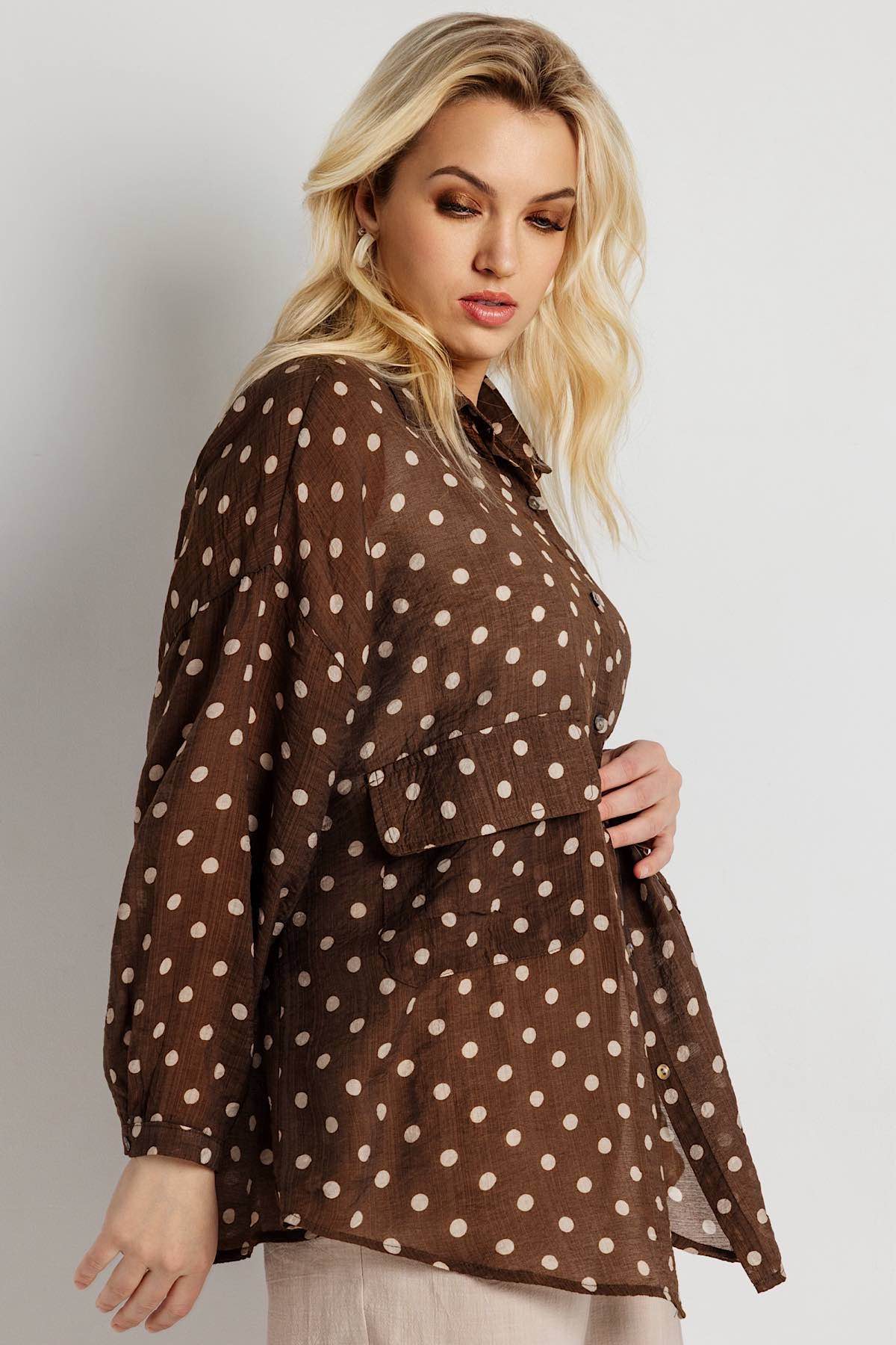 Описание: Женская блузка из летящего легкого хлопка. Рукава с манжетами на две пуговицы. Два накладных кармана с клапанами спереди, отложной воротник . Свободный крой не сковывает движений.