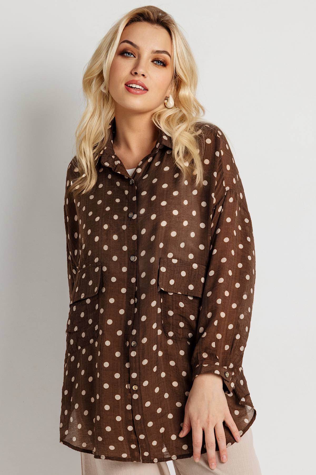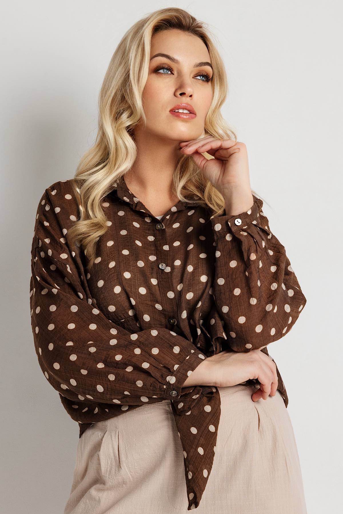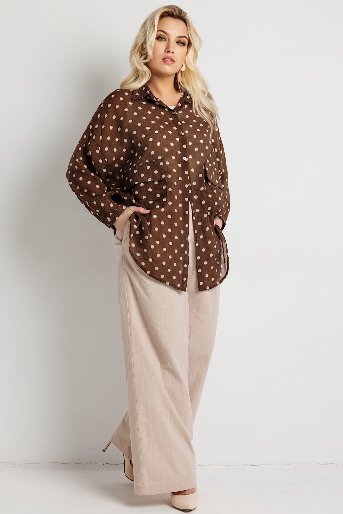 Описание: Женская блузка из летящего легкого хлопка. Рукава с манжетами на две пуговицы. Два накладных кармана с клапанами спереди, отложной воротник . Свободный крой не сковывает движений.
